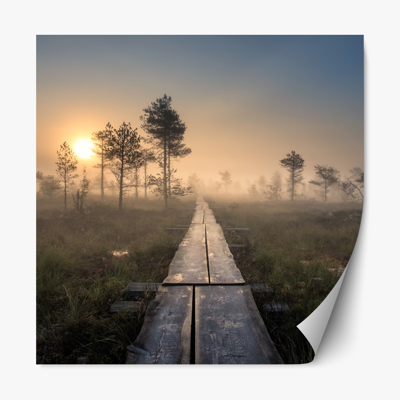 Repositionierbarer Aufkleber Nebliger sonnenaufgang über dem holzsteg