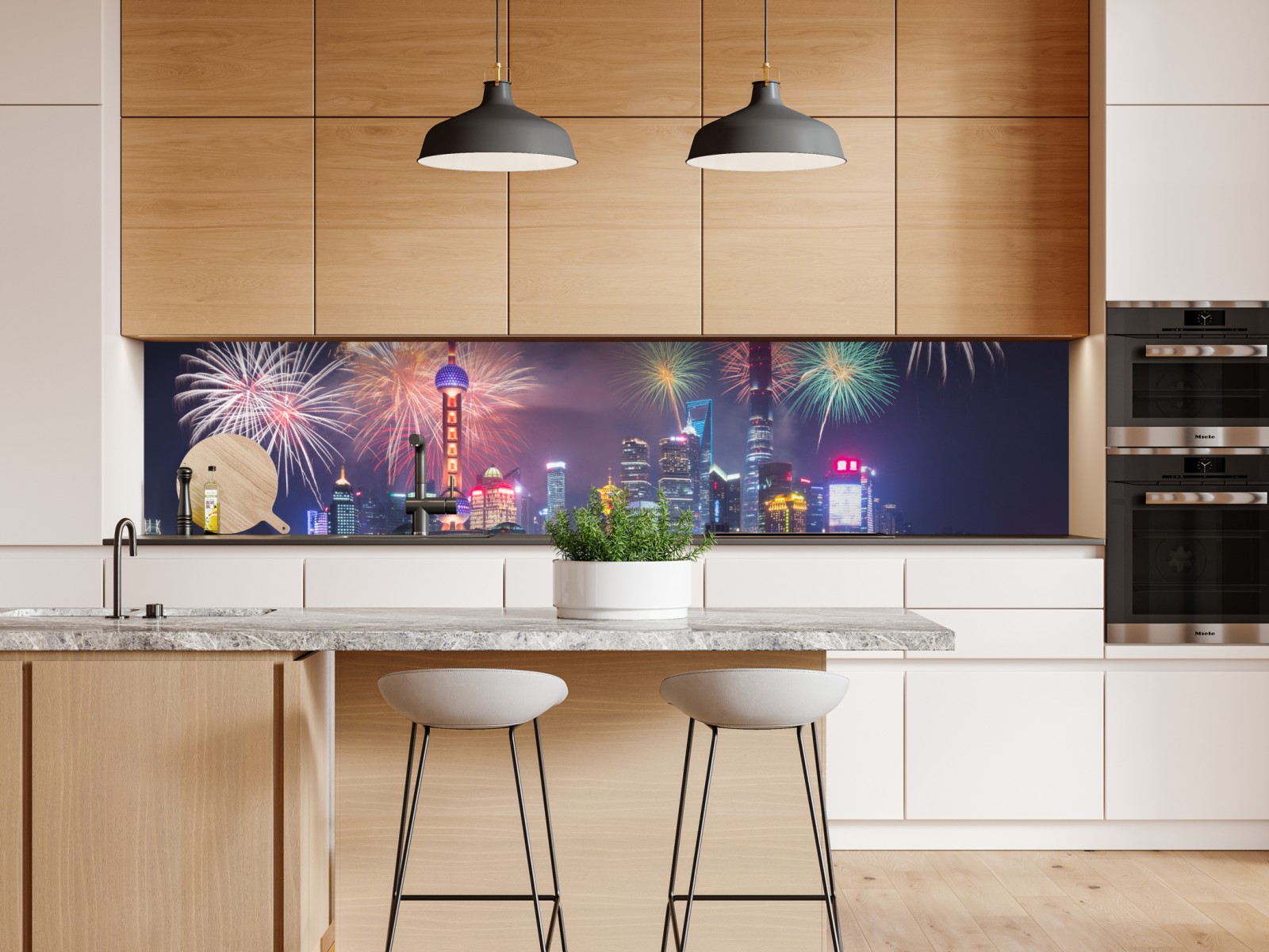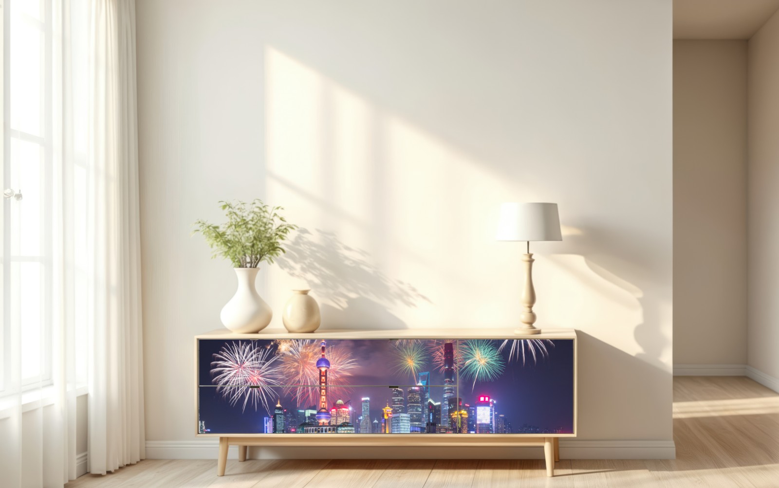 Repositionierbarer Aufkleber Shanghai skyline mit feuerwerk über dem Huangpu