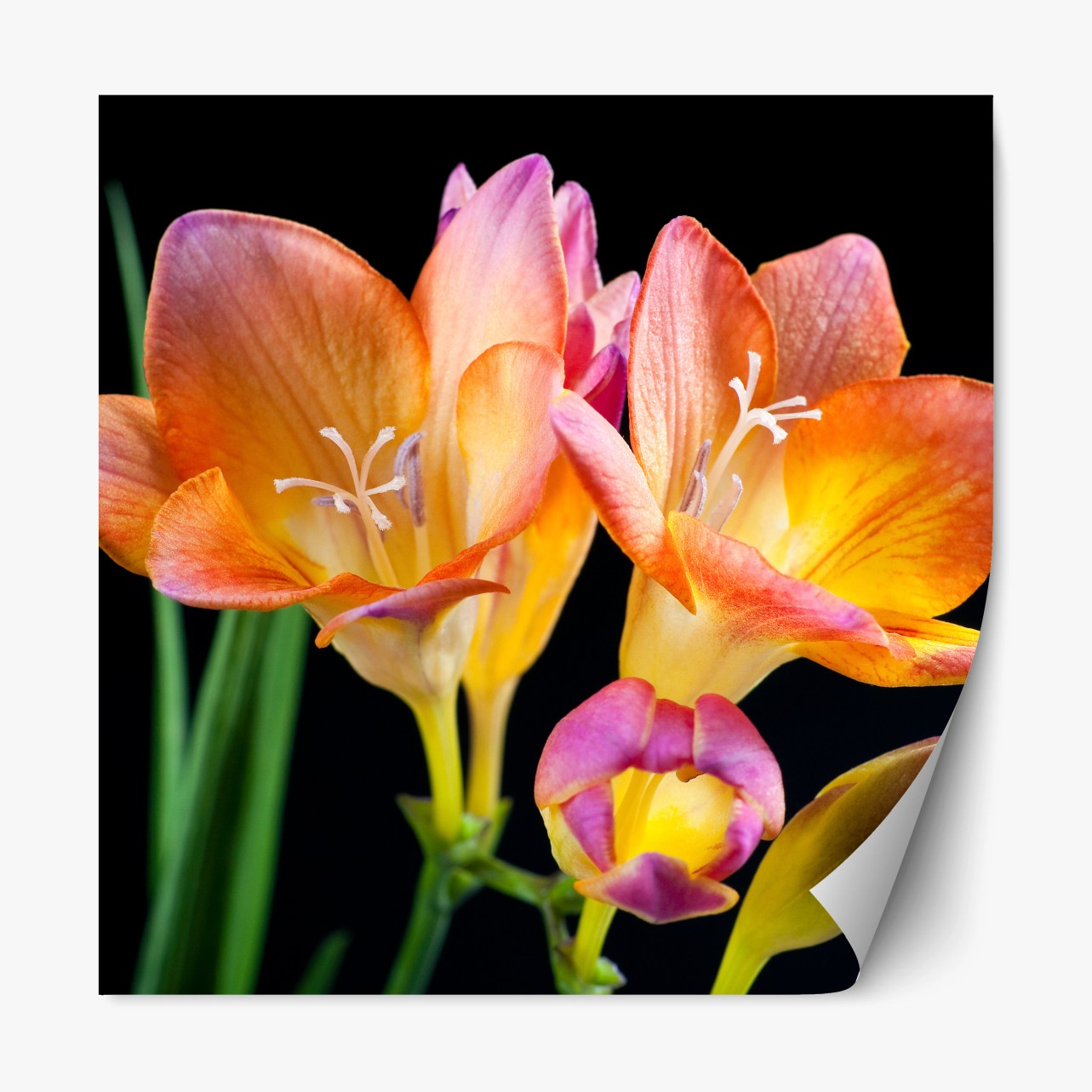 Repositionierbarer Aufkleber Leuchtende orange freesien vor schwarzem hintergrund