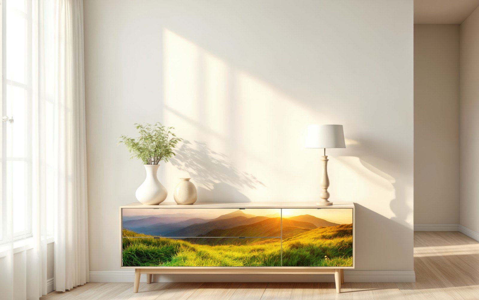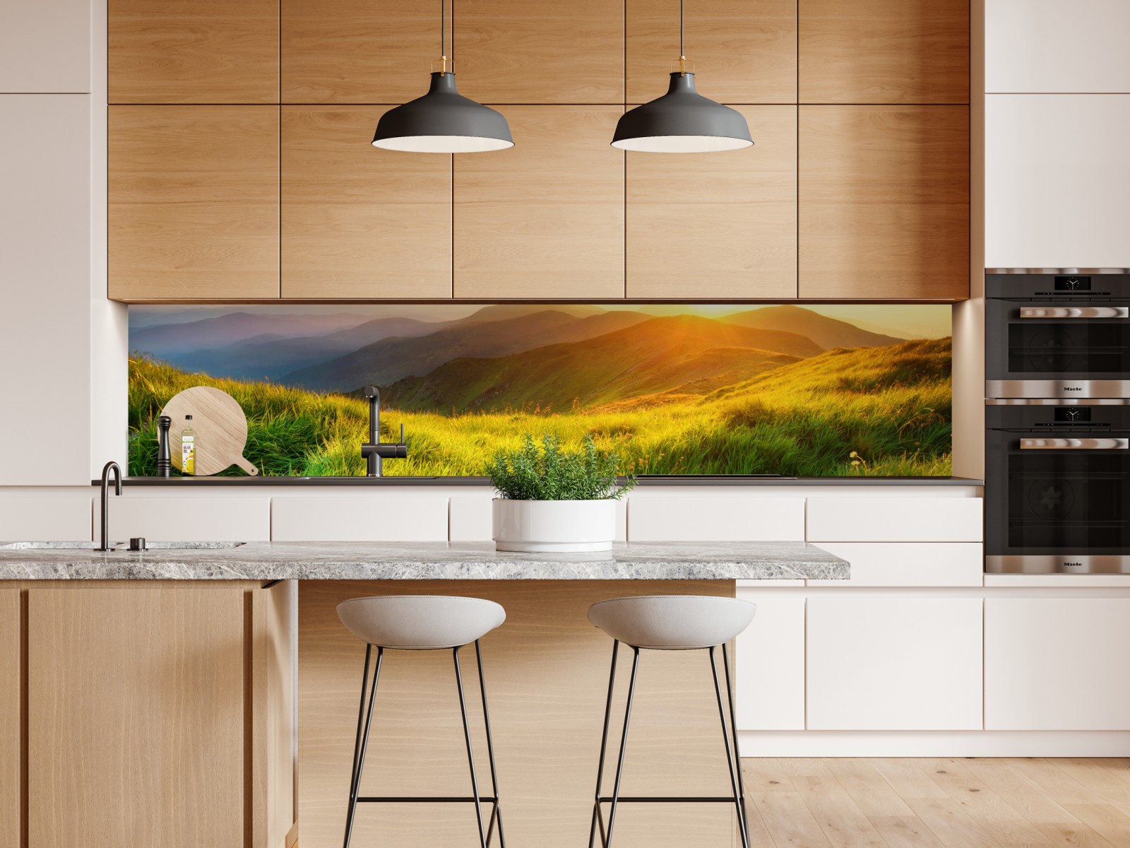 Repositionierbarer Aufkleber Sonnige bergwiese bei sonnenaufgang