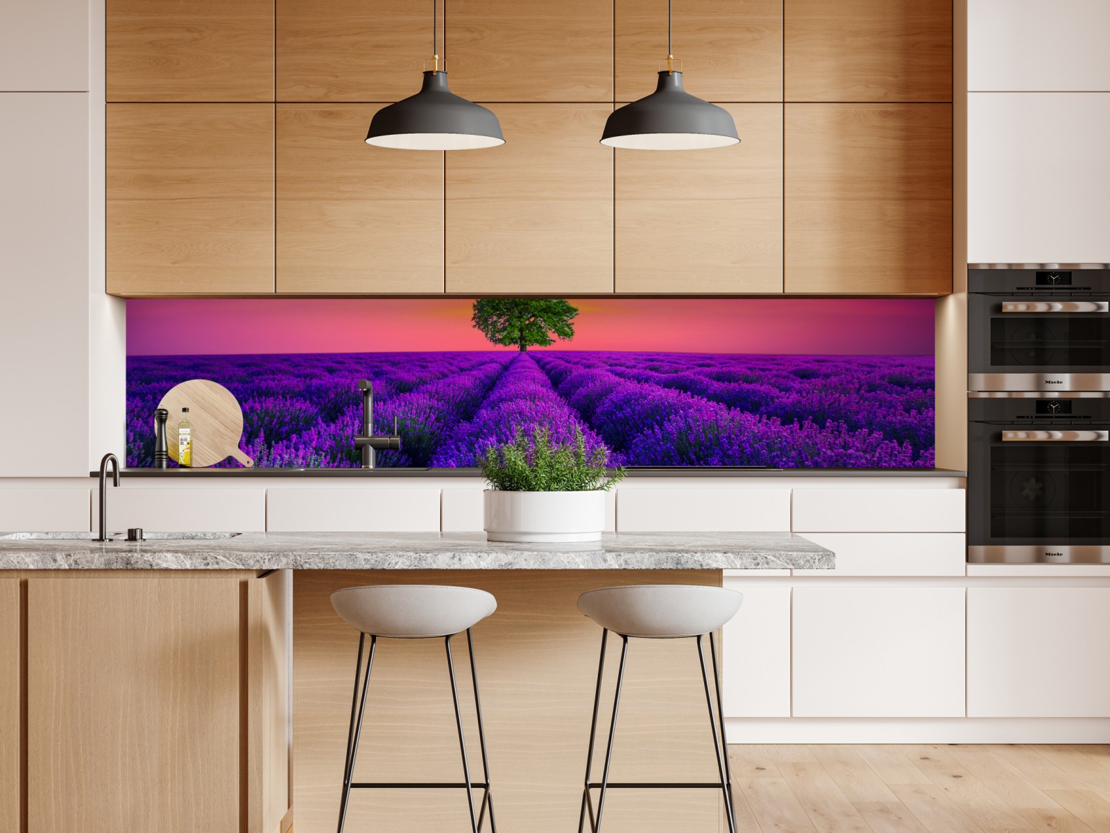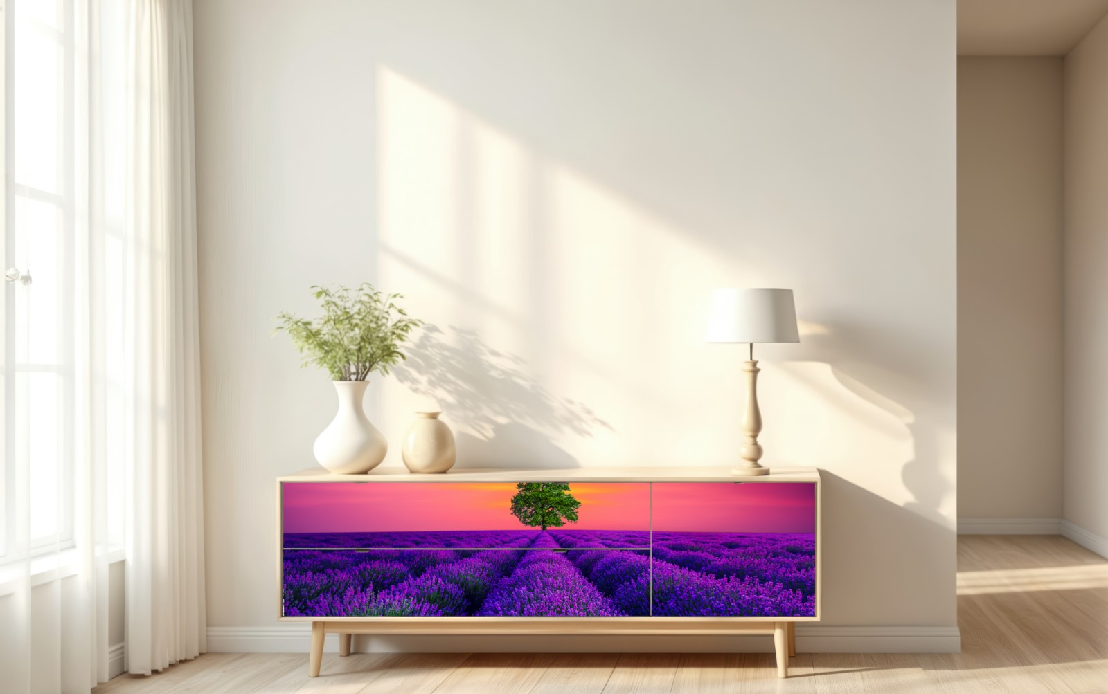 Repositionierbarer Aufkleber Lavendelfeld bei sonnenuntergang mit einsamem baum