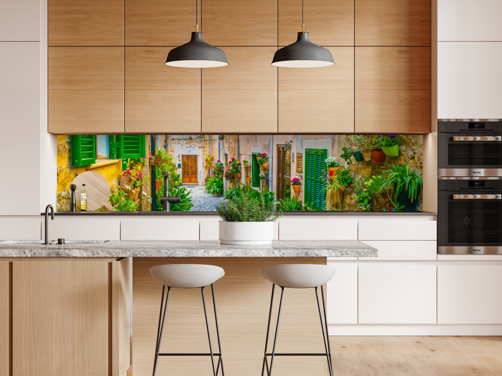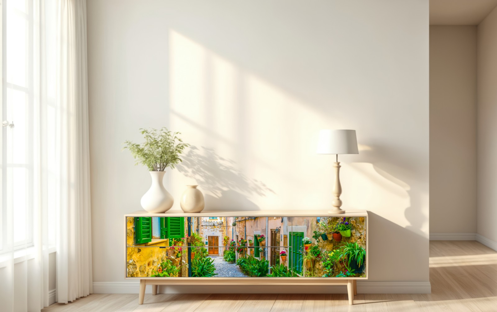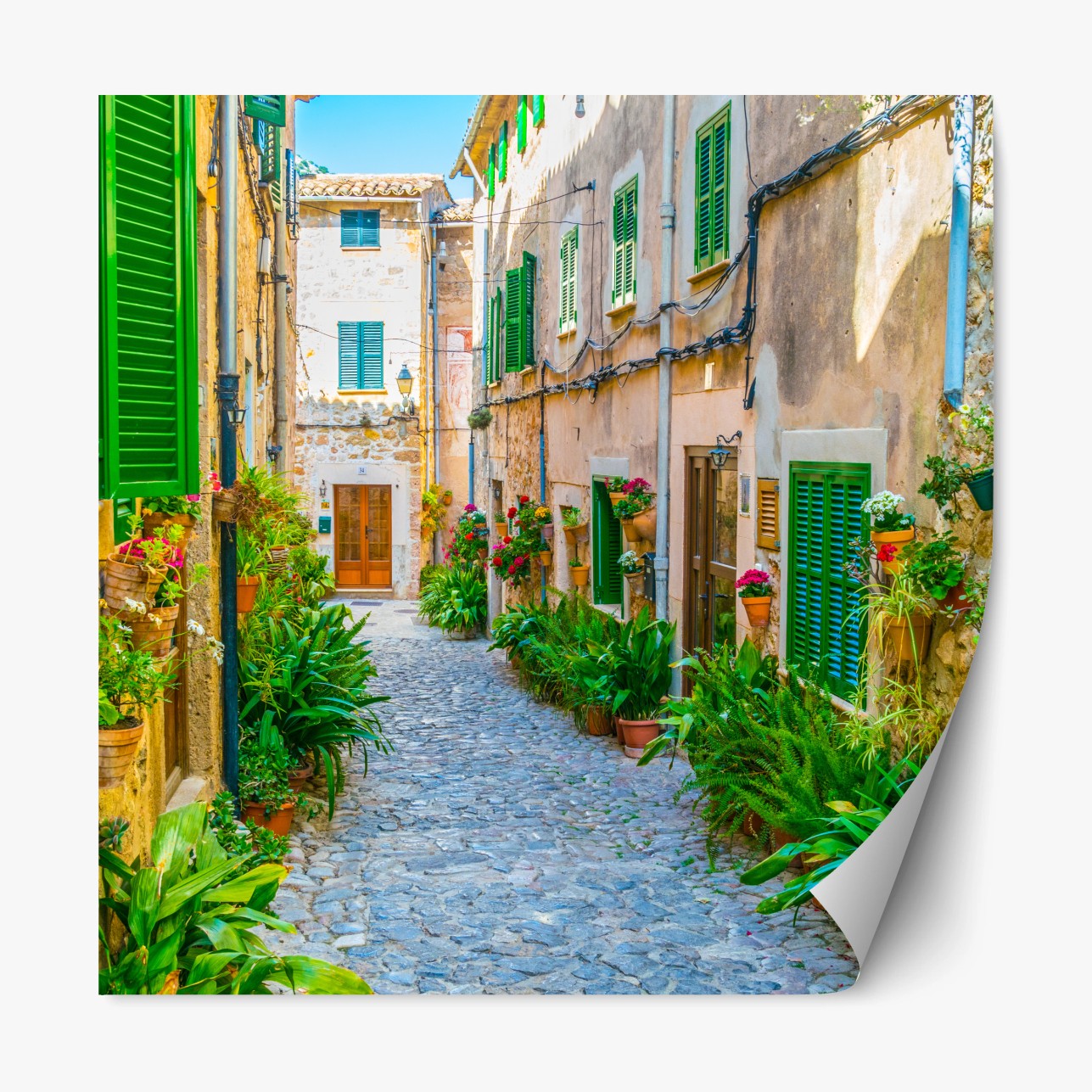 Repositionierbarer Aufkleber Sonnige gasse mit grünen fensterläden