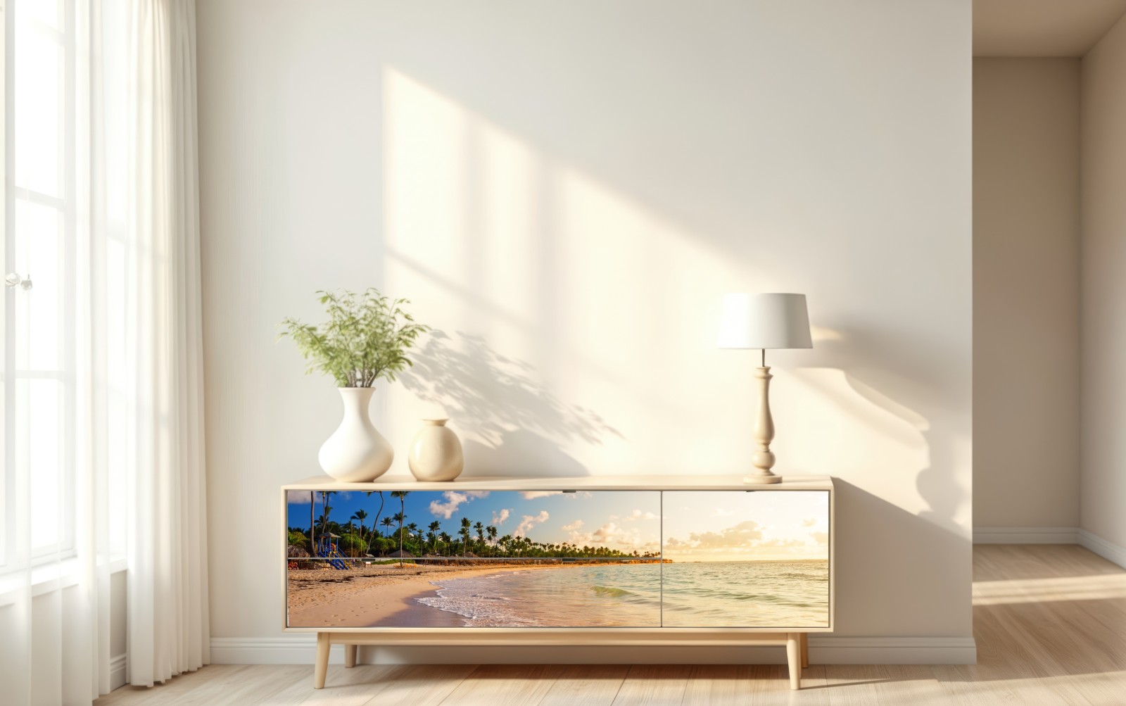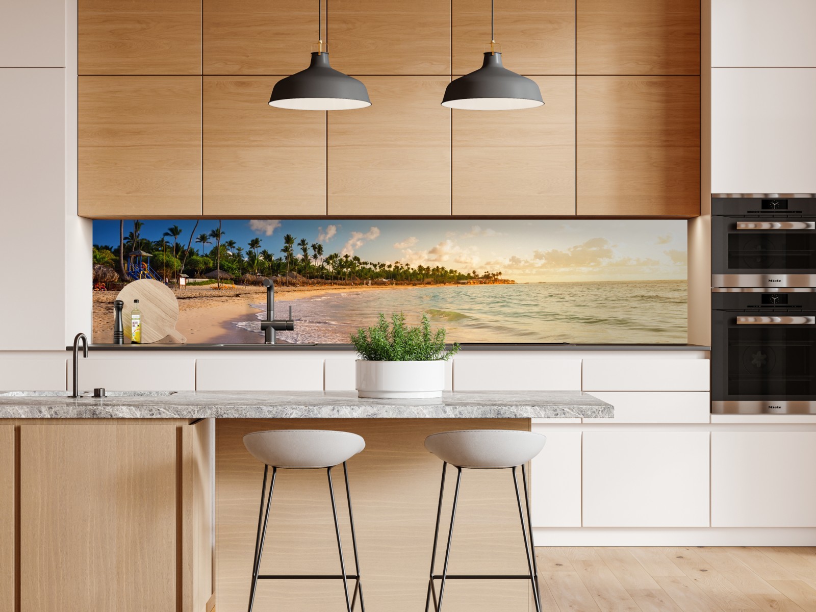 Repositionierbarer Aufkleber Tropischer sonnenuntergang am strand mit palmensilhouetten