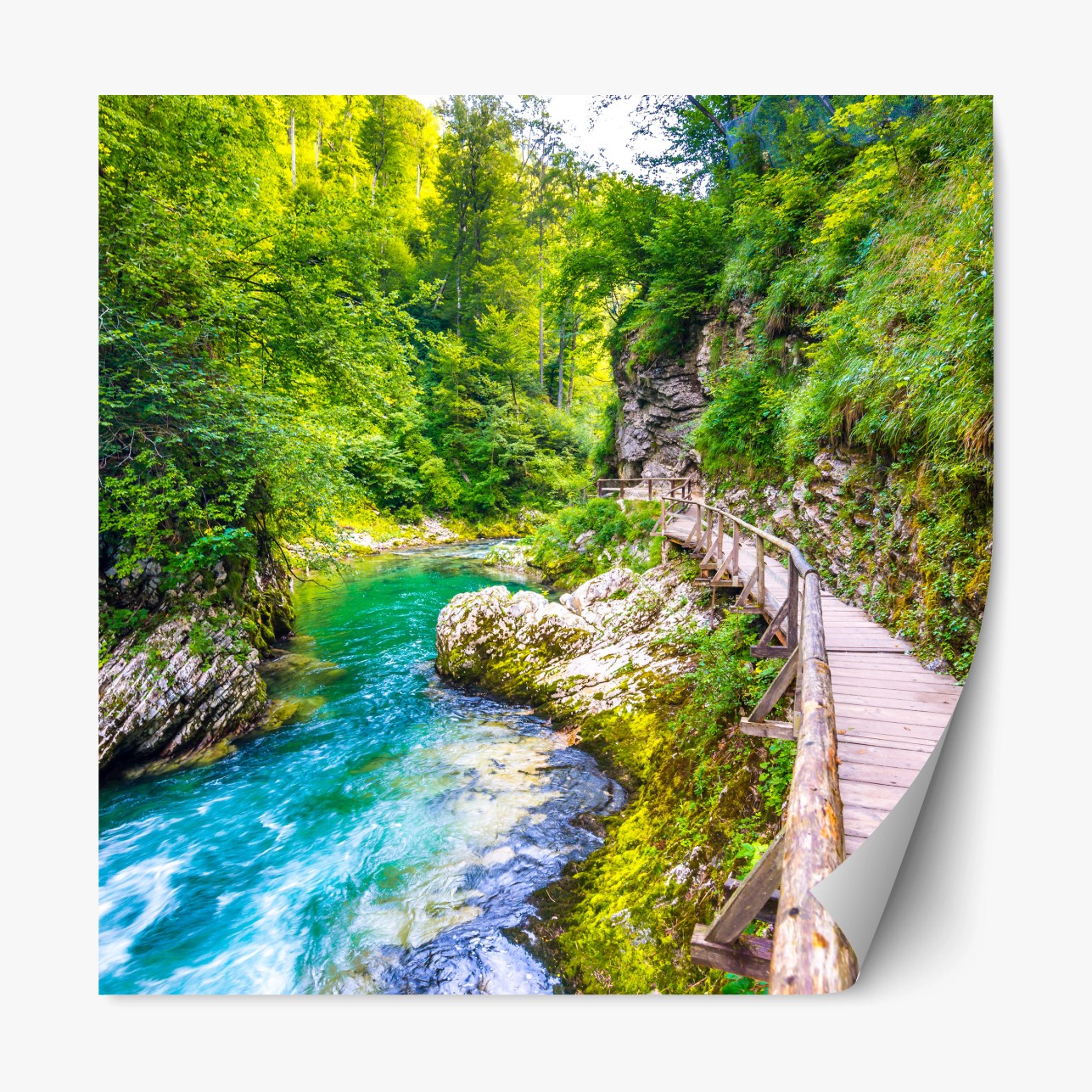 Repositionierbarer Aufkleber Türkisfarbener fluss und holzsteg im wald
