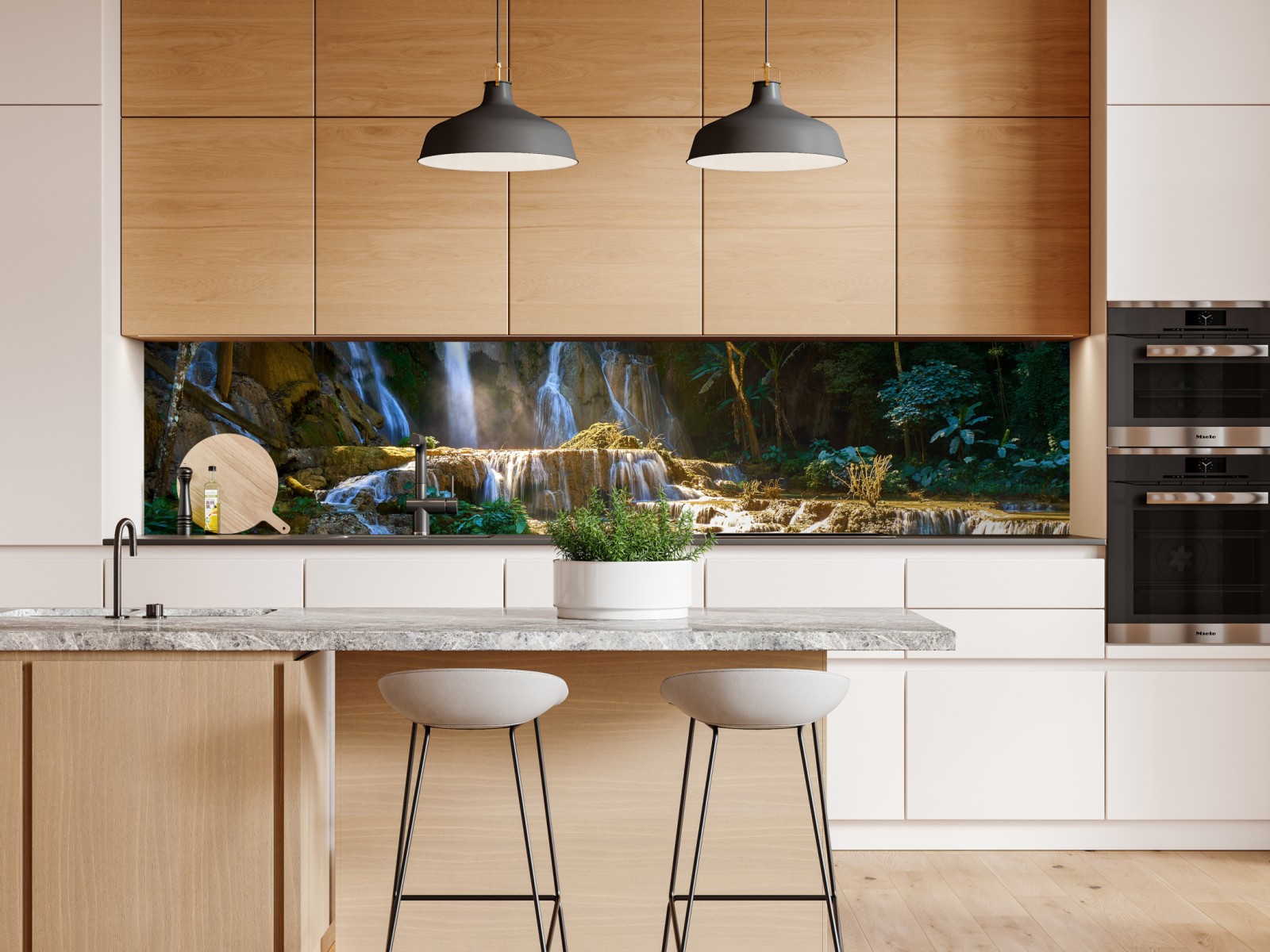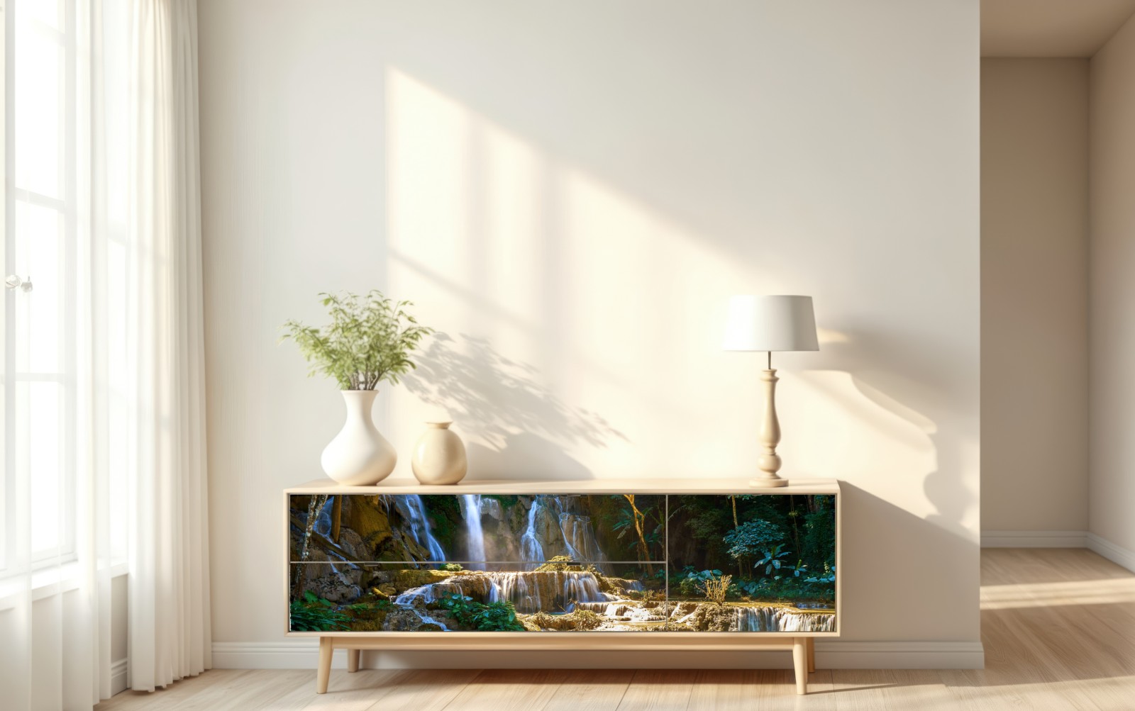 Repositionierbarer Aufkleber Türkisfarbener wasserfall im üppigen wald