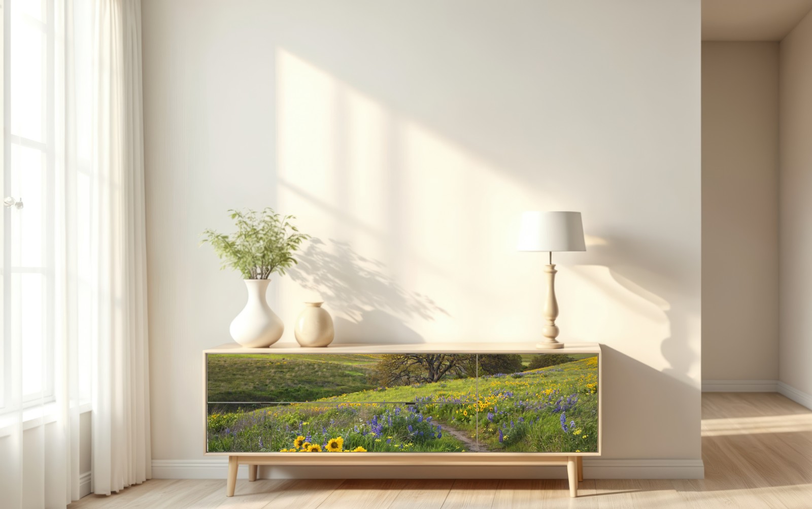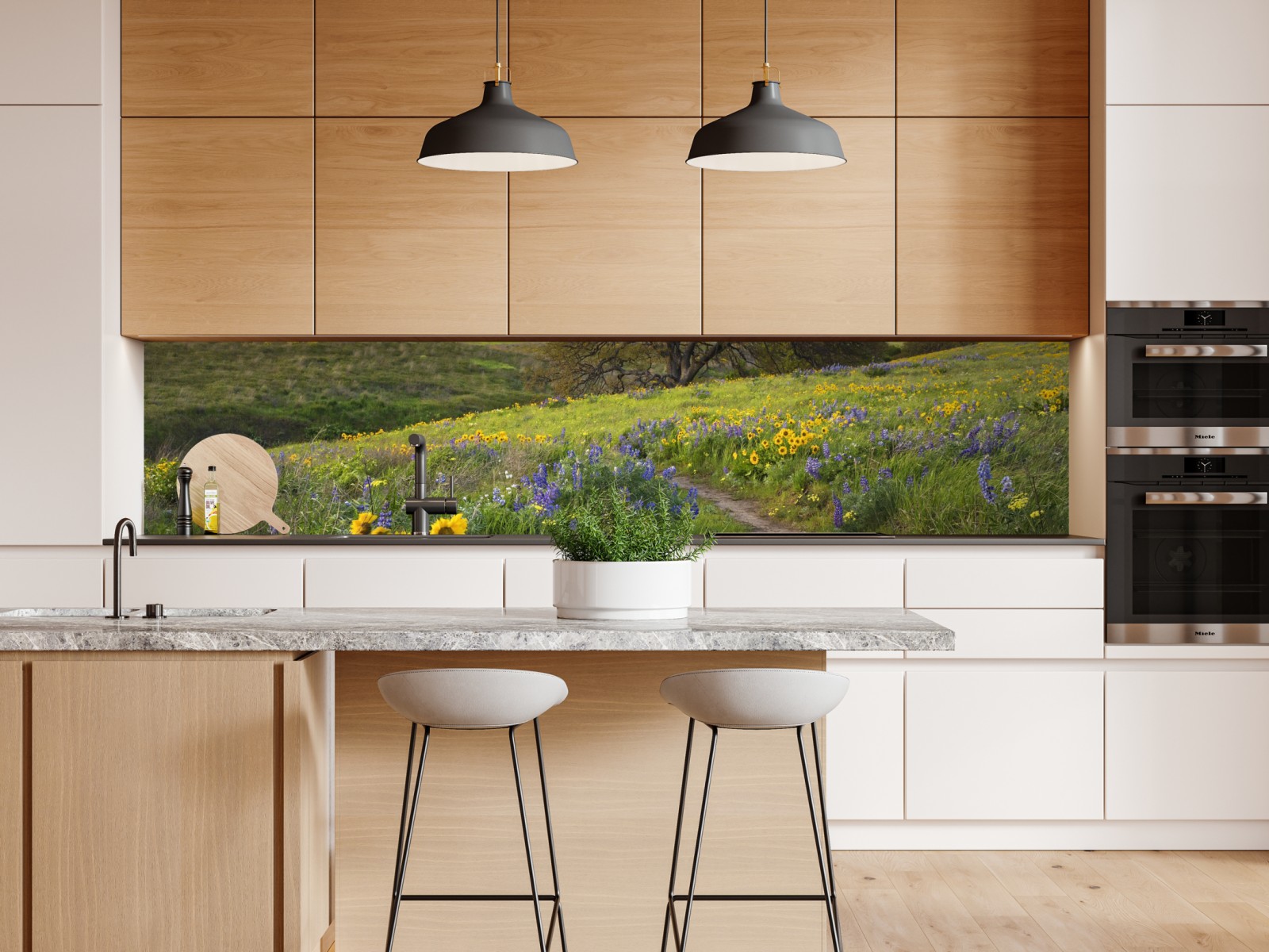 Repositionierbarer Aufkleber Pfad durch blumenwiese mit eichenbaum