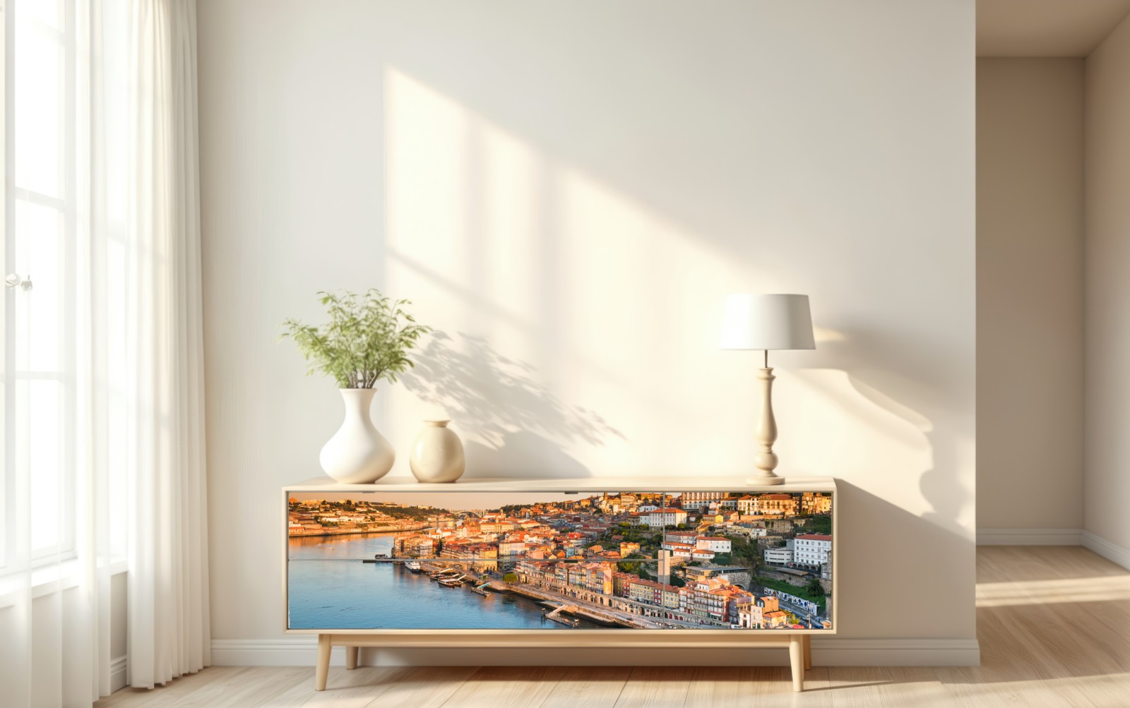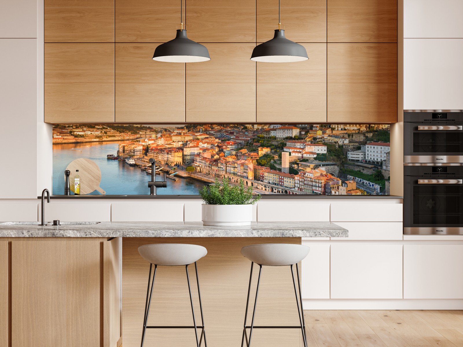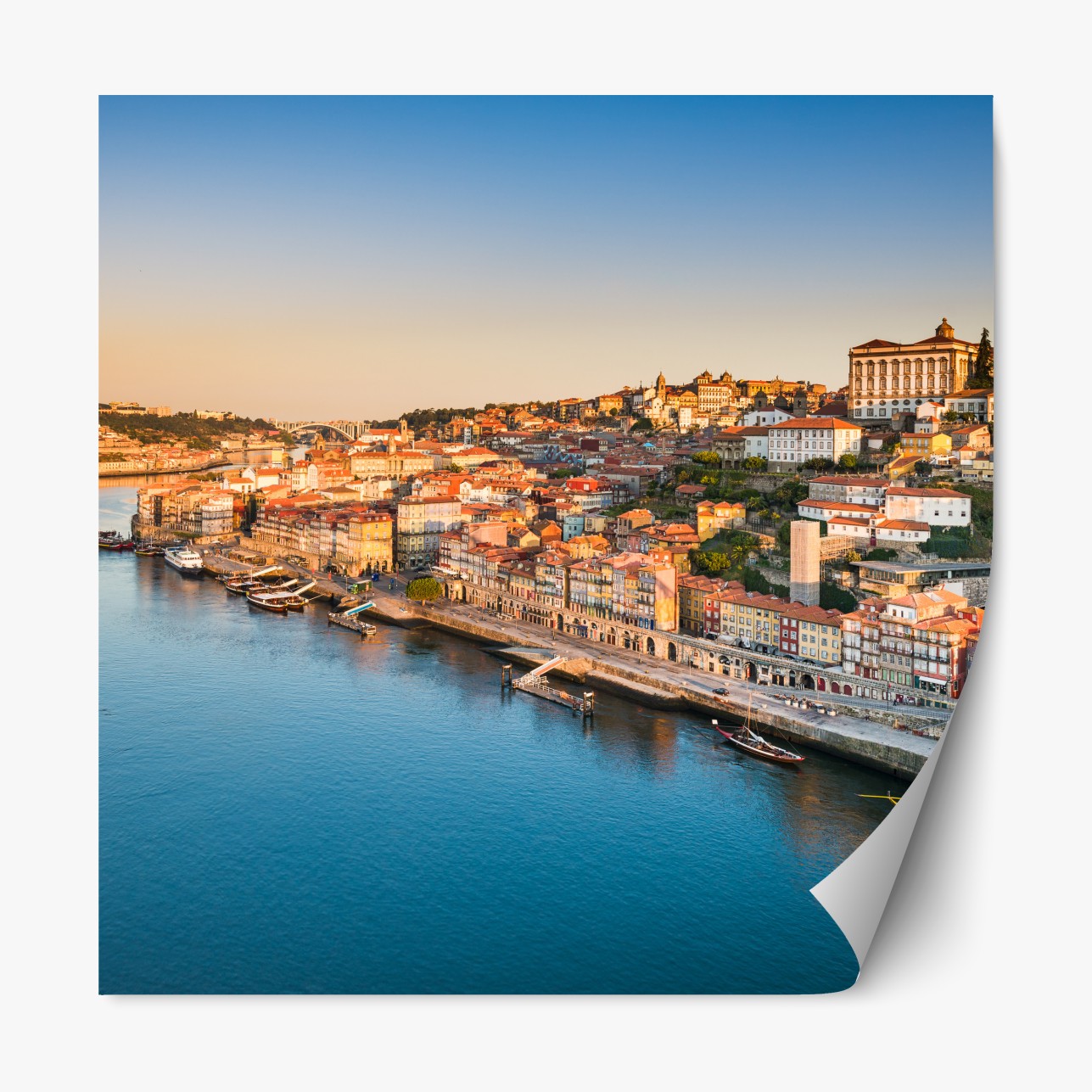Repositionierbarer Aufkleber Sonnige Porto ufer-skyline im goldenen licht