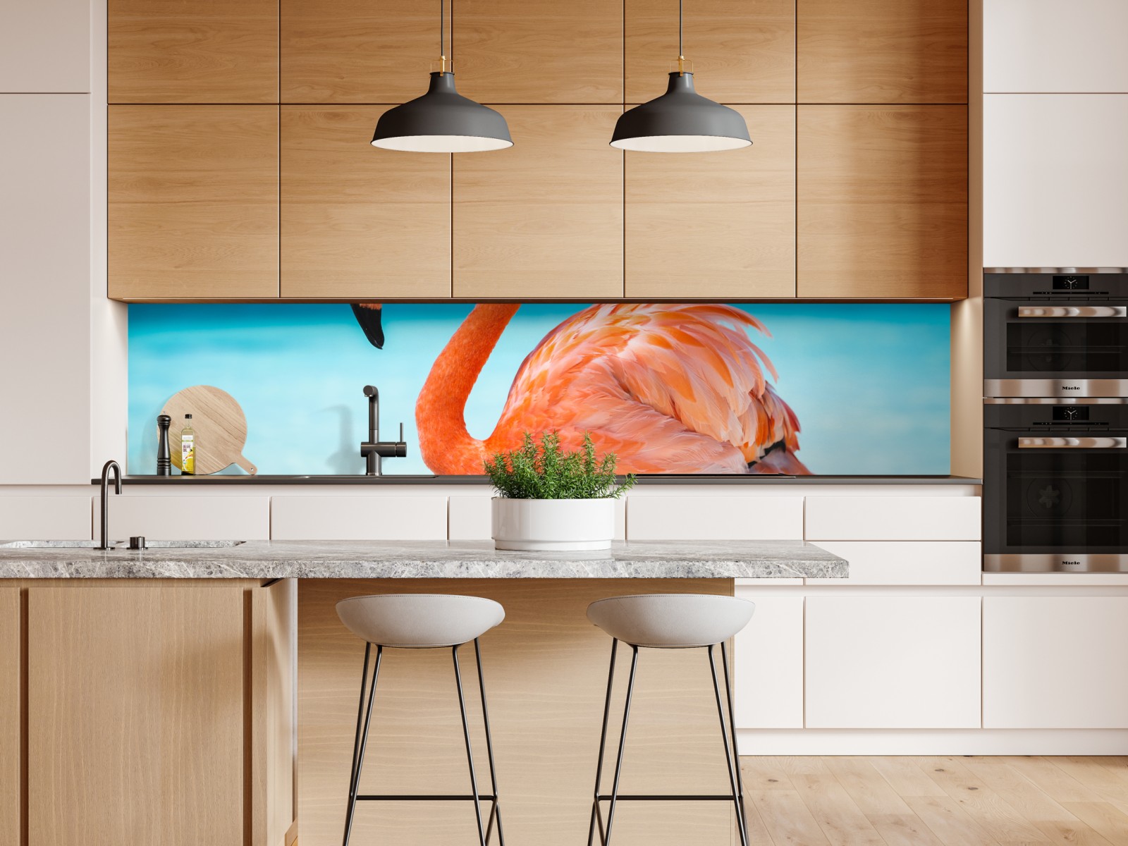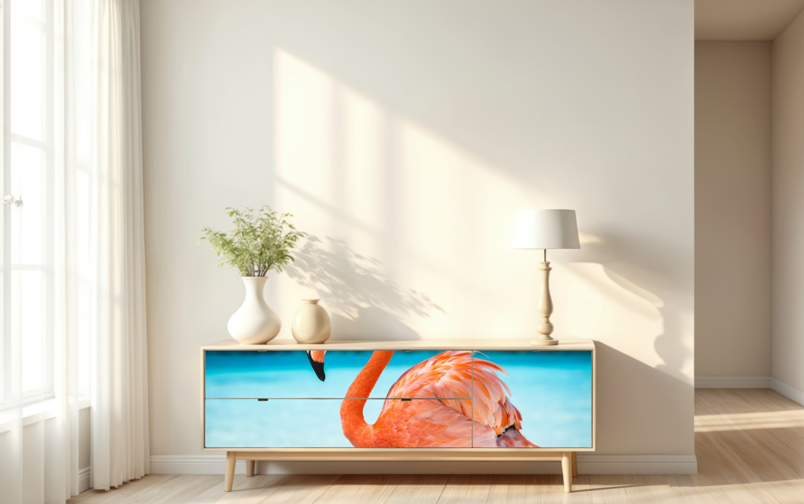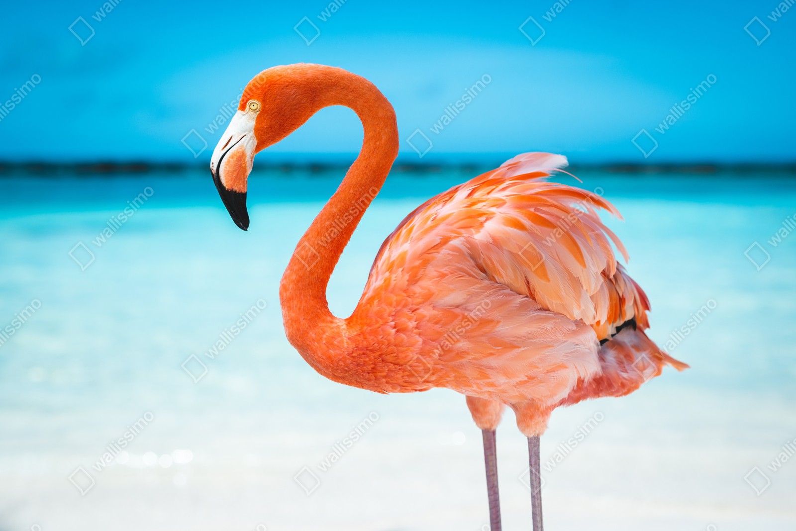Repositionierbarer Aufkleber Leuchtender rosa flamingo am türkisfarbenen strand