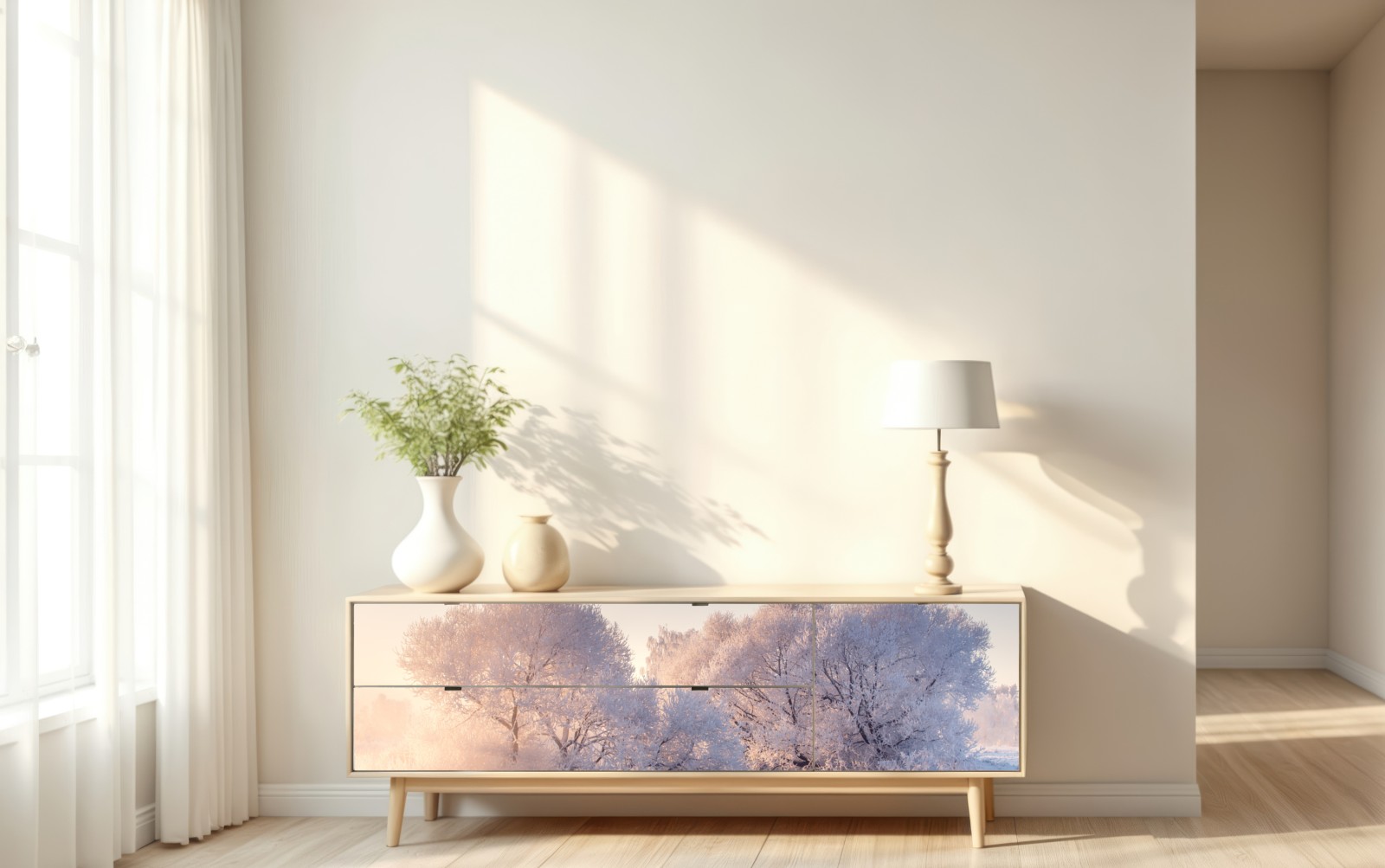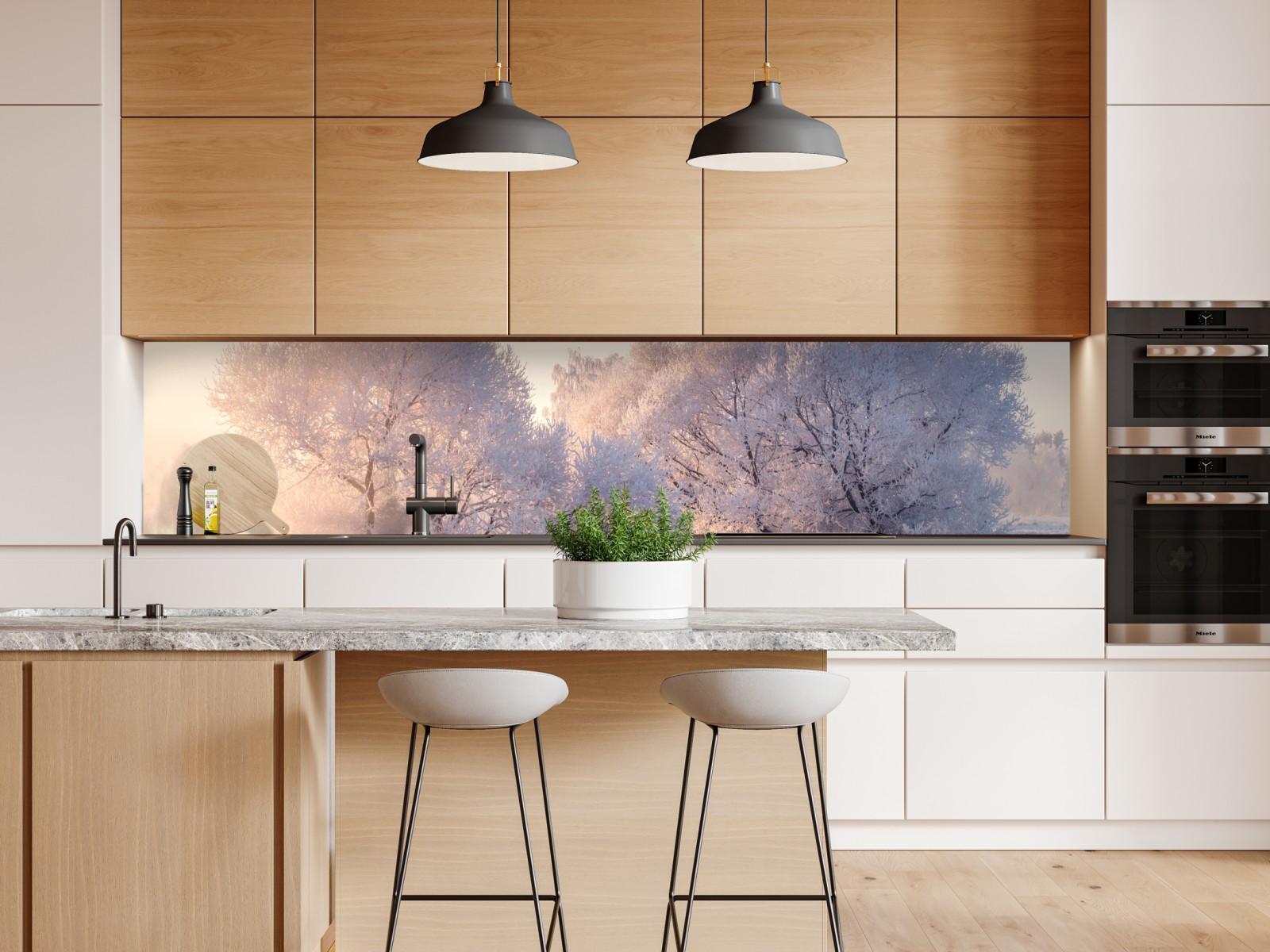 Repositionierbarer Aufkleber Raureifbedeckte bäume bei sonnenaufgang