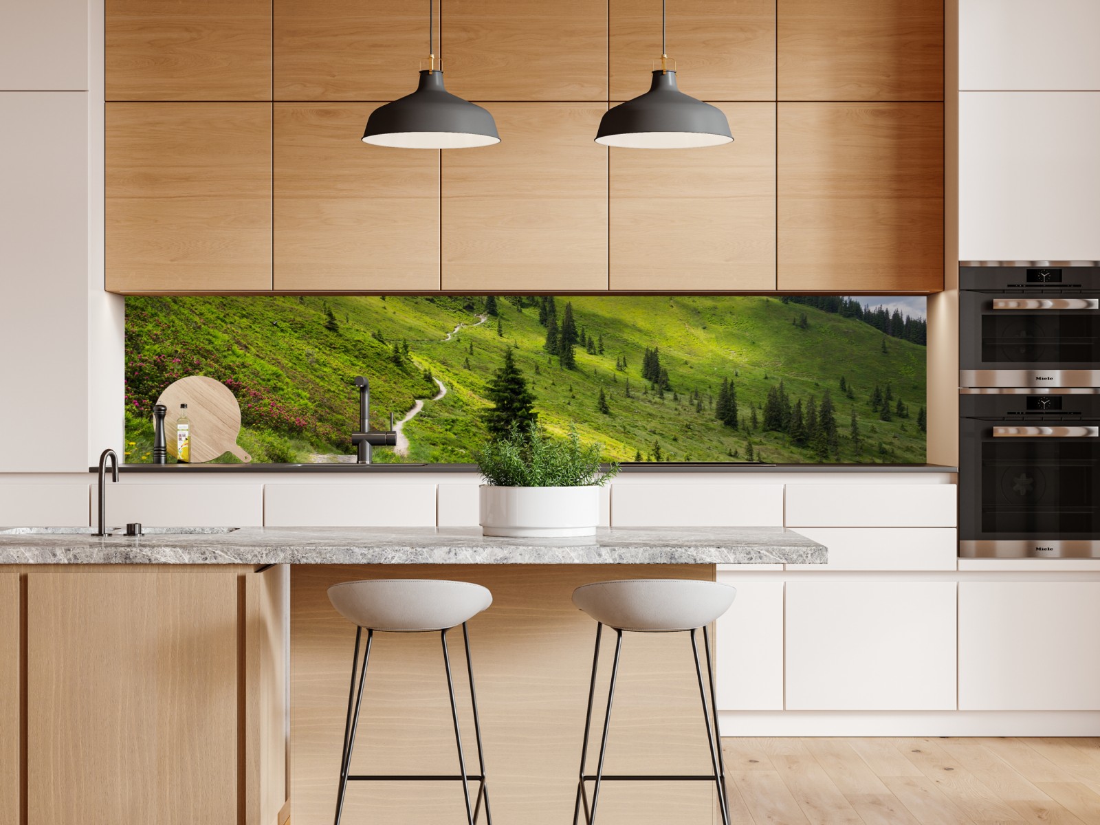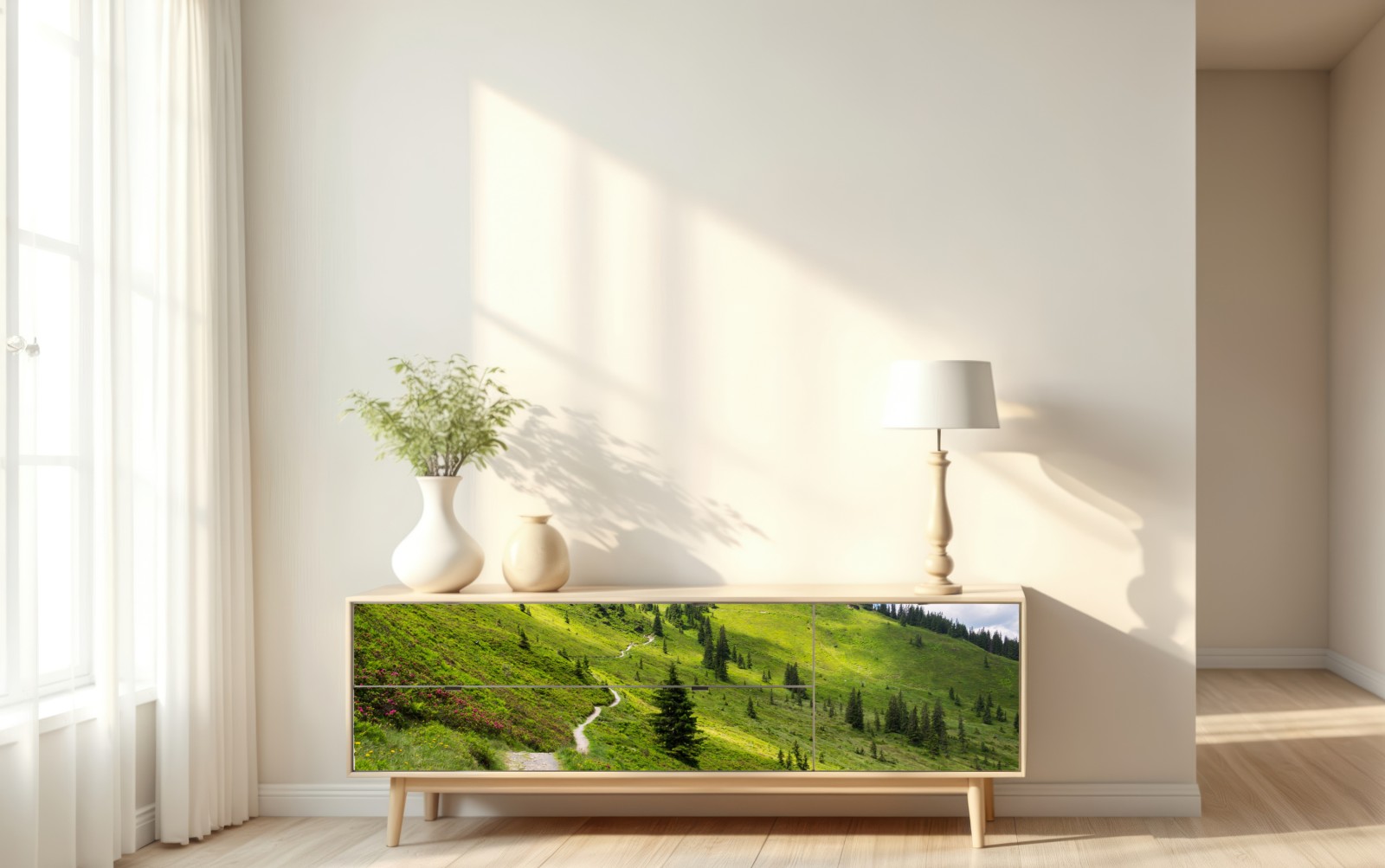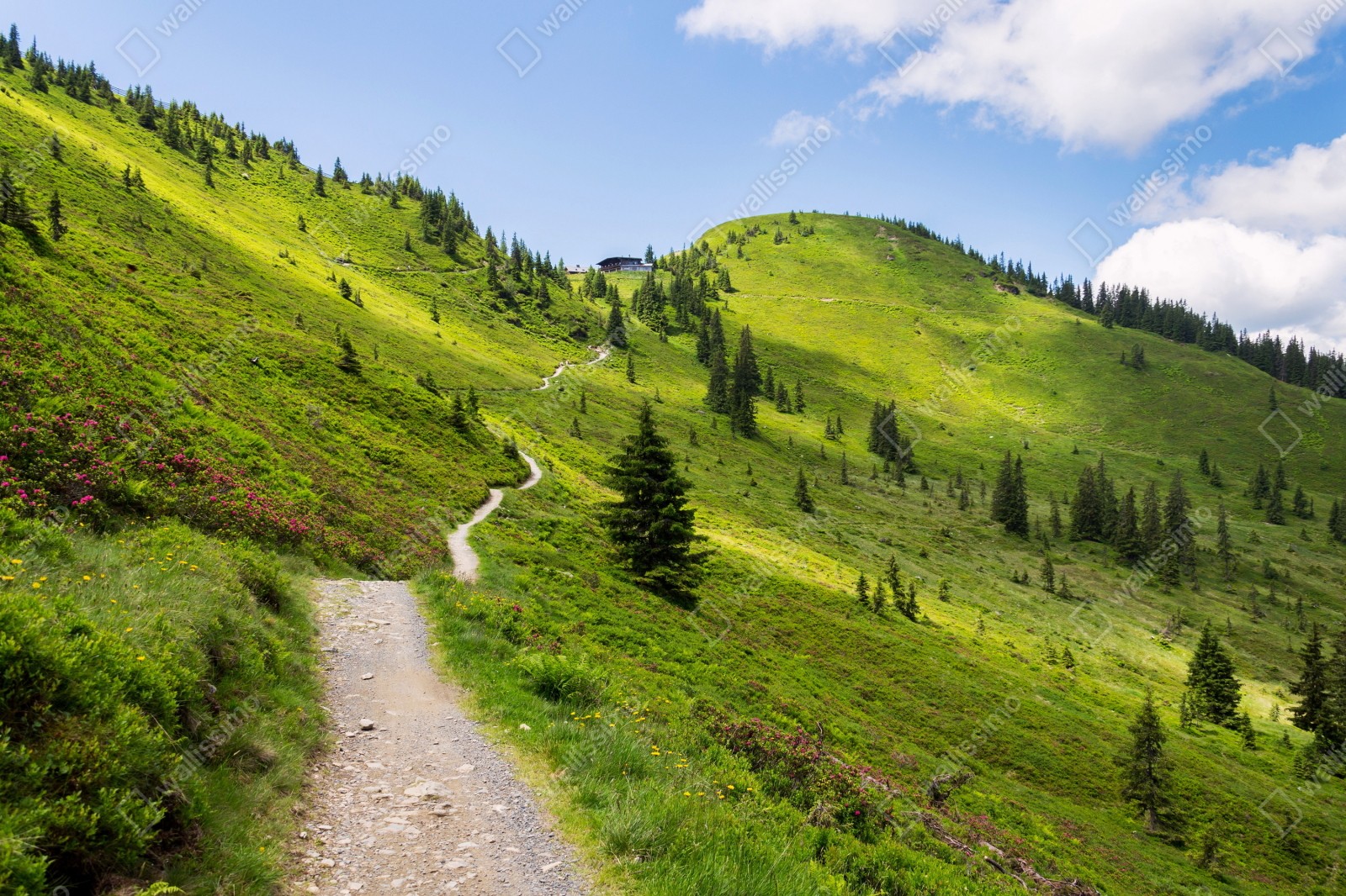 Repositionierbarer Aufkleber Sonniger bergpfad durch grüne wiese