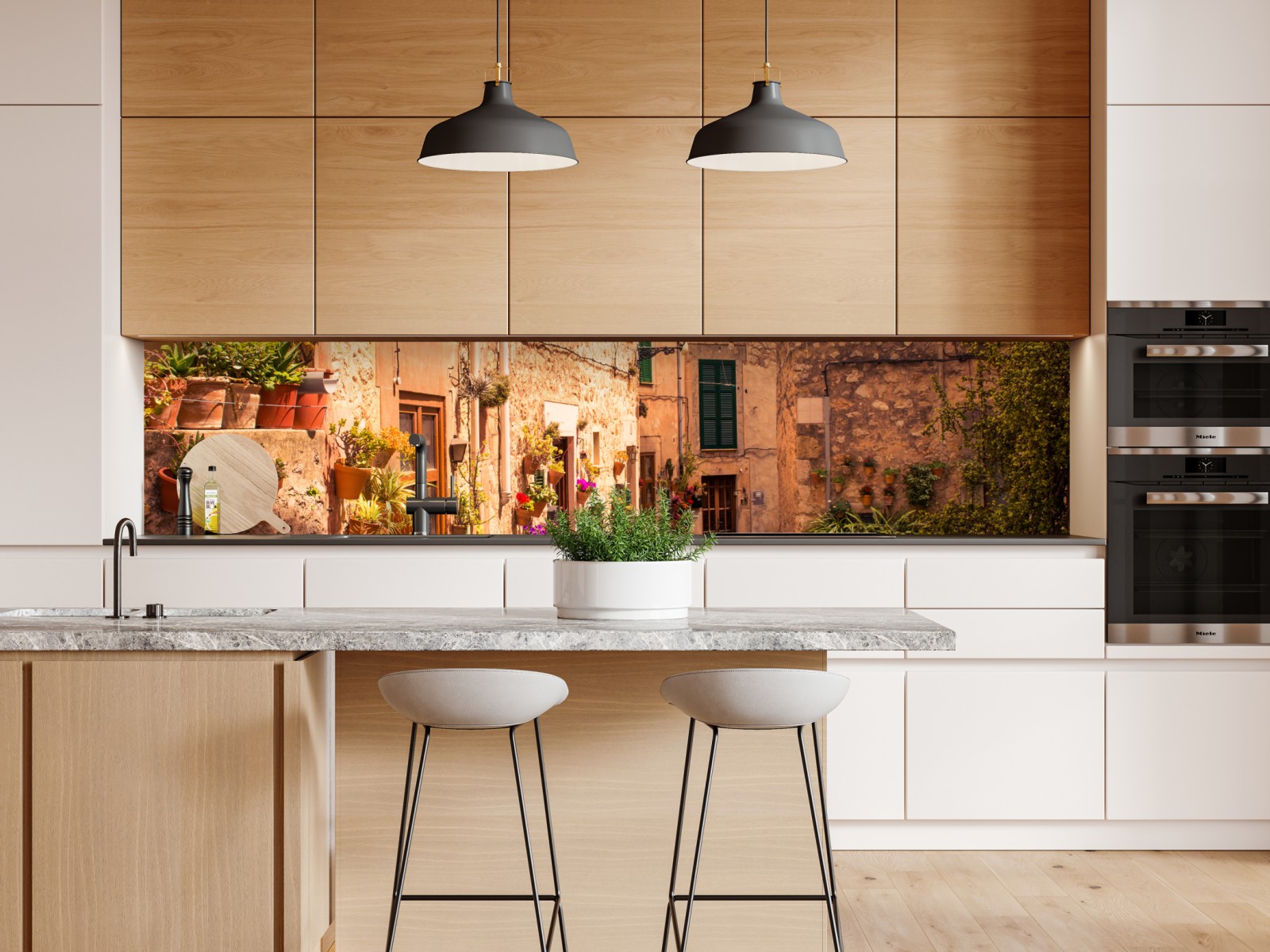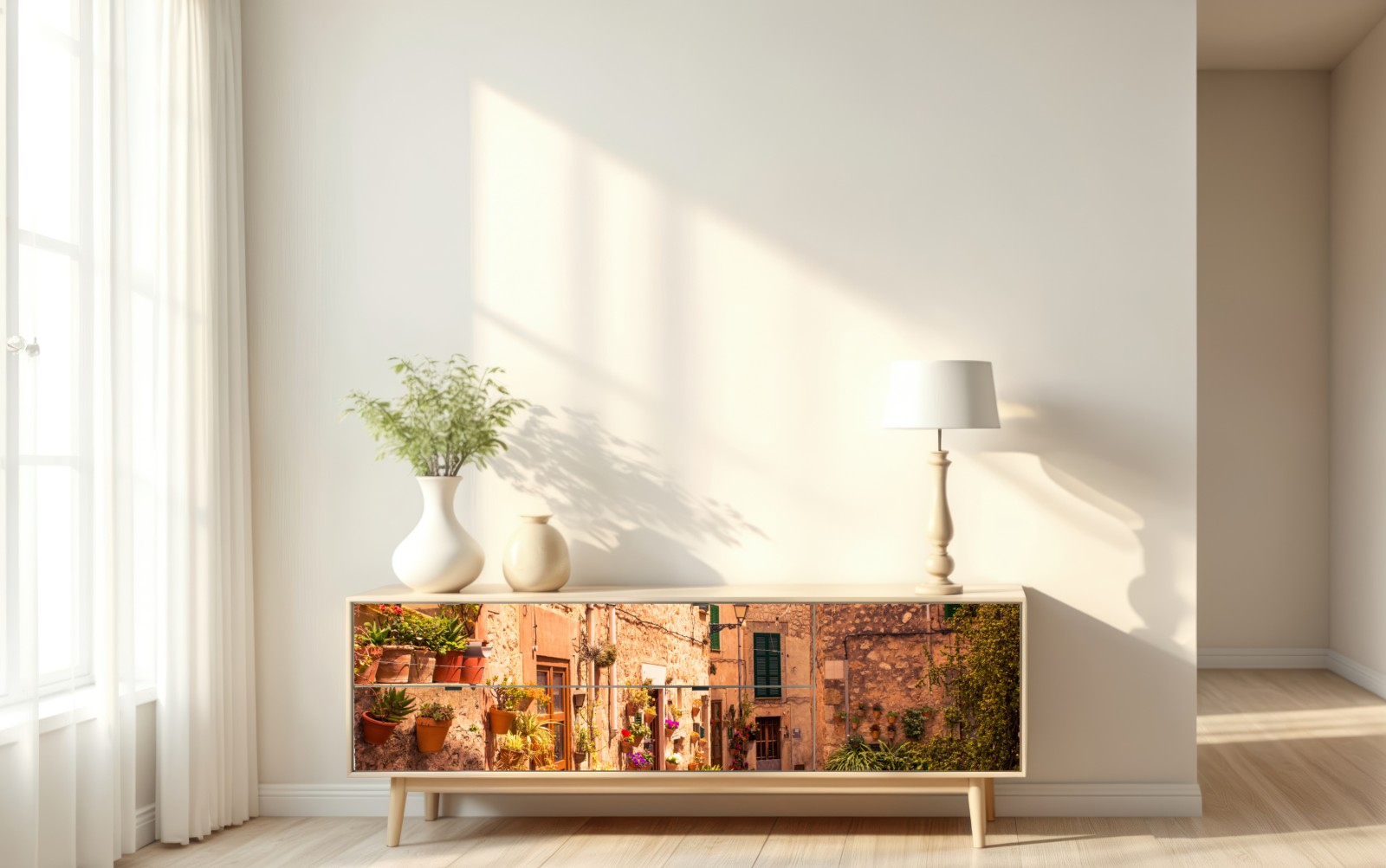 Repositionierbarer Aufkleber Sonnige mediterrane gasse mit blumentöpfen