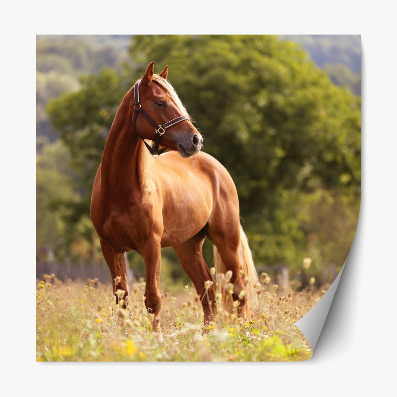 Repositionierbarer Aufkleber Majestätisches kastanienbraunes pferd auf sommerlicher wiese