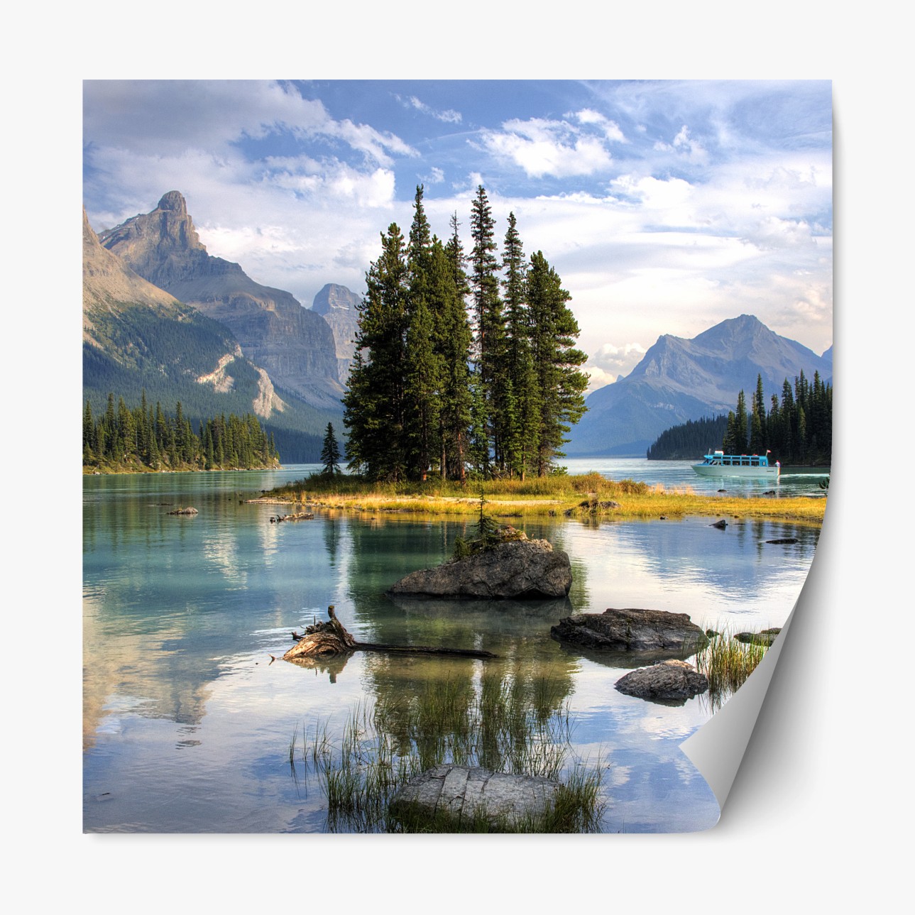 Repositionierbarer Aufkleber Ruhiger alpensee mit insel und bergen
