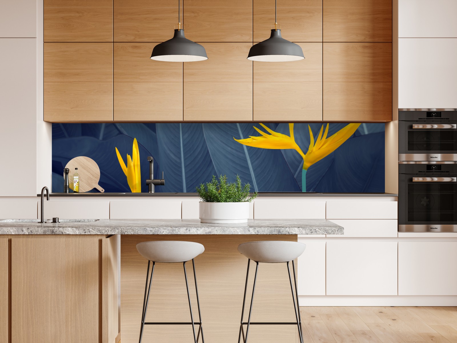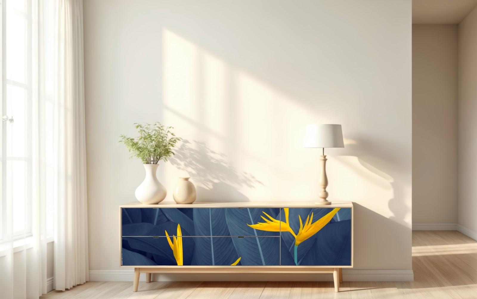 Repositionierbarer Aufkleber Gelbe strelitzie auf blauen blättern