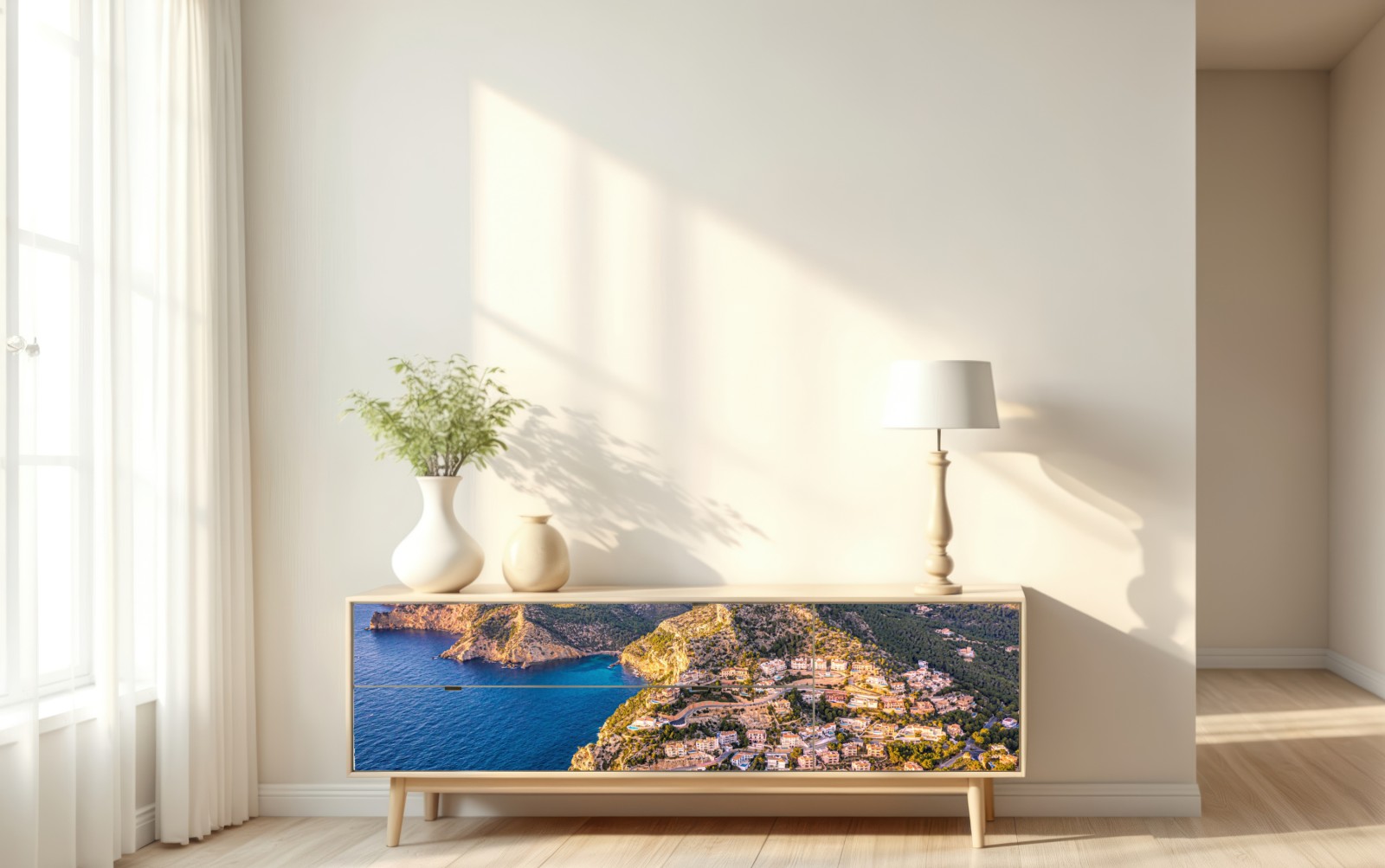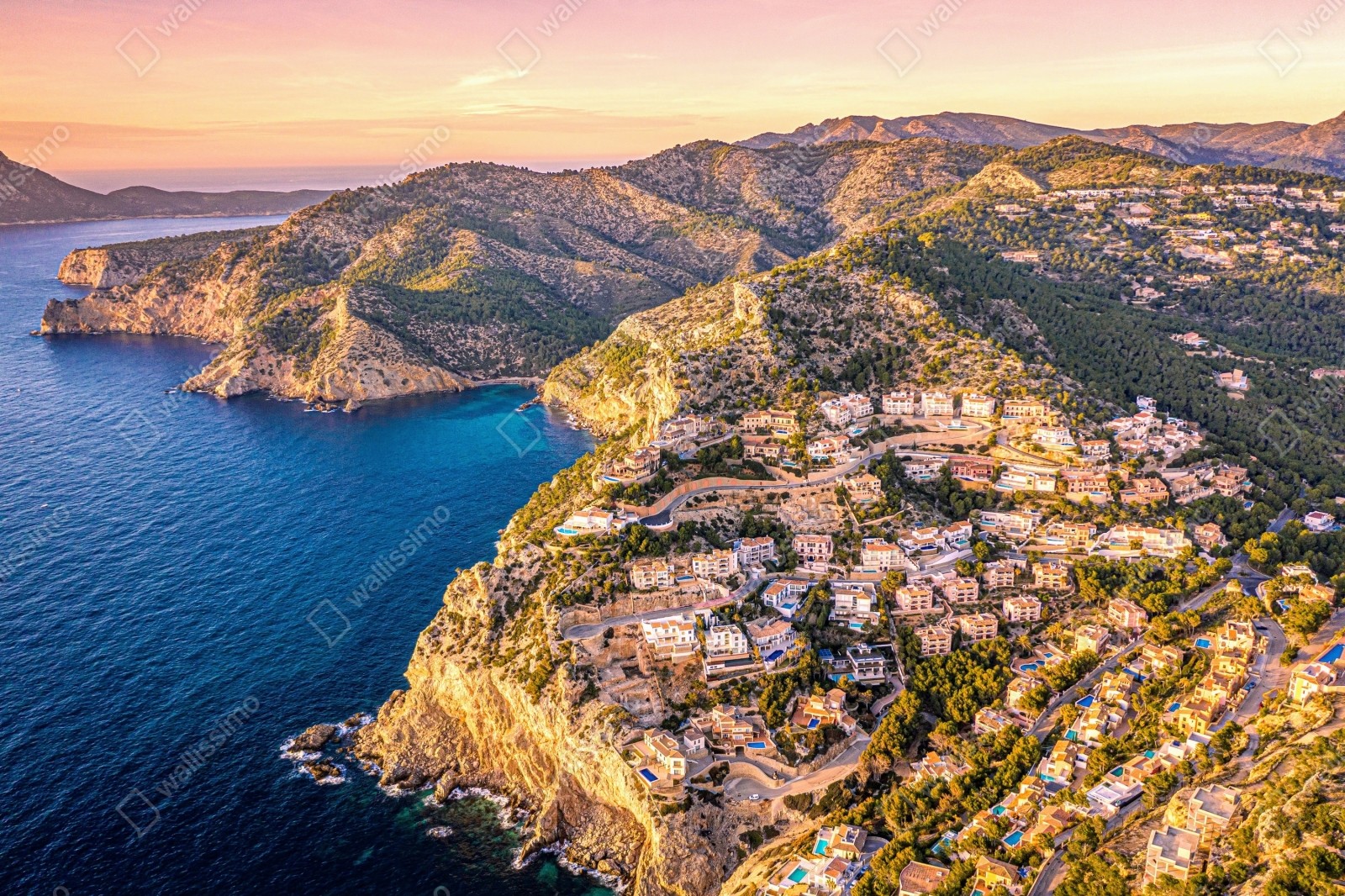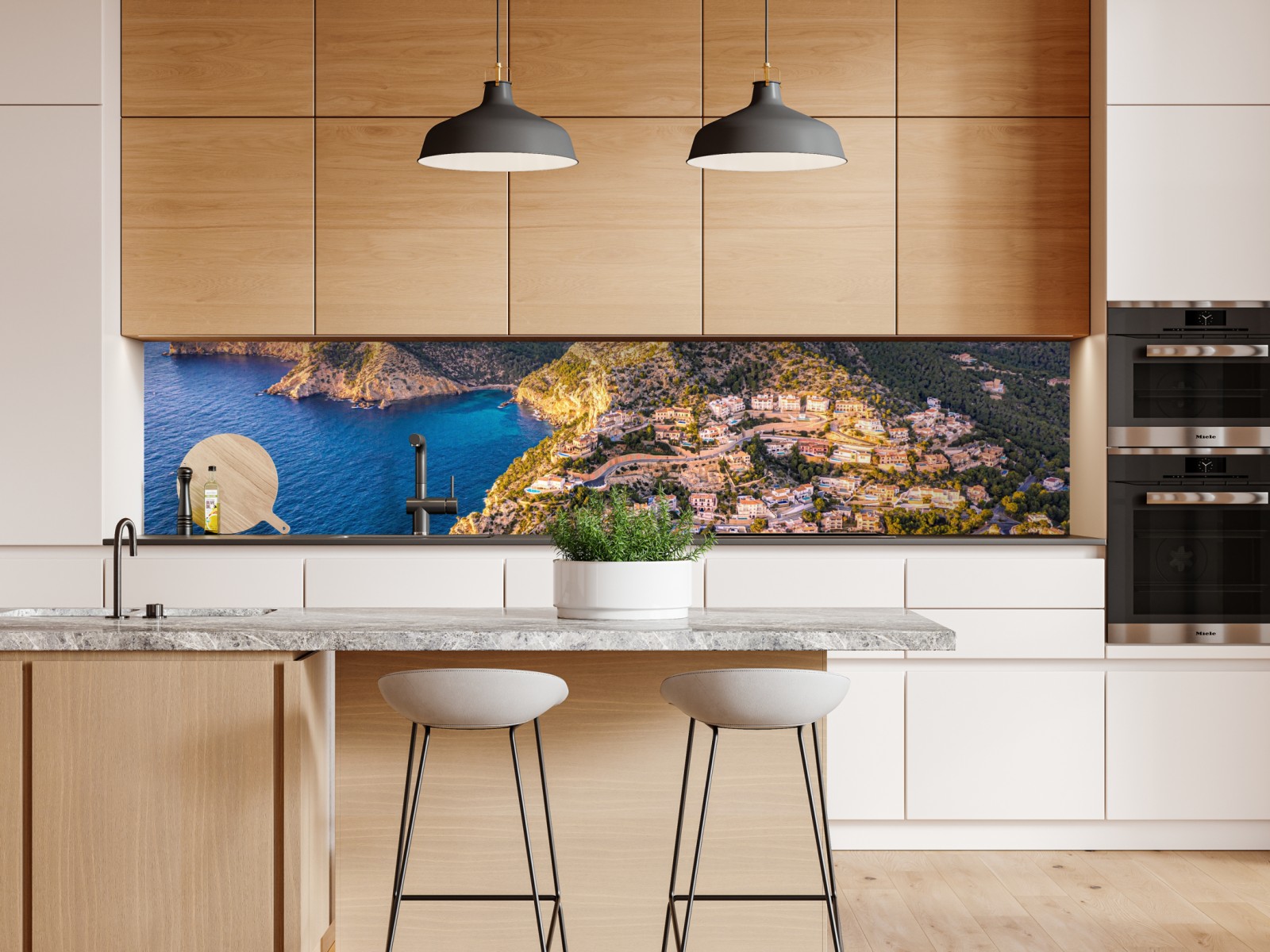 Repositionierbarer Aufkleber Sonnenuntergang über küstenlandschaft mit dorf am kliff