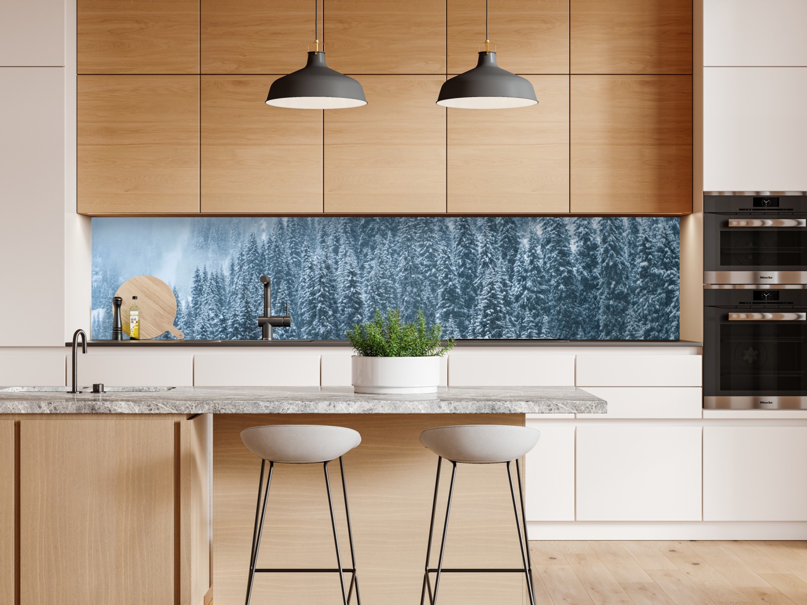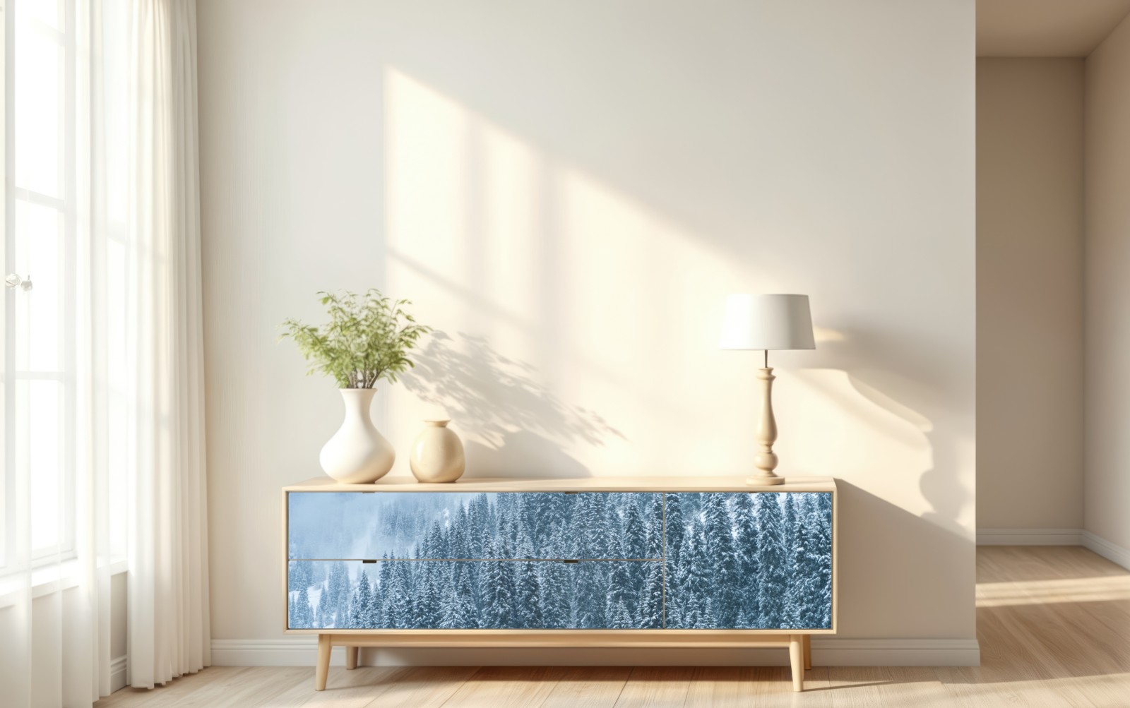 Repositionierbarer Aufkleber Nebeliger schneebedeckter kiefernwald