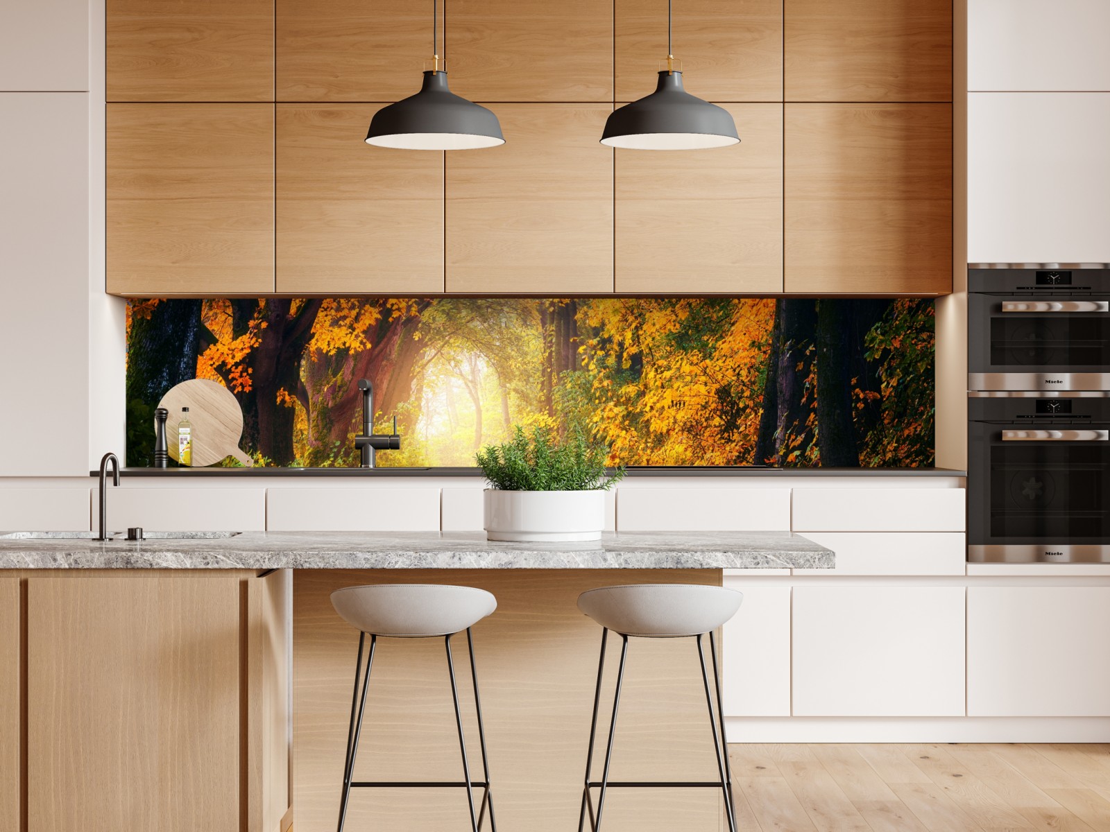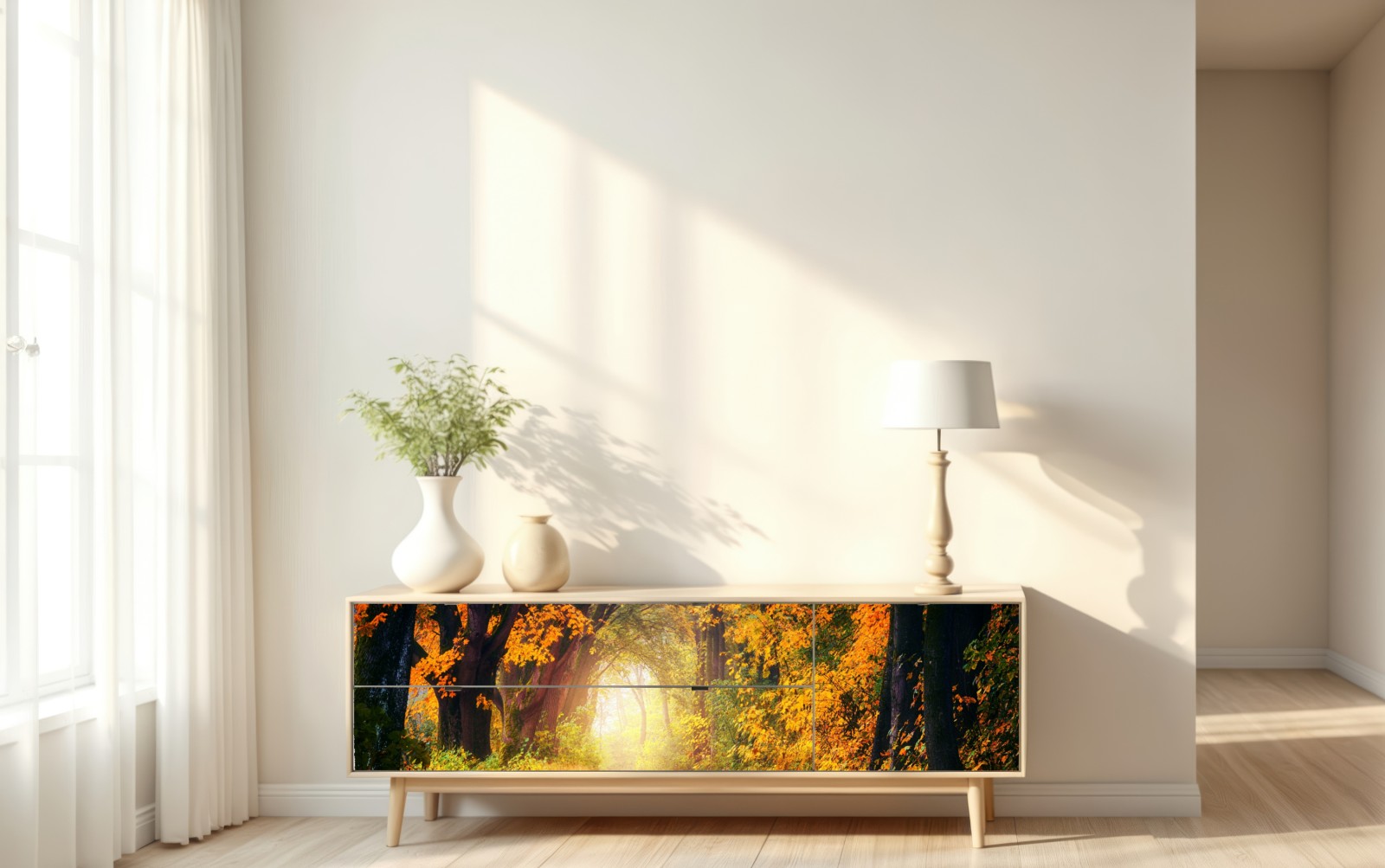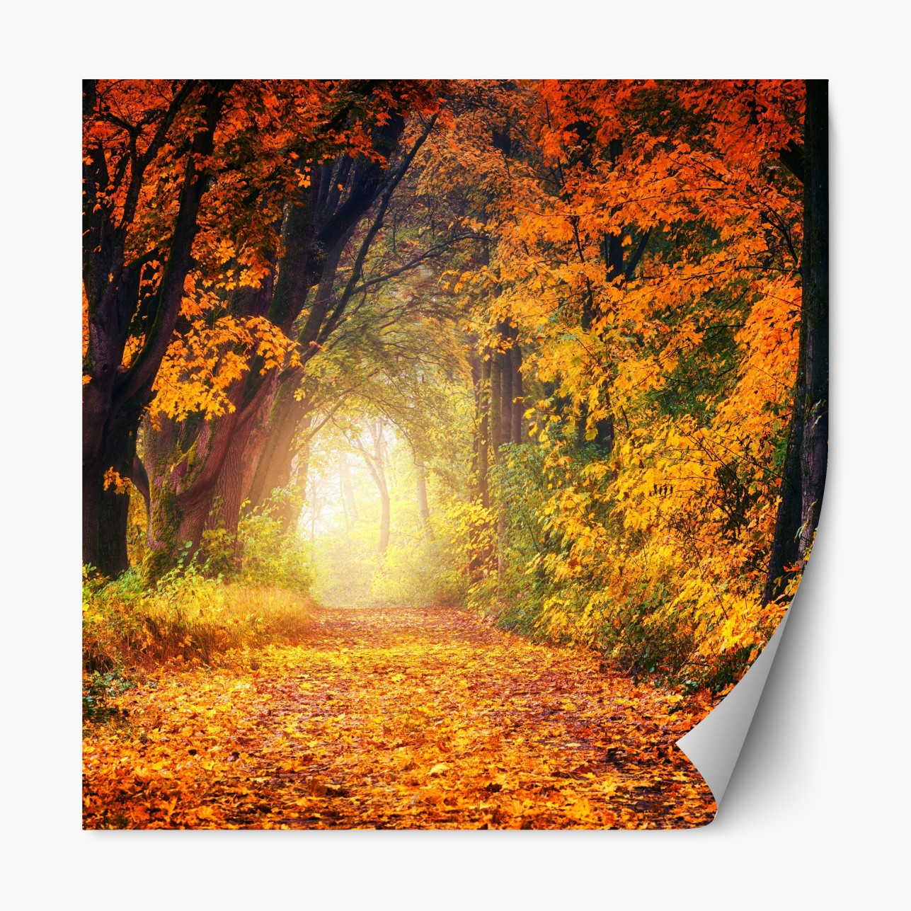 Repositionierbarer Aufkleber Herbstlicher waldpfad im goldenen licht