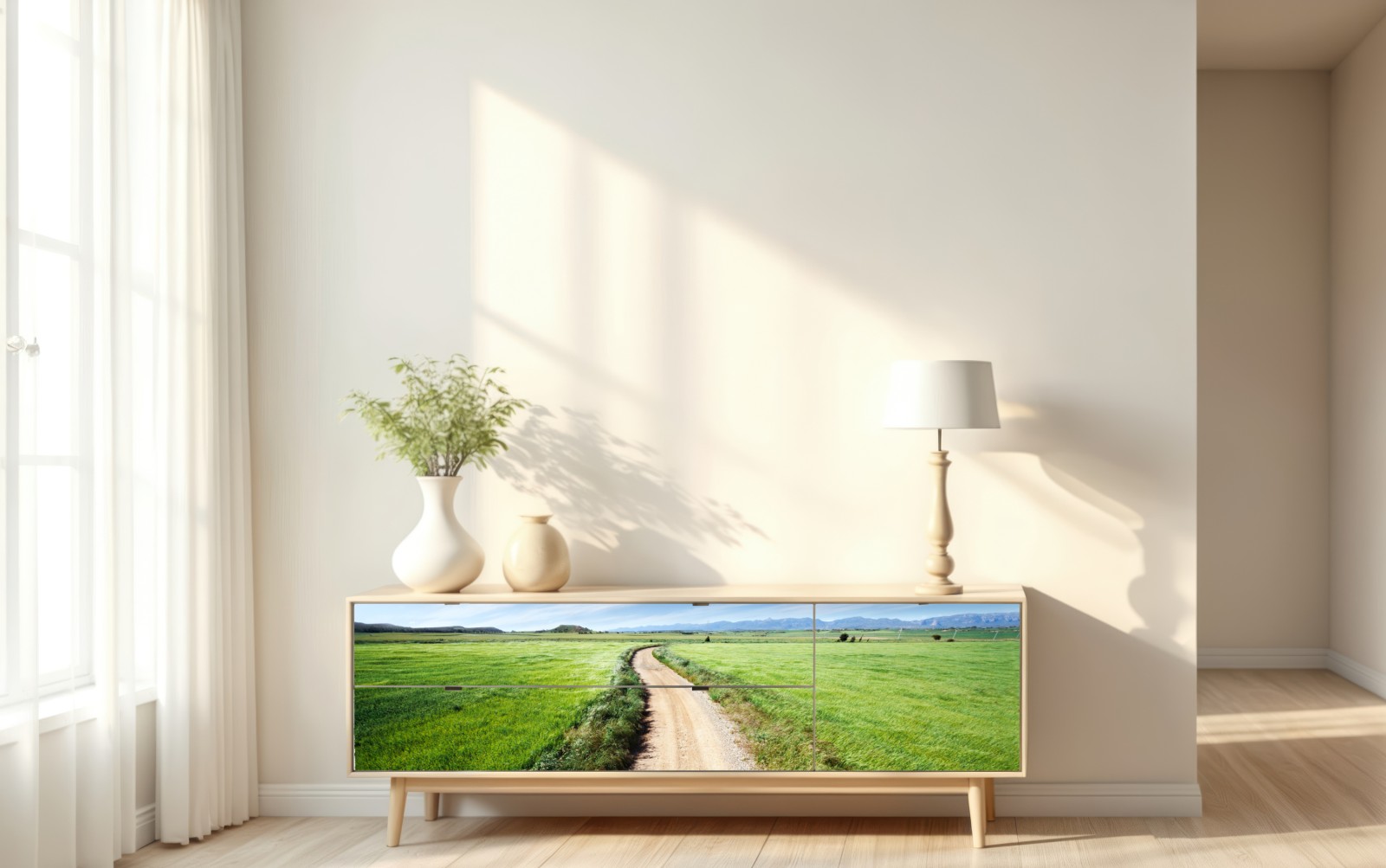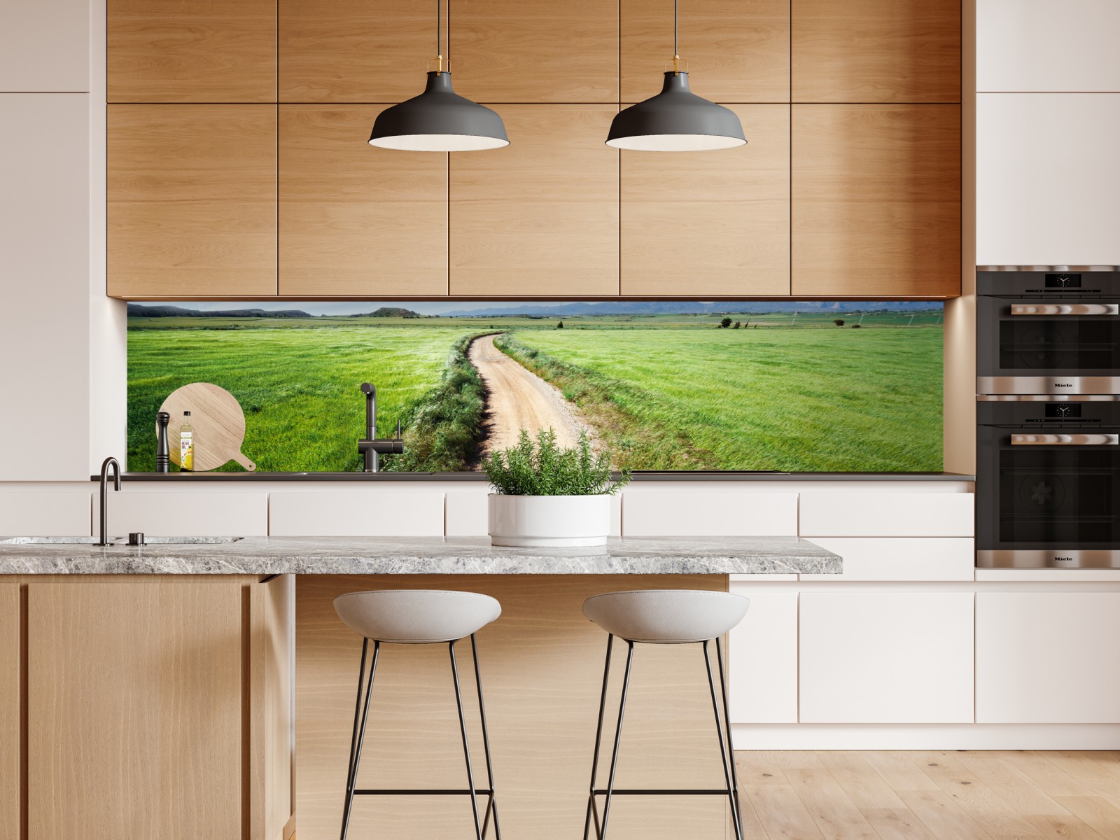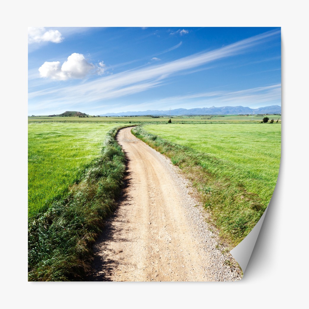 Repositionierbarer Aufkleber Gewundener landweg durch grüne wiesen