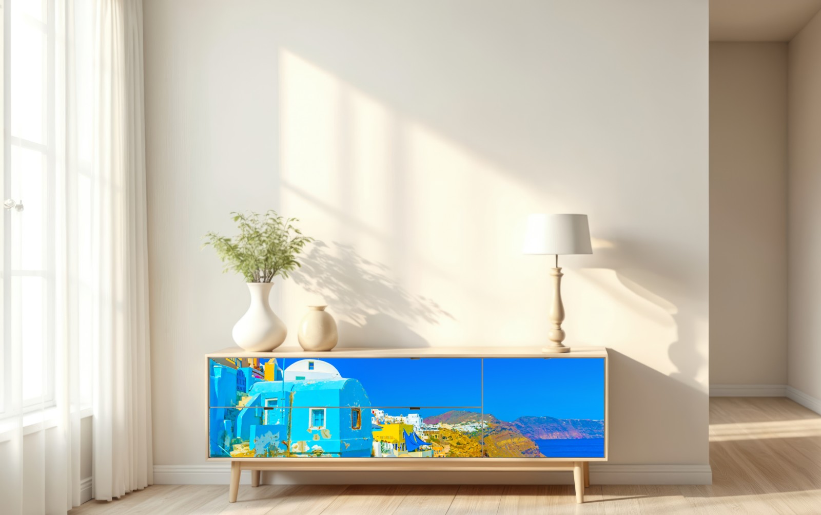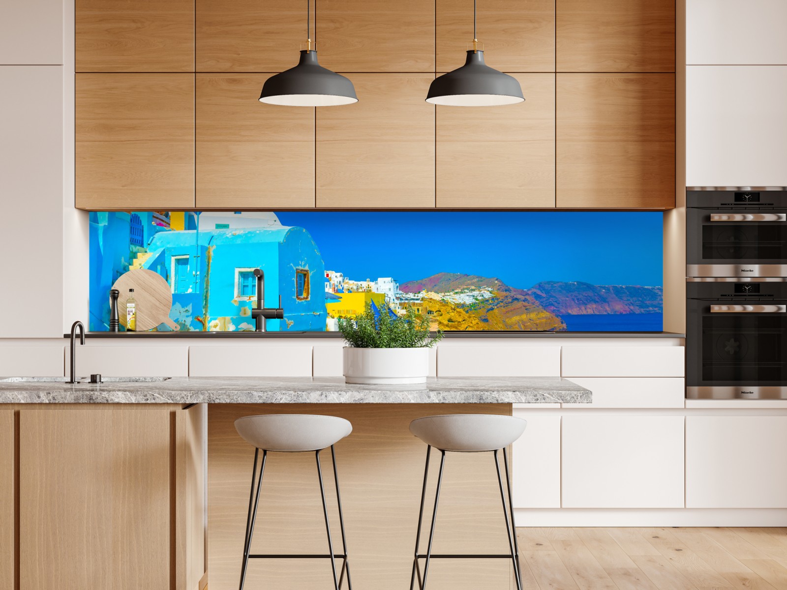 Repositionierbarer Aufkleber Sonniger blick auf Oia, Santorini