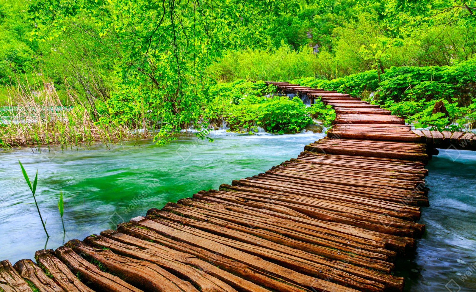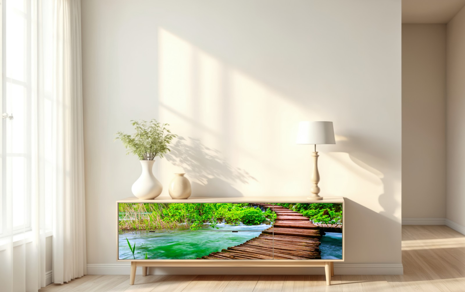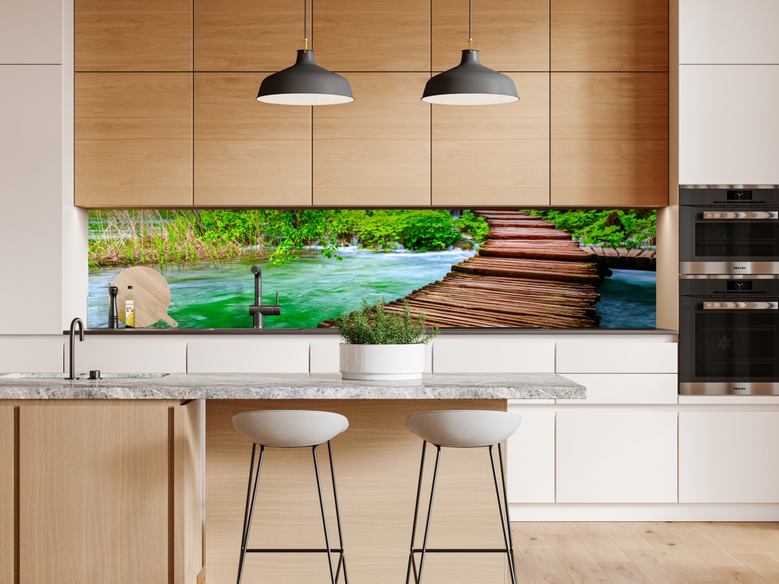 Repositionierbarer Aufkleber Ruhiger grüner steg über dem fluss