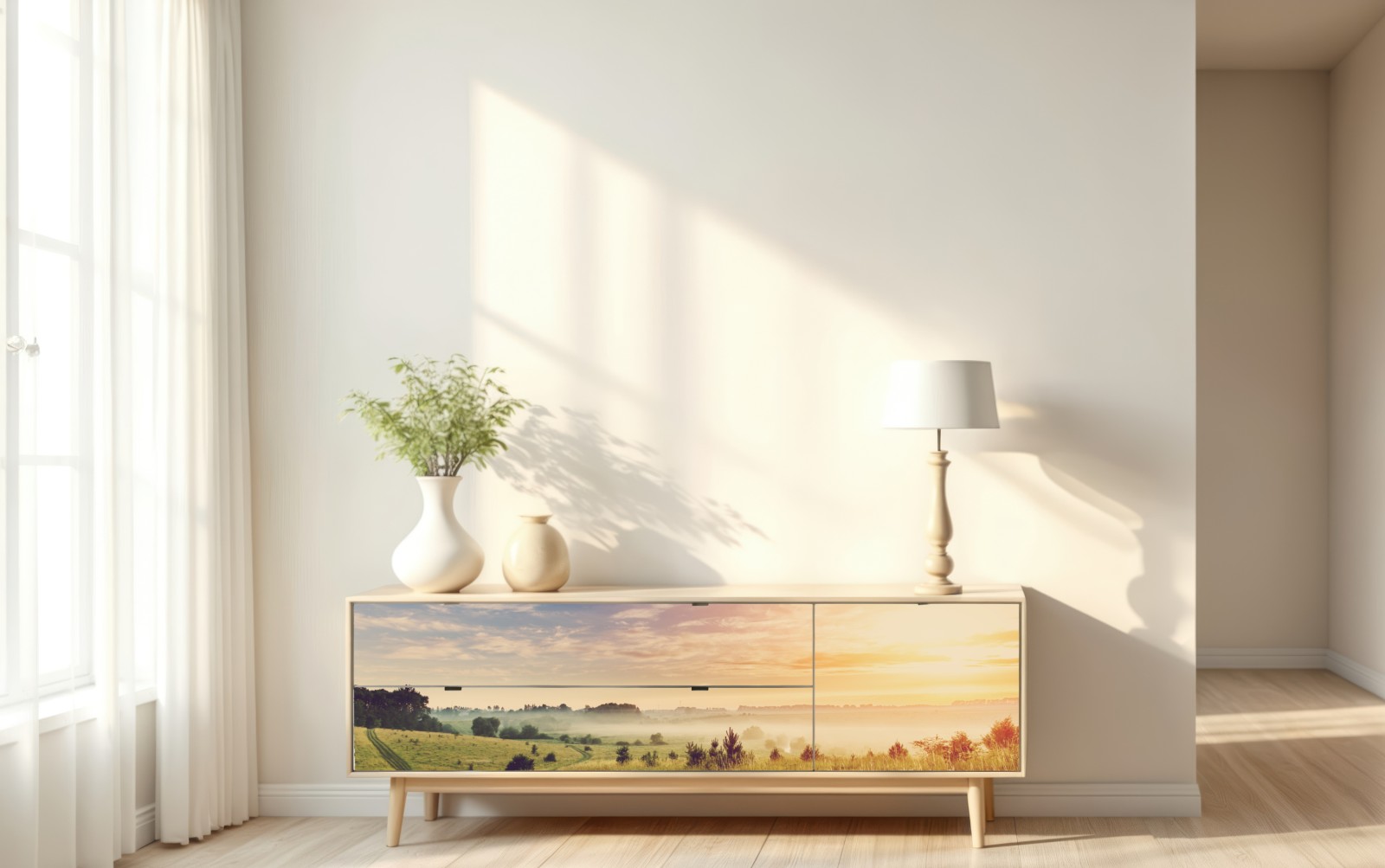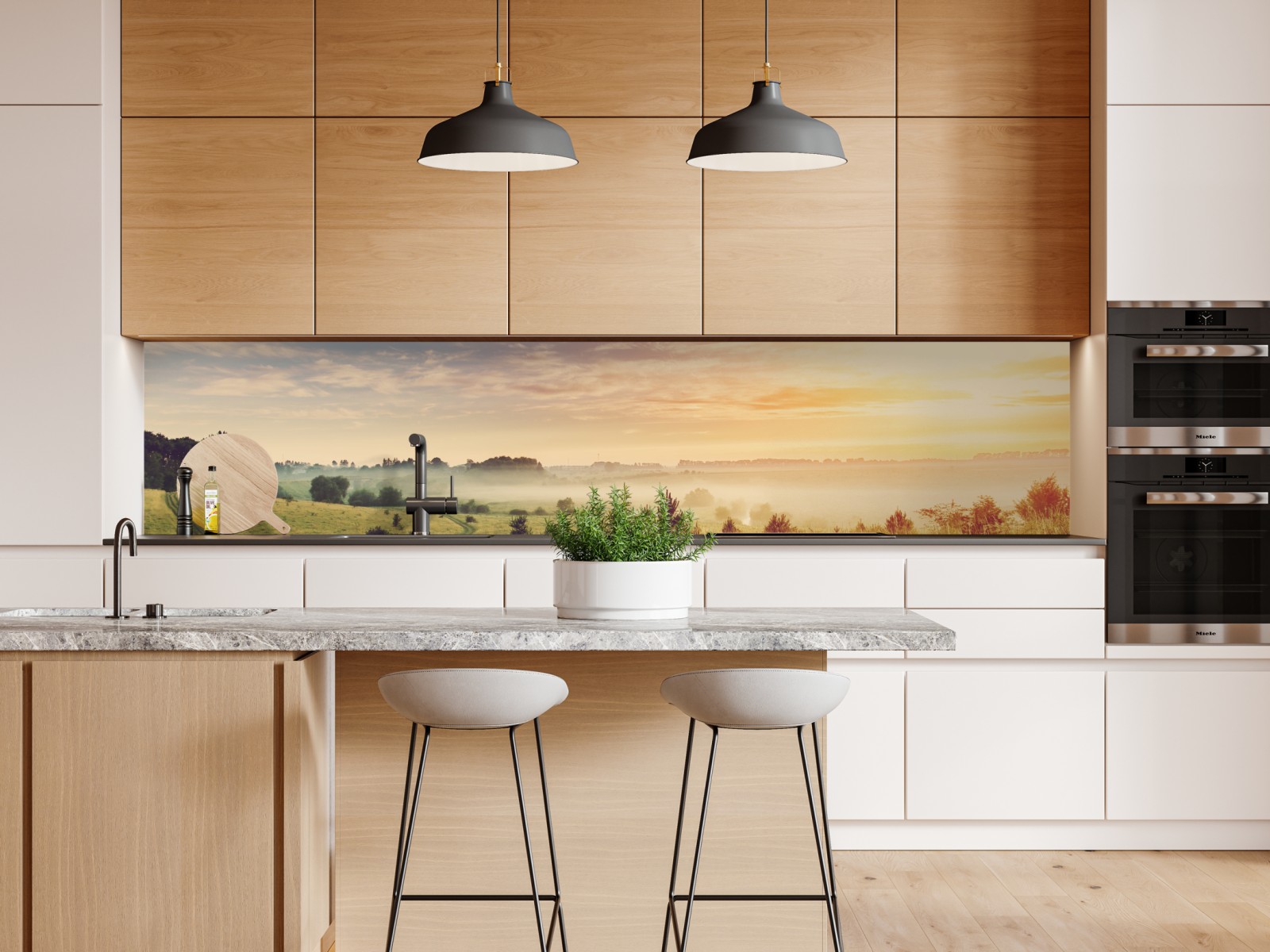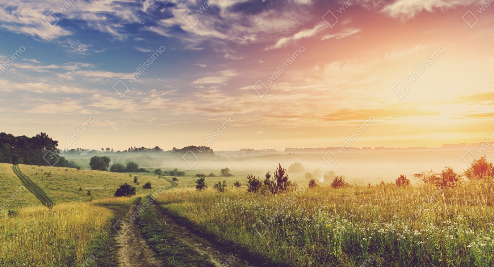 Repositionierbarer Aufkleber Nebeliger sonnenaufgang über einer ländlichen wiese
