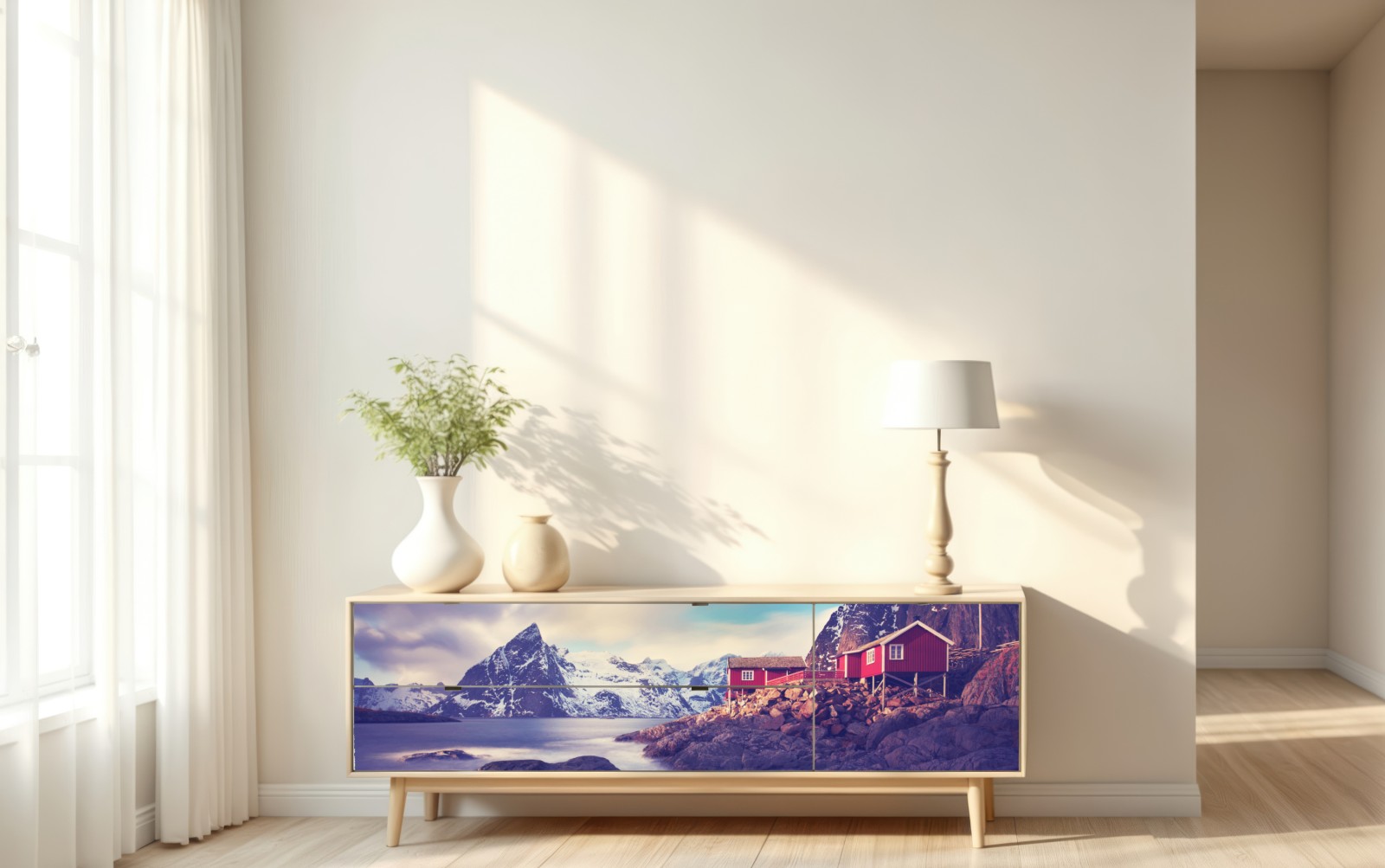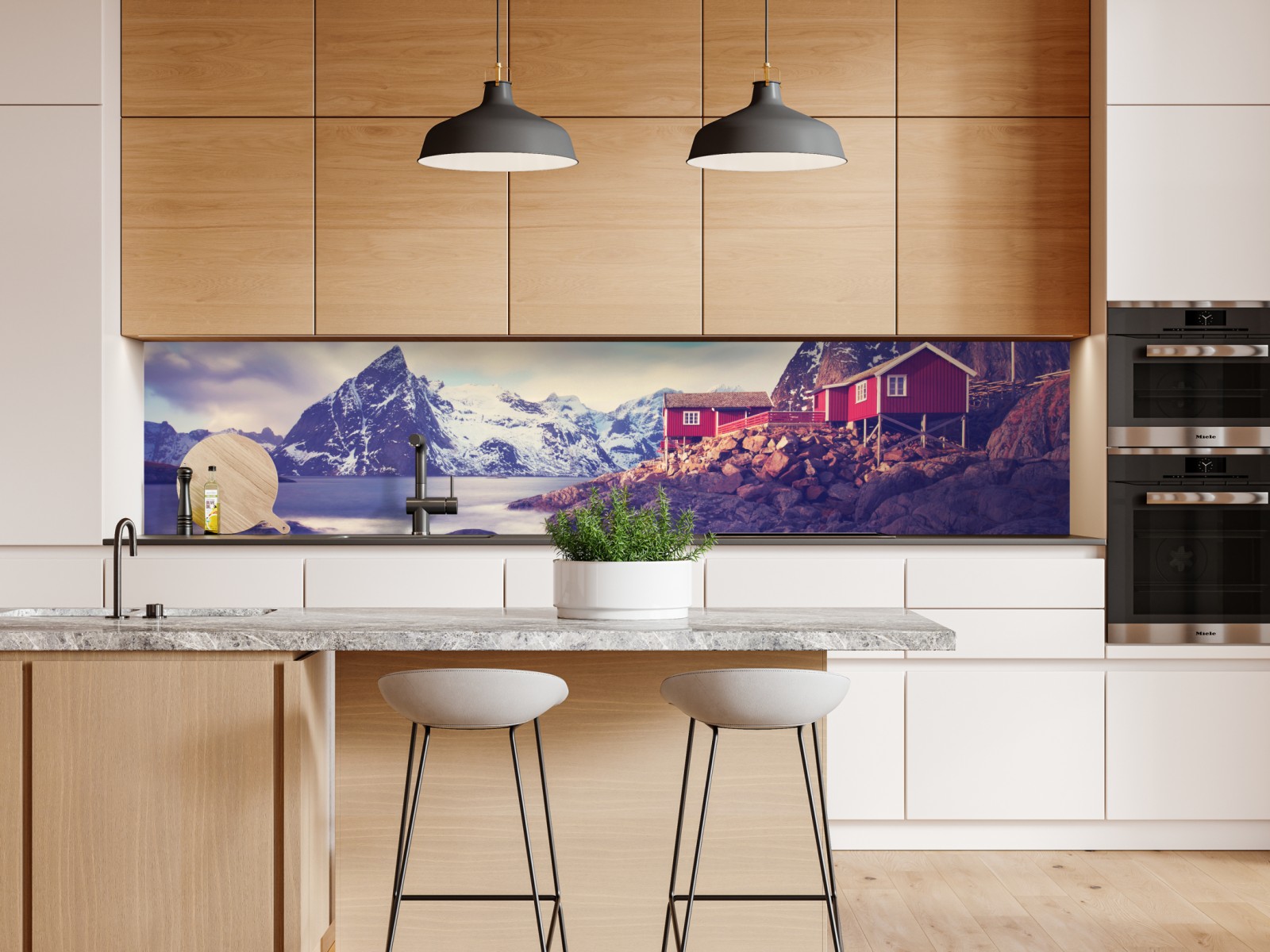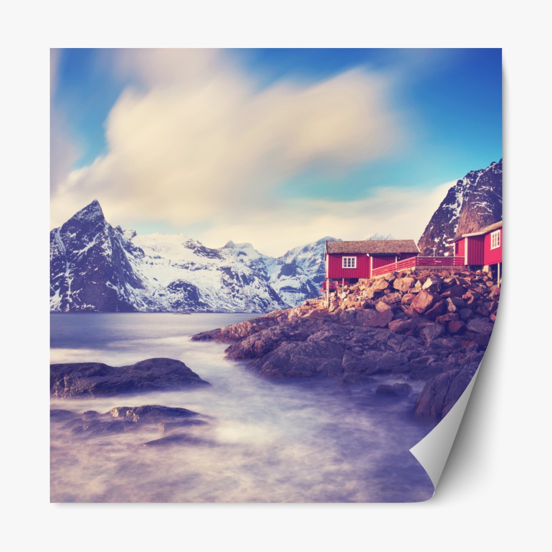 Repositionierbarer Aufkleber Küstengebirge mit roten hütten