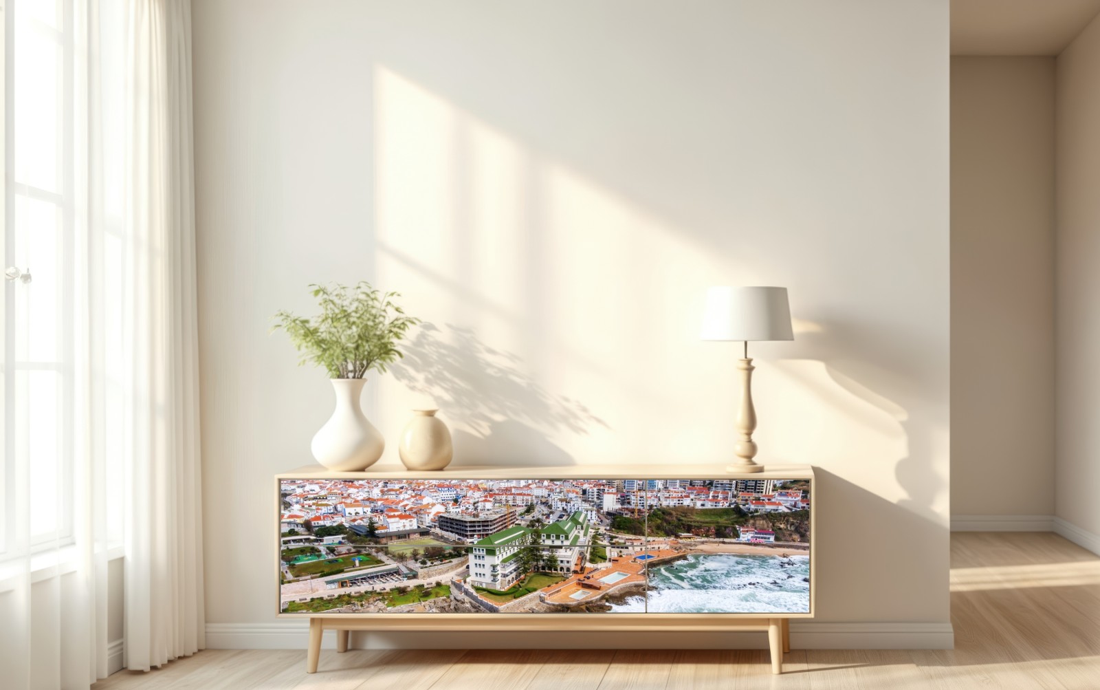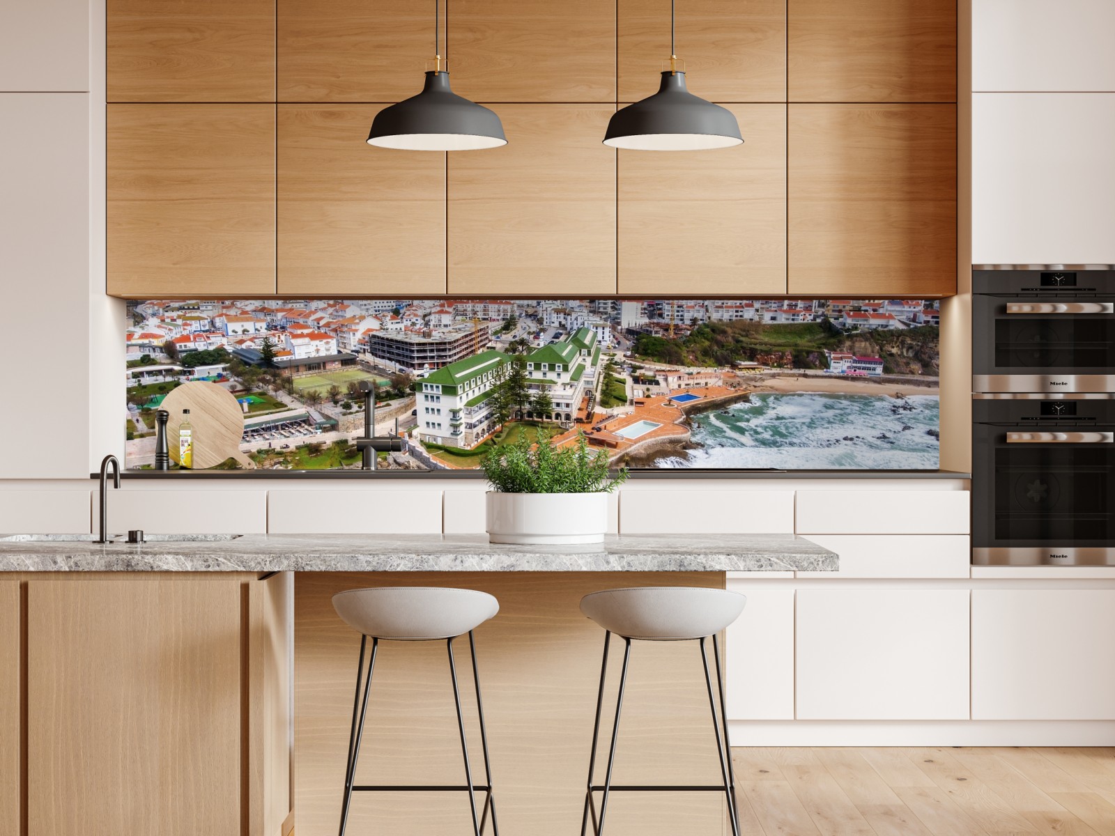 Repositionierbarer Aufkleber Luftaufnahme einer küstenstadt mit tosenden wellen