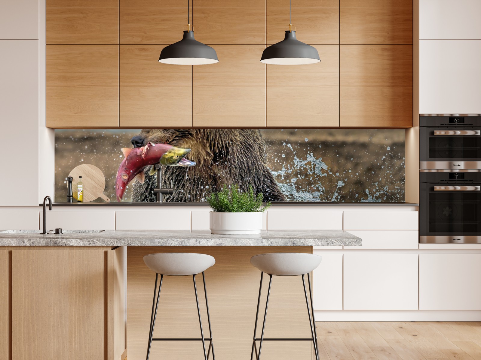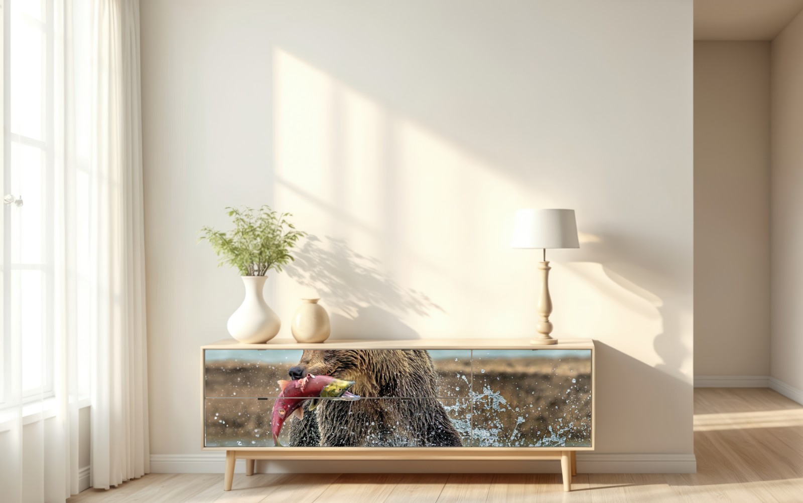 Repositionierbarer Aufkleber Braunbär fängt lachs im fluss