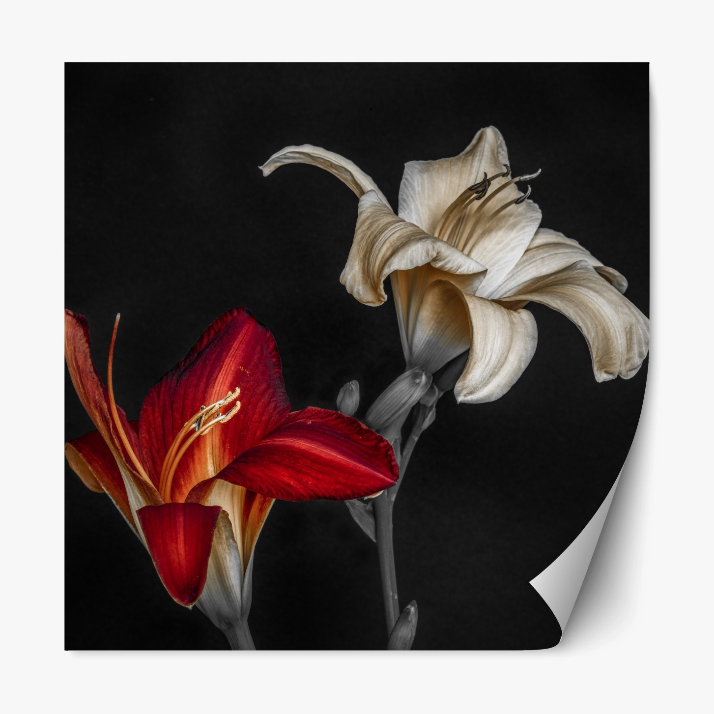 Repositionierbarer Aufkleber Dramatische rote und cremefarbene lilien auf schwarzem hintergrund
