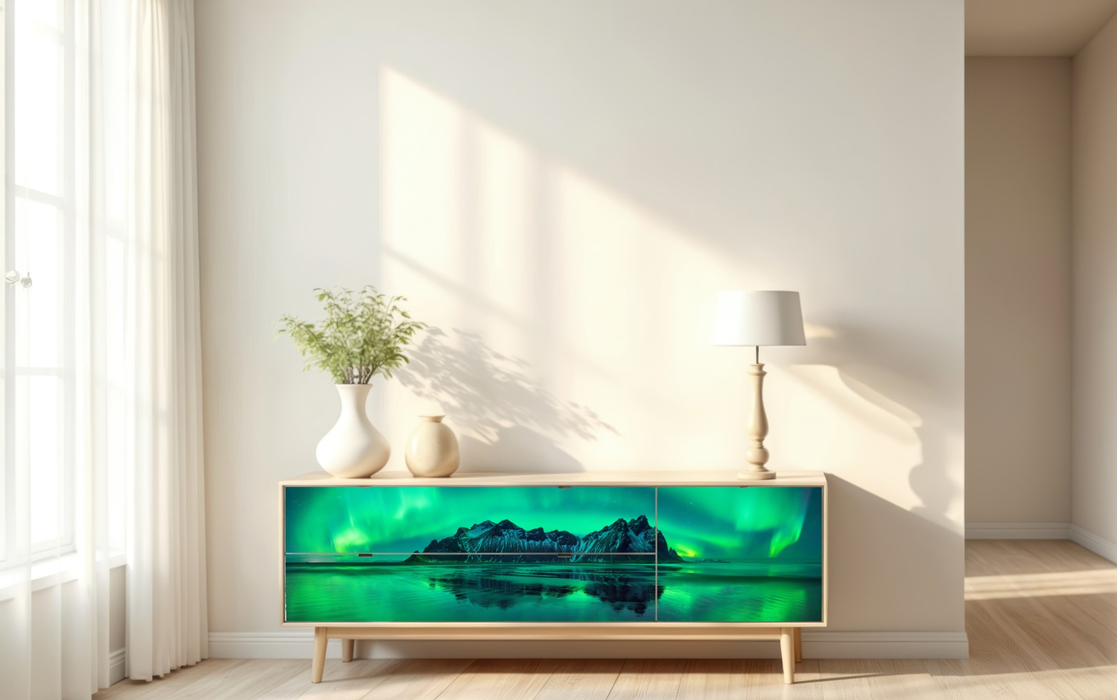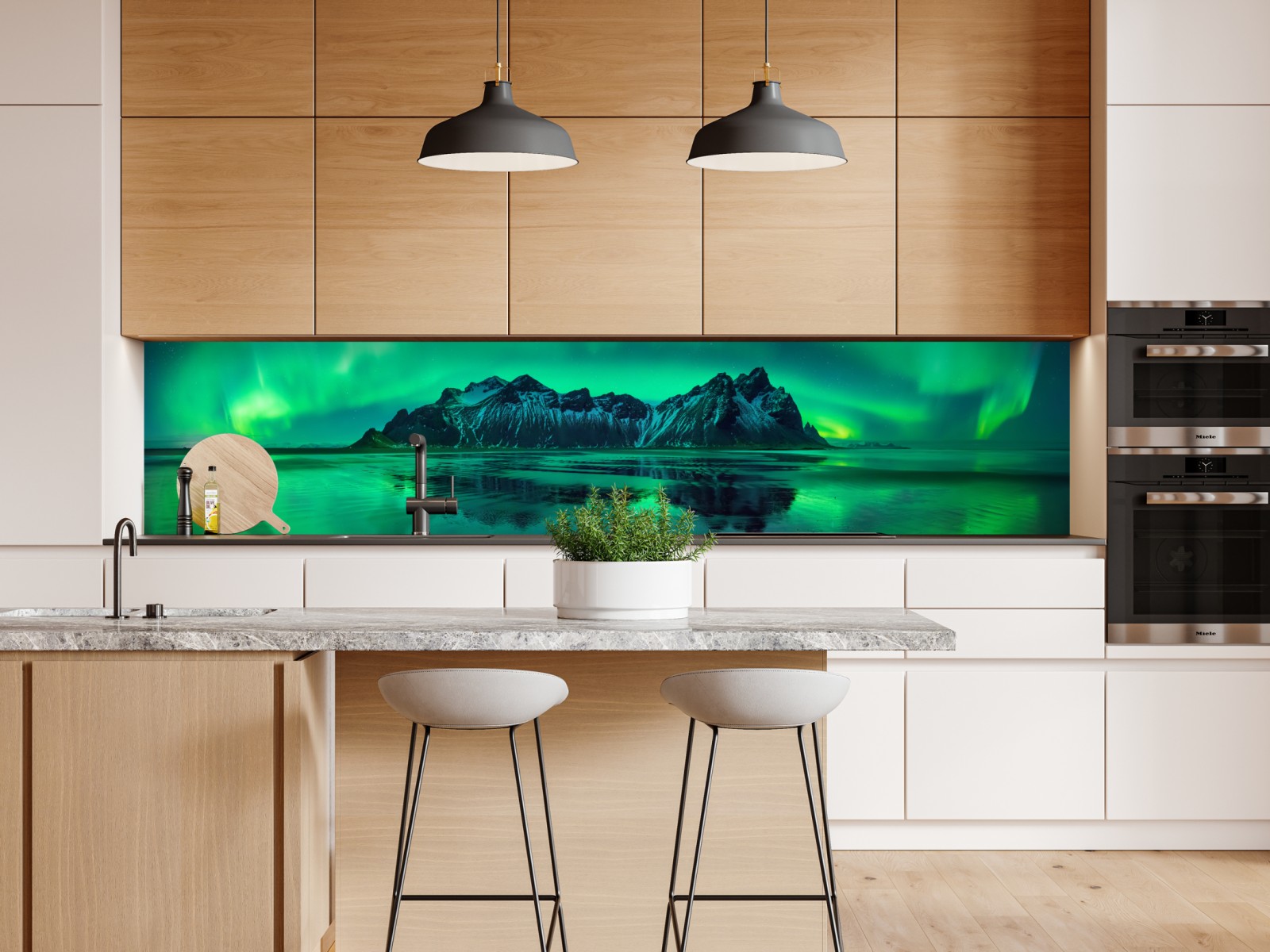 Repositionierbarer Aufkleber Nordlicht über Vestrahorn, Stokksnes