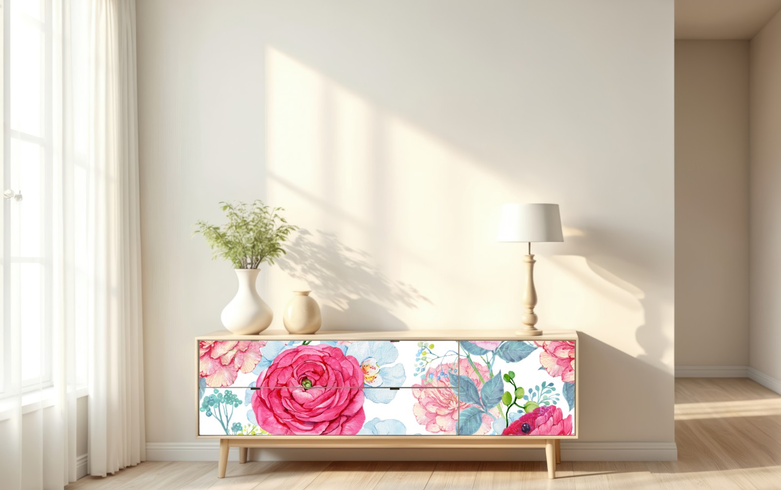 Repositionierbarer Aufkleber Rosa aquarell blumengarten mit kolibri