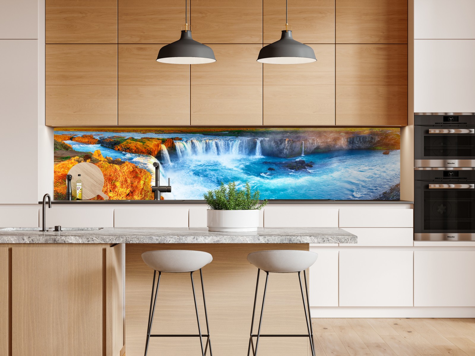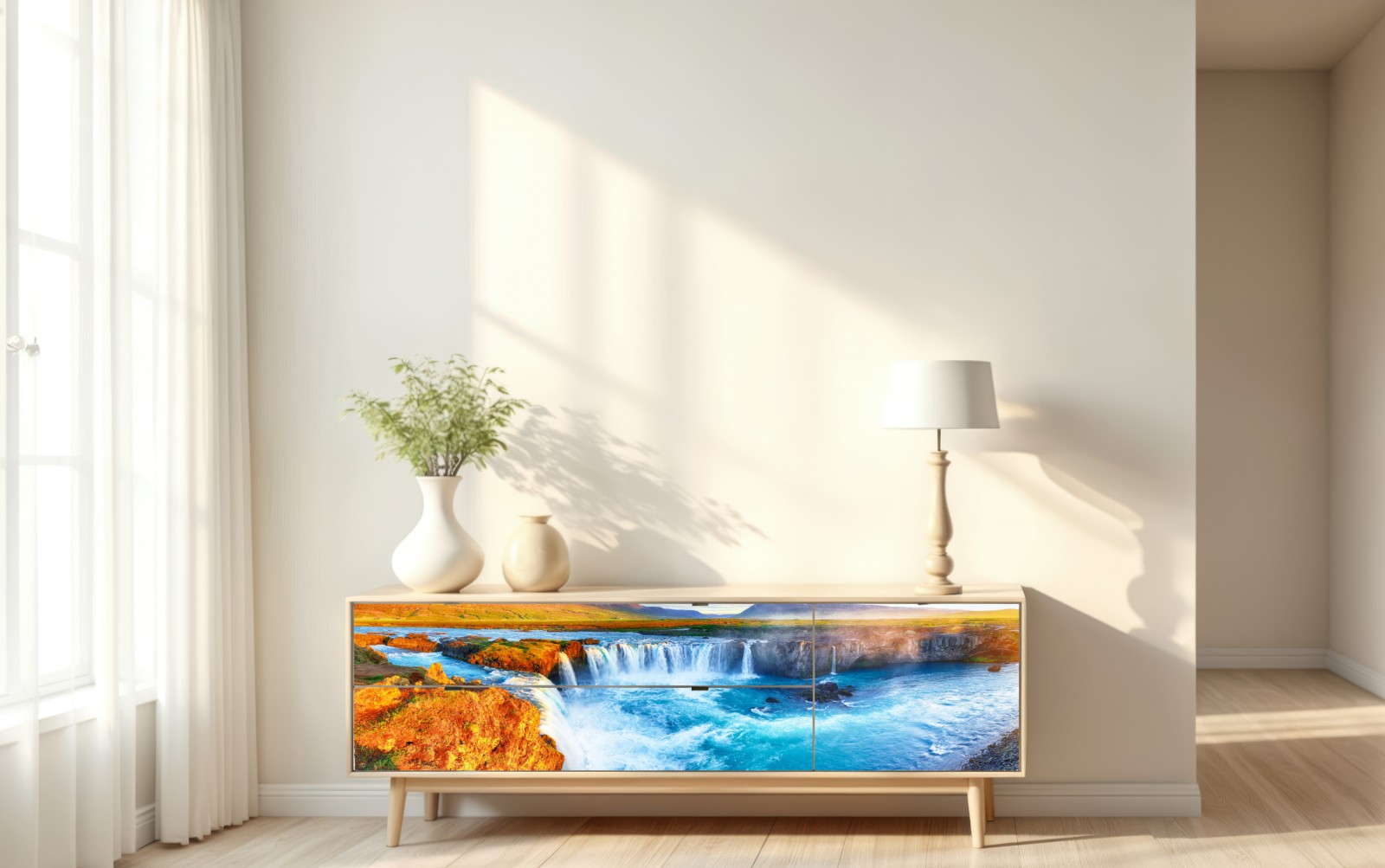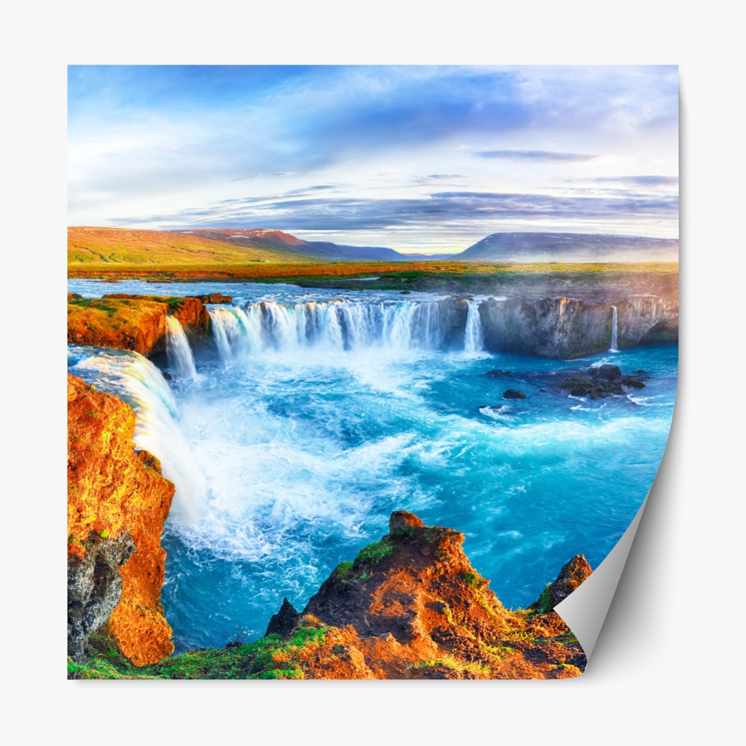 Repositionierbarer Aufkleber Panorama des wasserfalls Godafoss bei sonnenaufgang