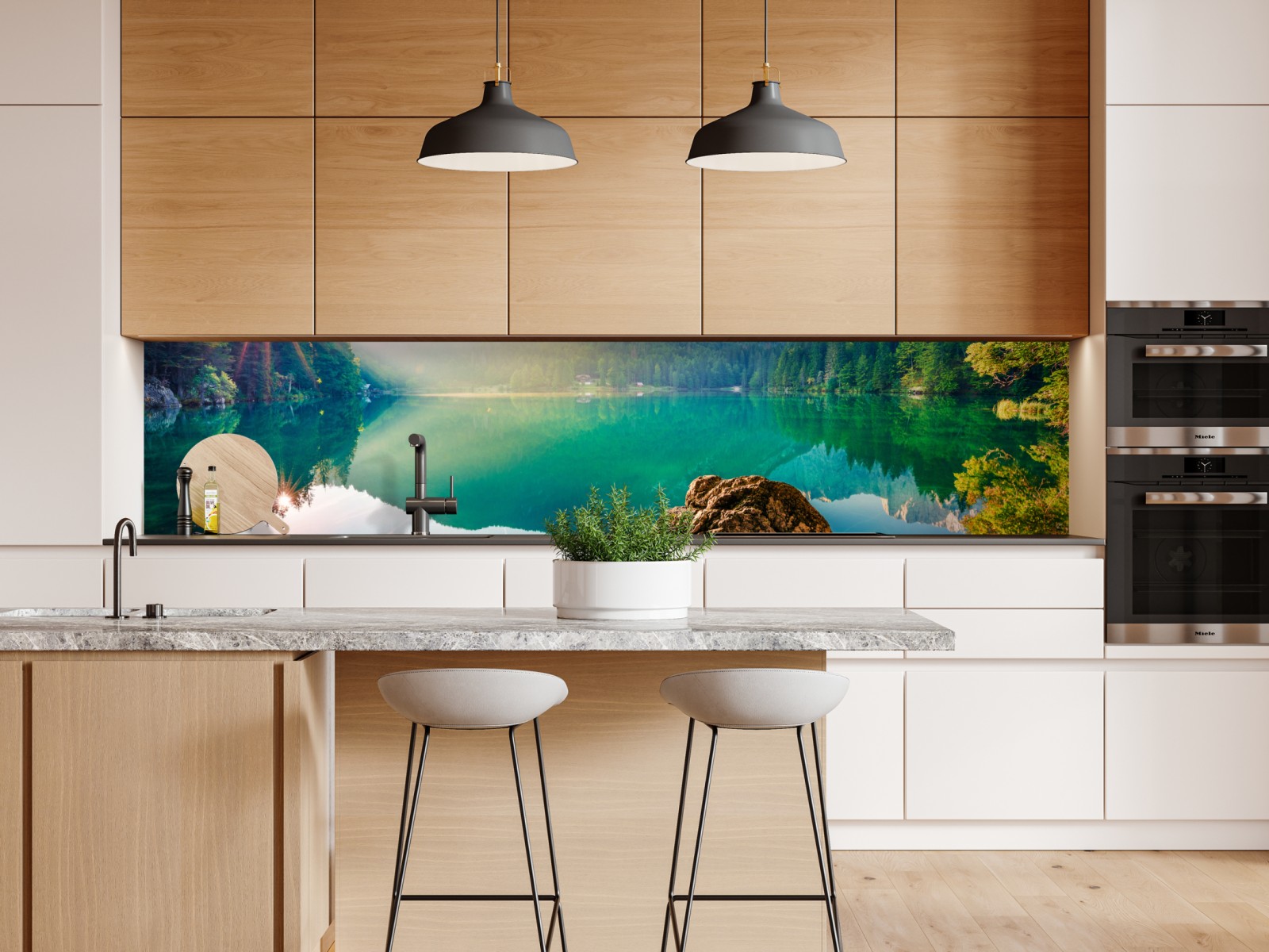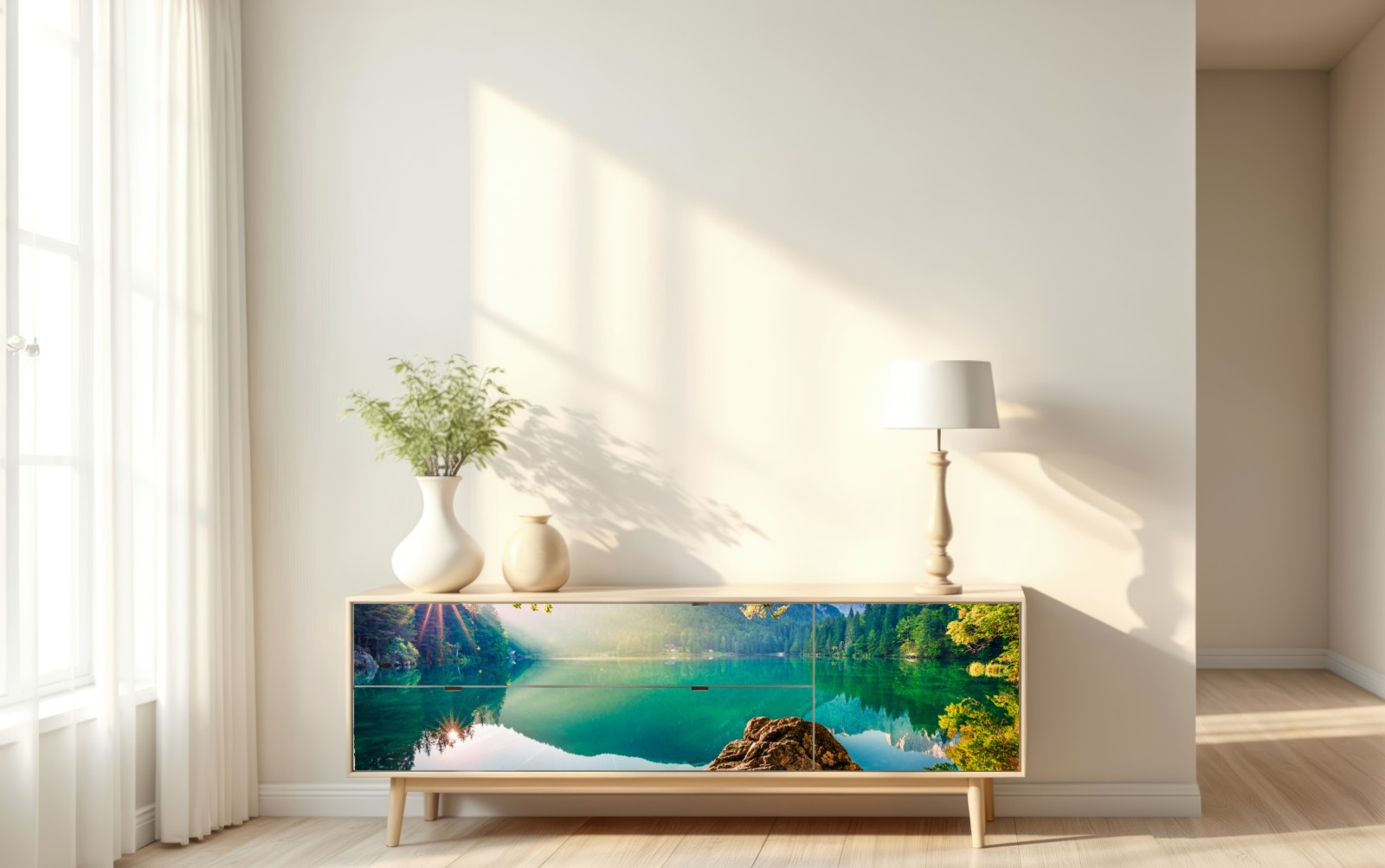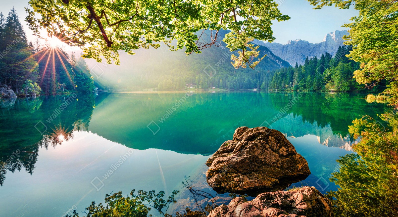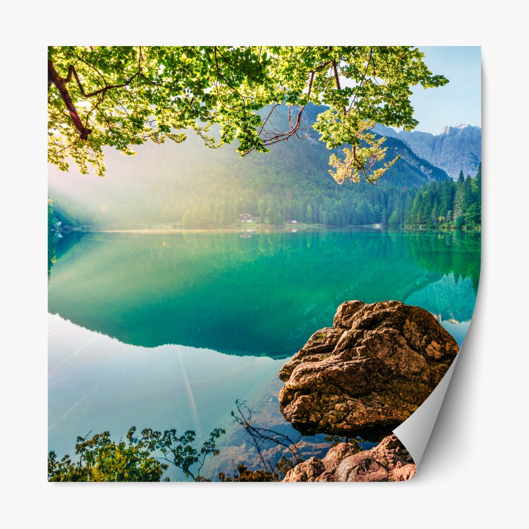 Repositionierbarer Aufkleber Morgendliche szene am Fusine-see mit Mangart