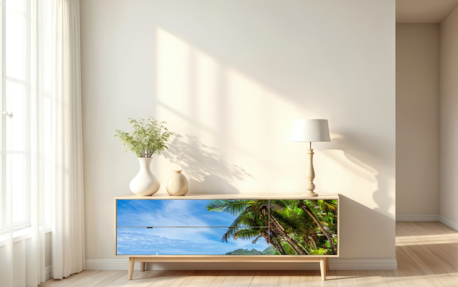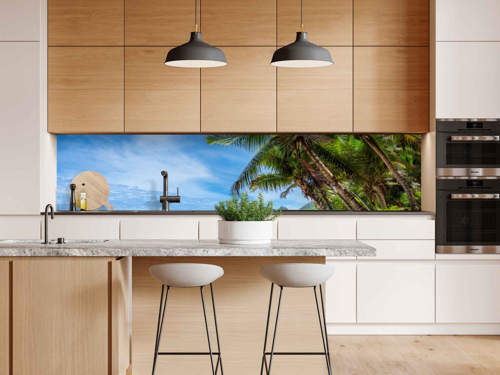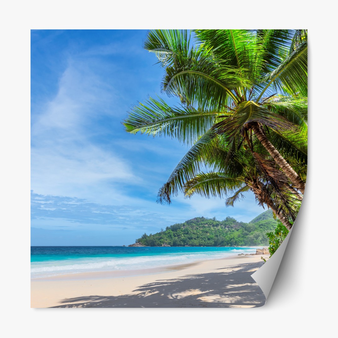 Repositionierbarer Aufkleber Tropischer strand mit palmen und segelboot