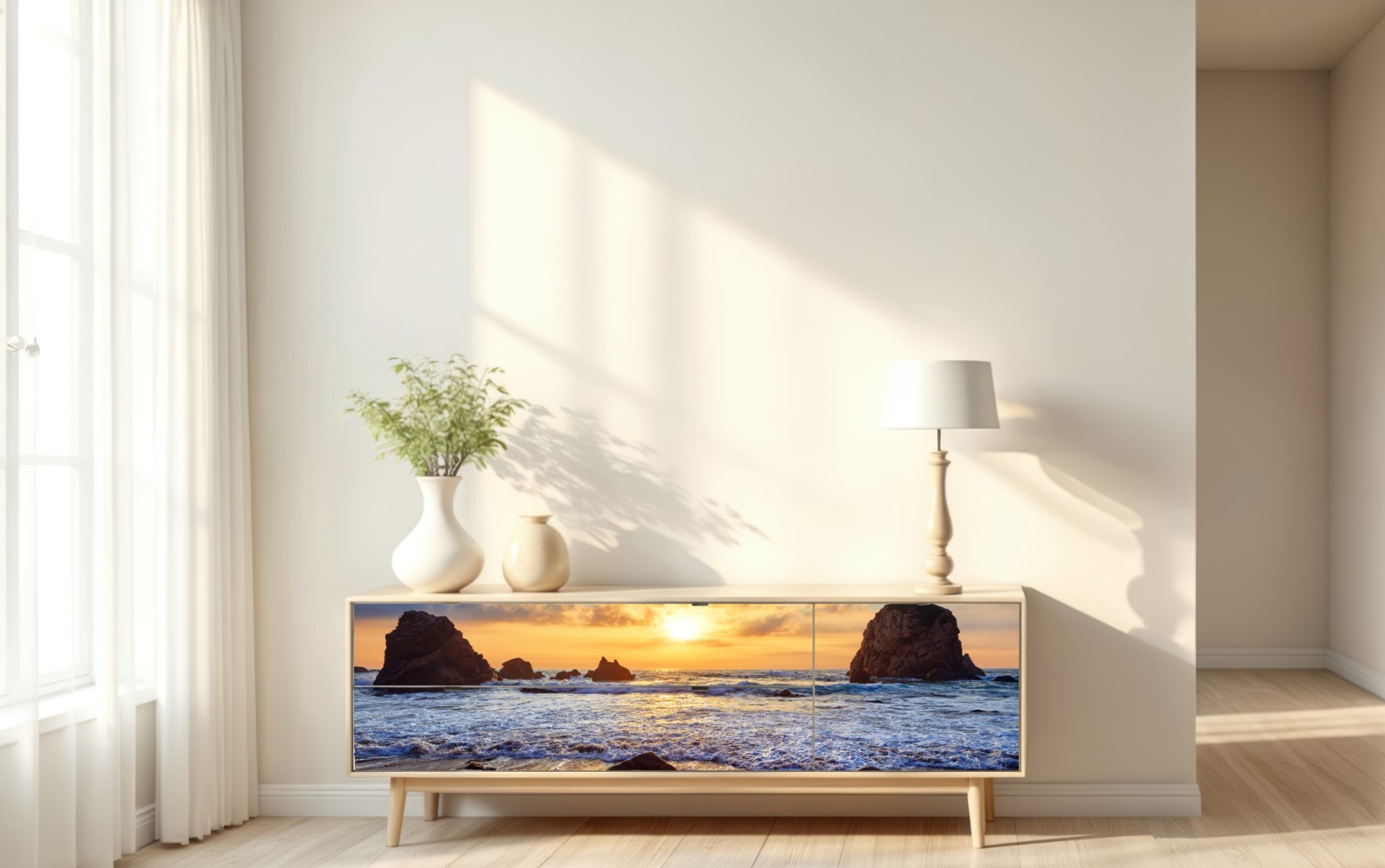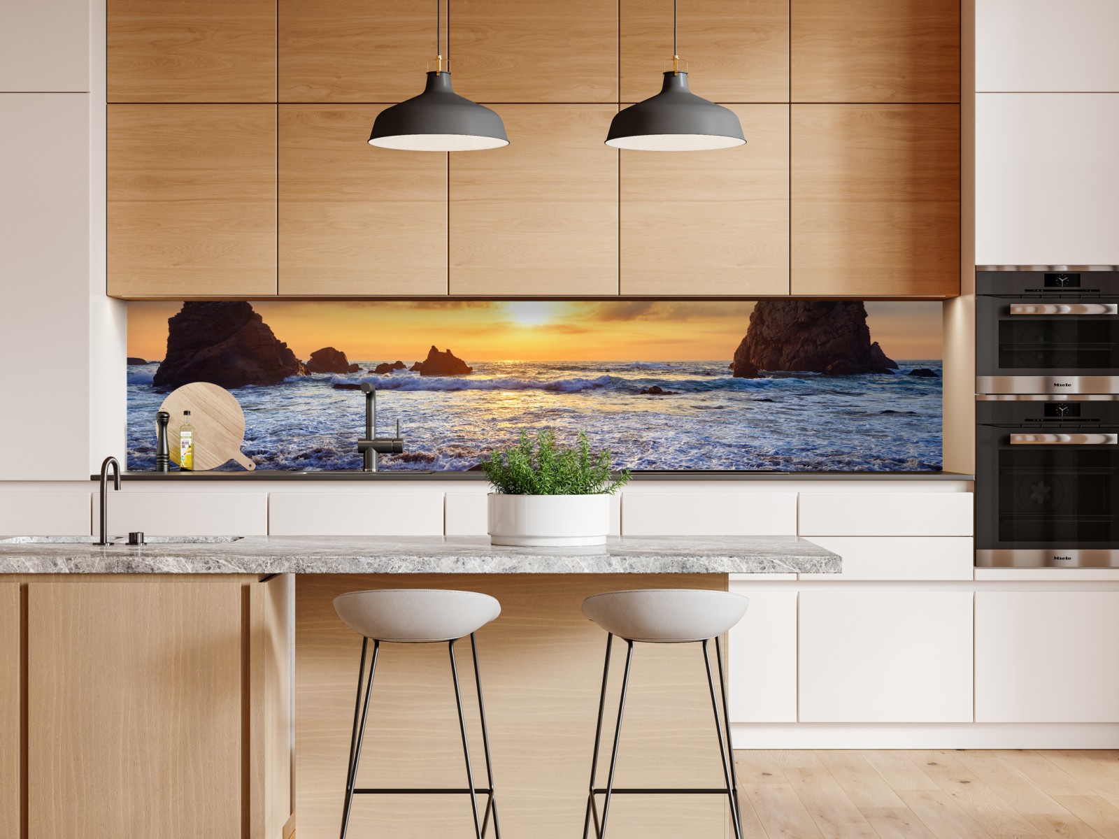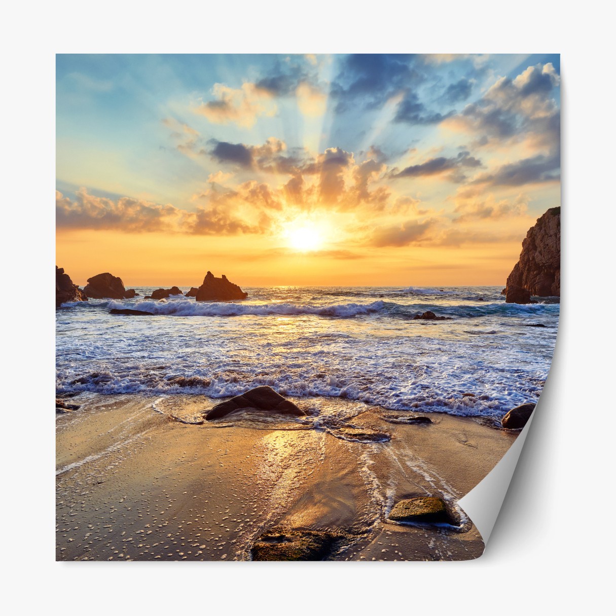 Repositionierbarer Aufkleber Sonnenuntergang an der felsigen küste