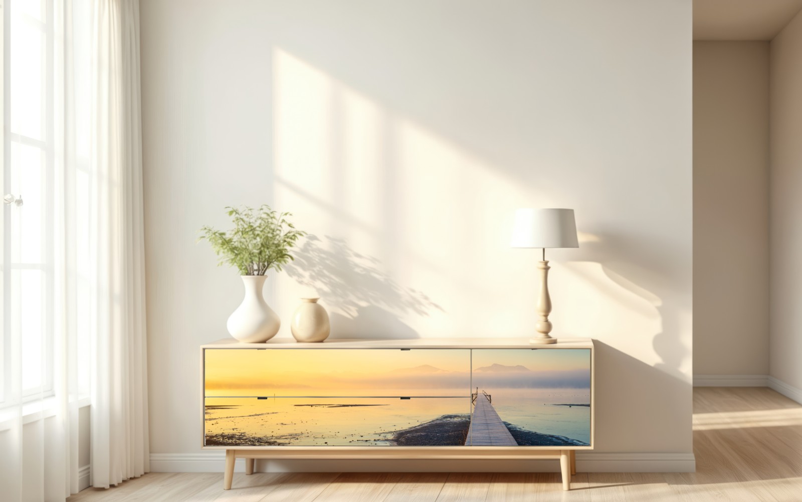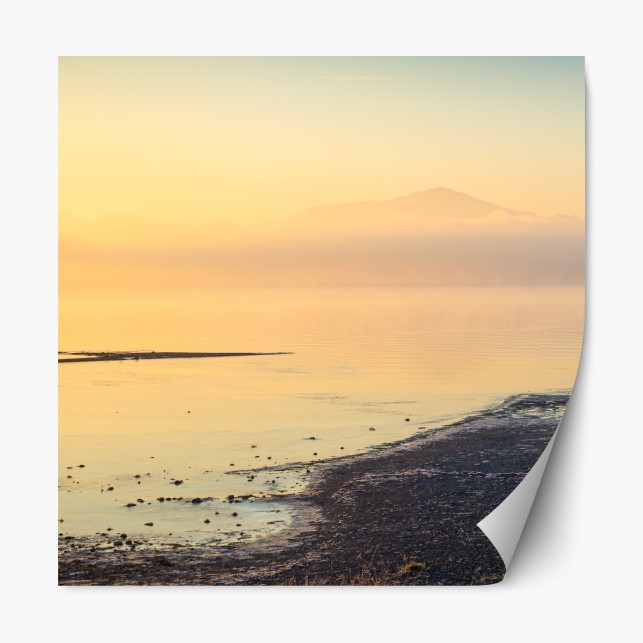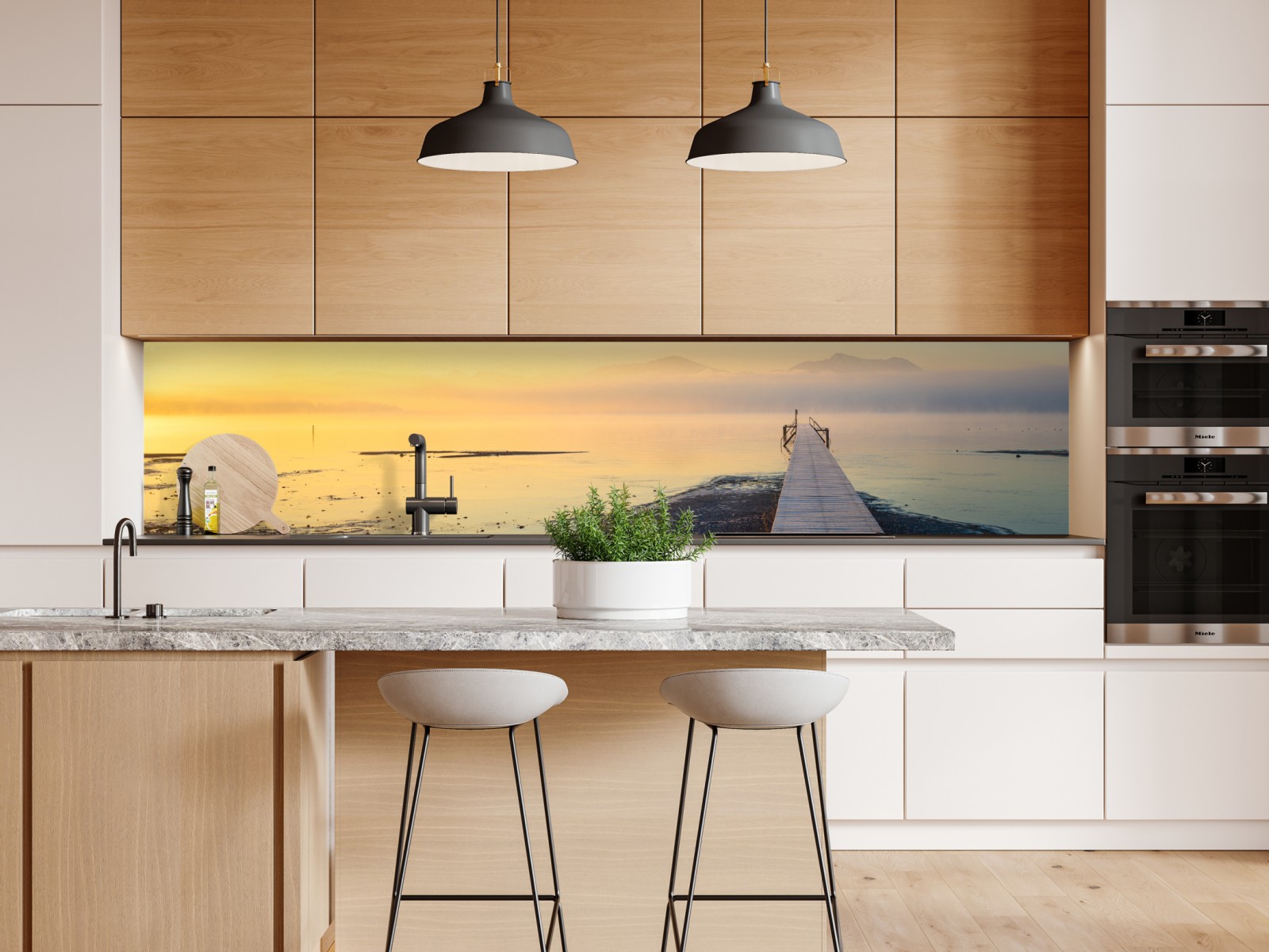 Repositionierbarer Aufkleber Nebliger sonnenaufgang über holzsteg