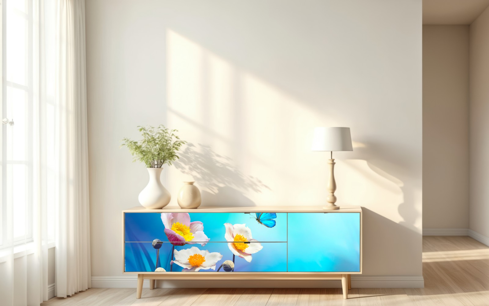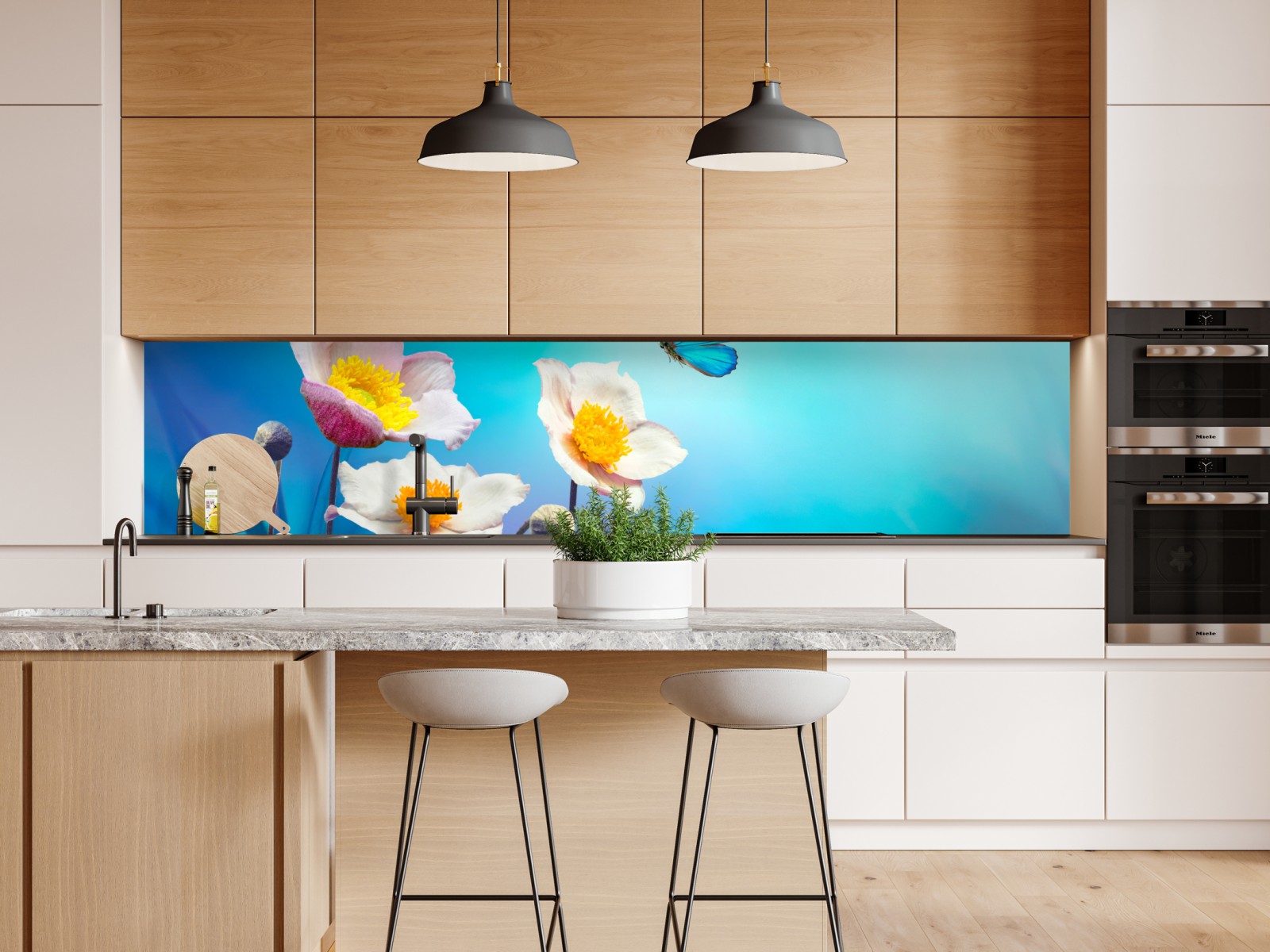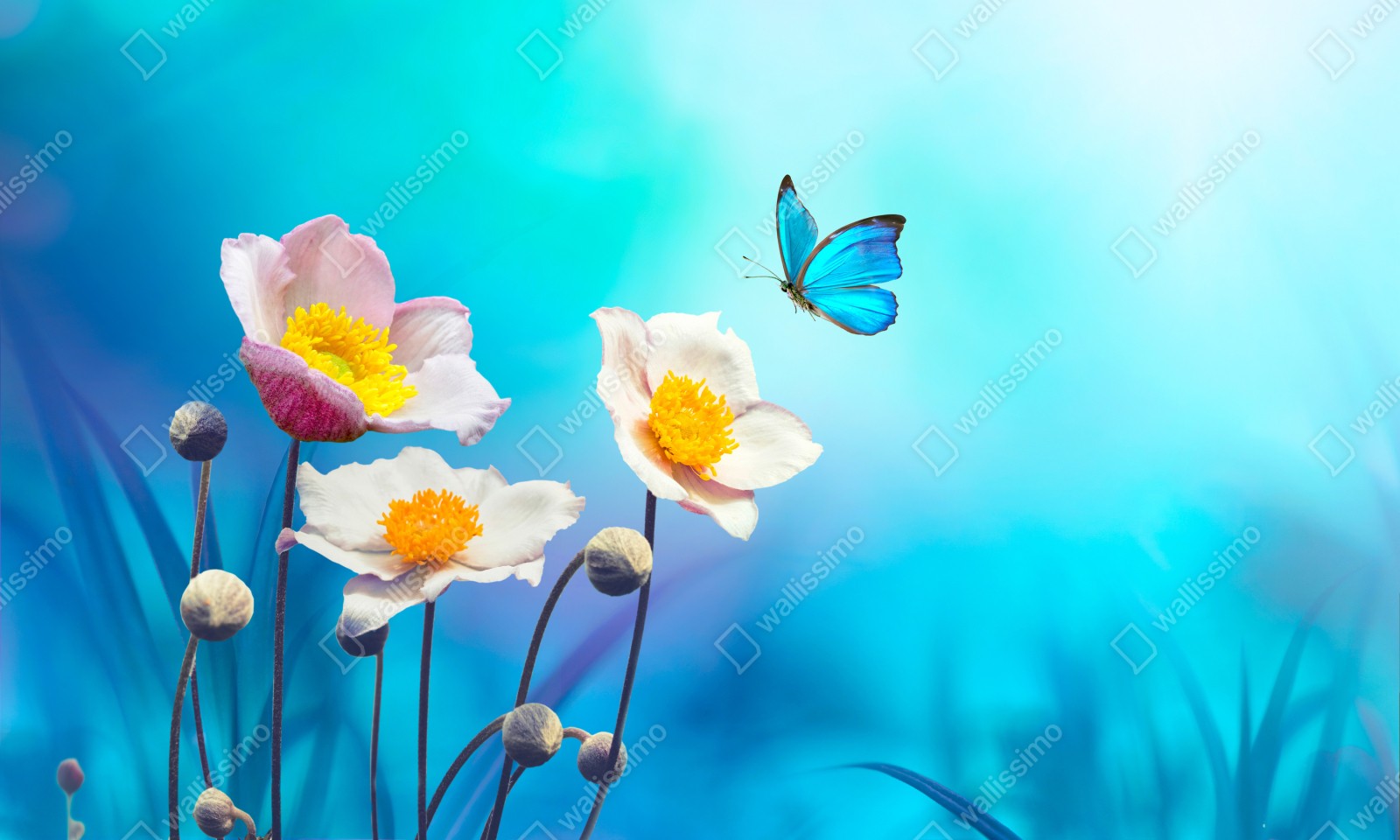 Repositionierbarer Aufkleber Zarte rosa anemonen und blauer schmetterling