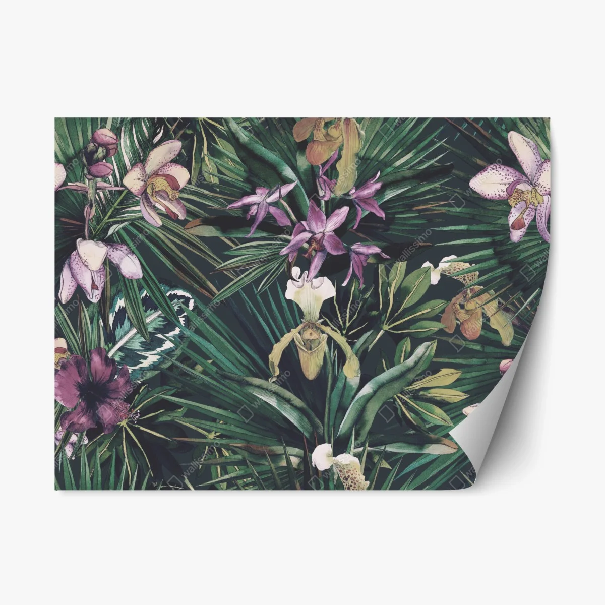 - wandkunst, botanisch, muster, tropisch, blumen, grün, aquarell, palmblätter, orchideen, handgemalt