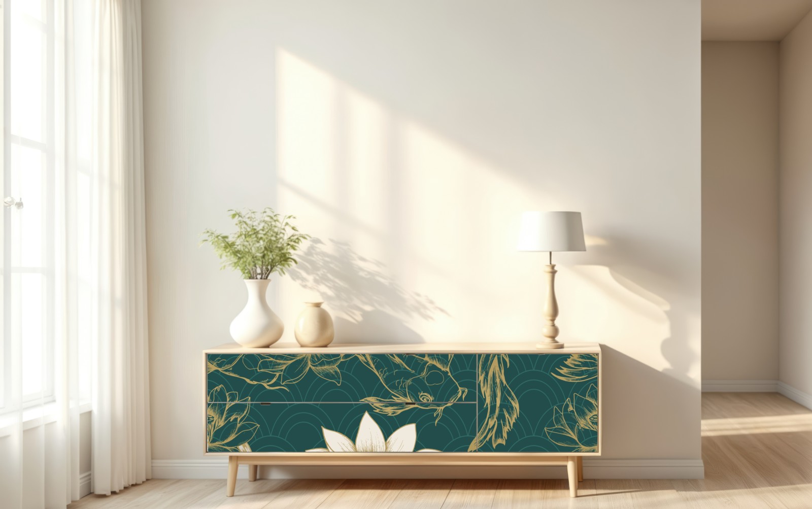 Repositionierbarer Aufkleber Orientalisches koi- und lotosmuster in türkis und gold