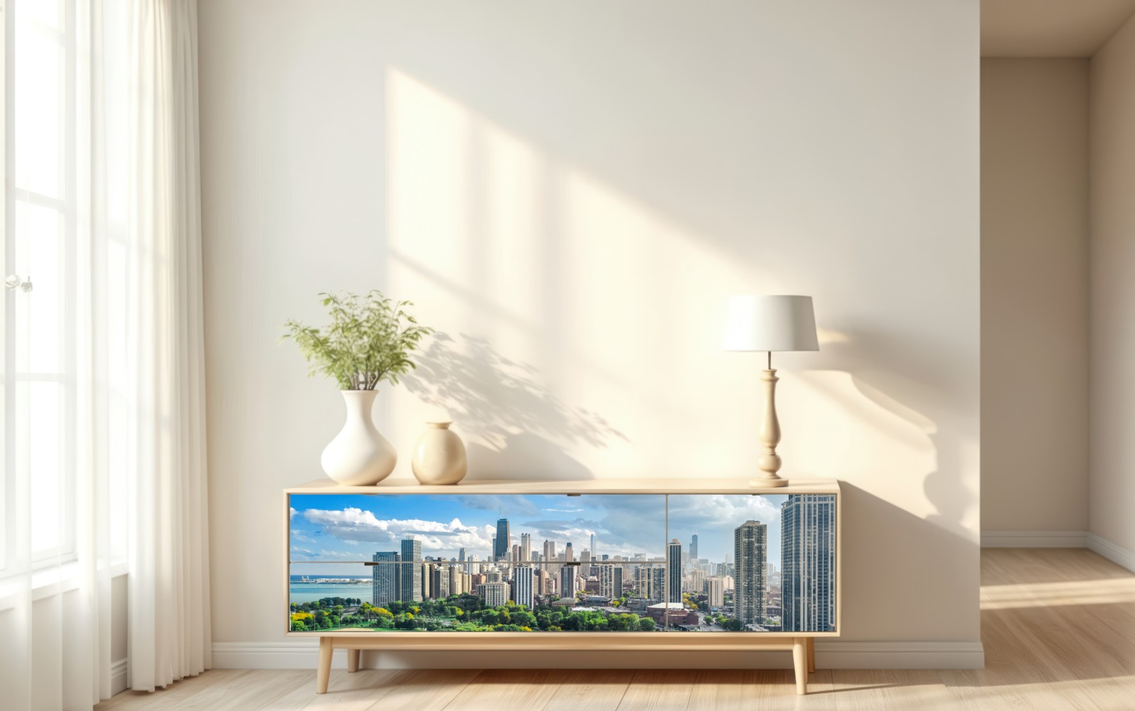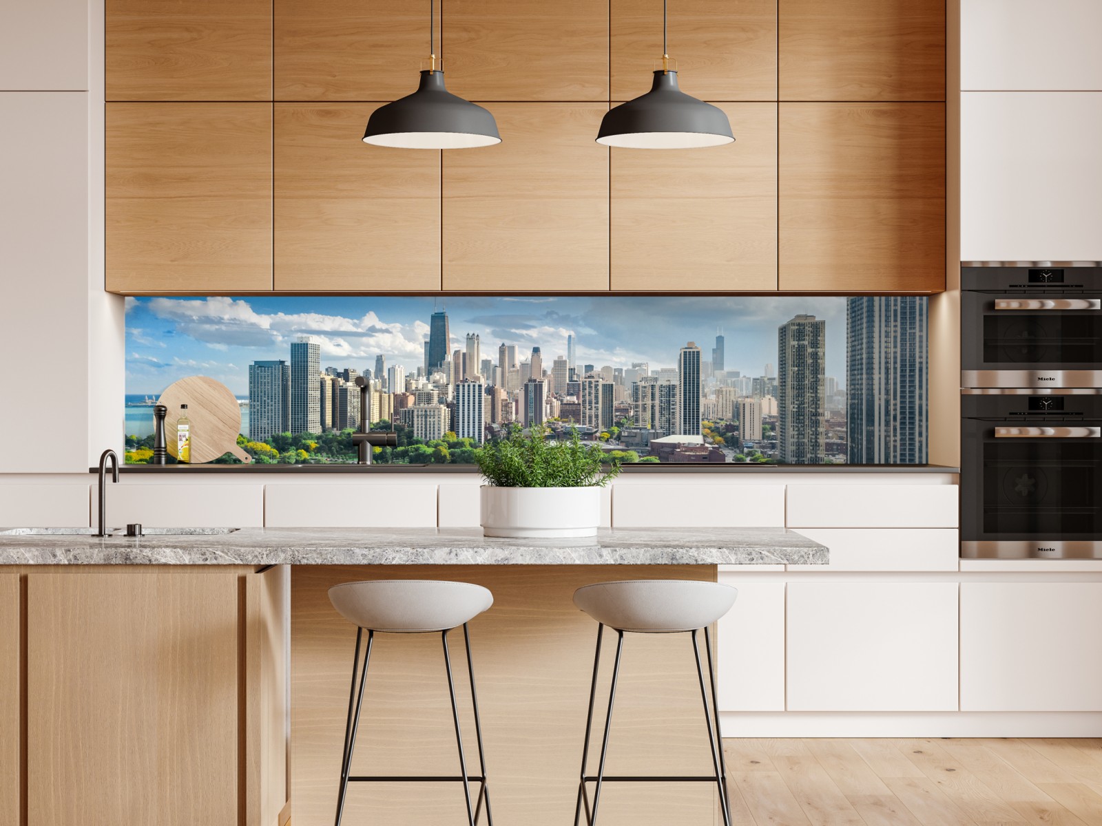 Repositionierbarer Aufkleber Stadtpanorama über grünem park