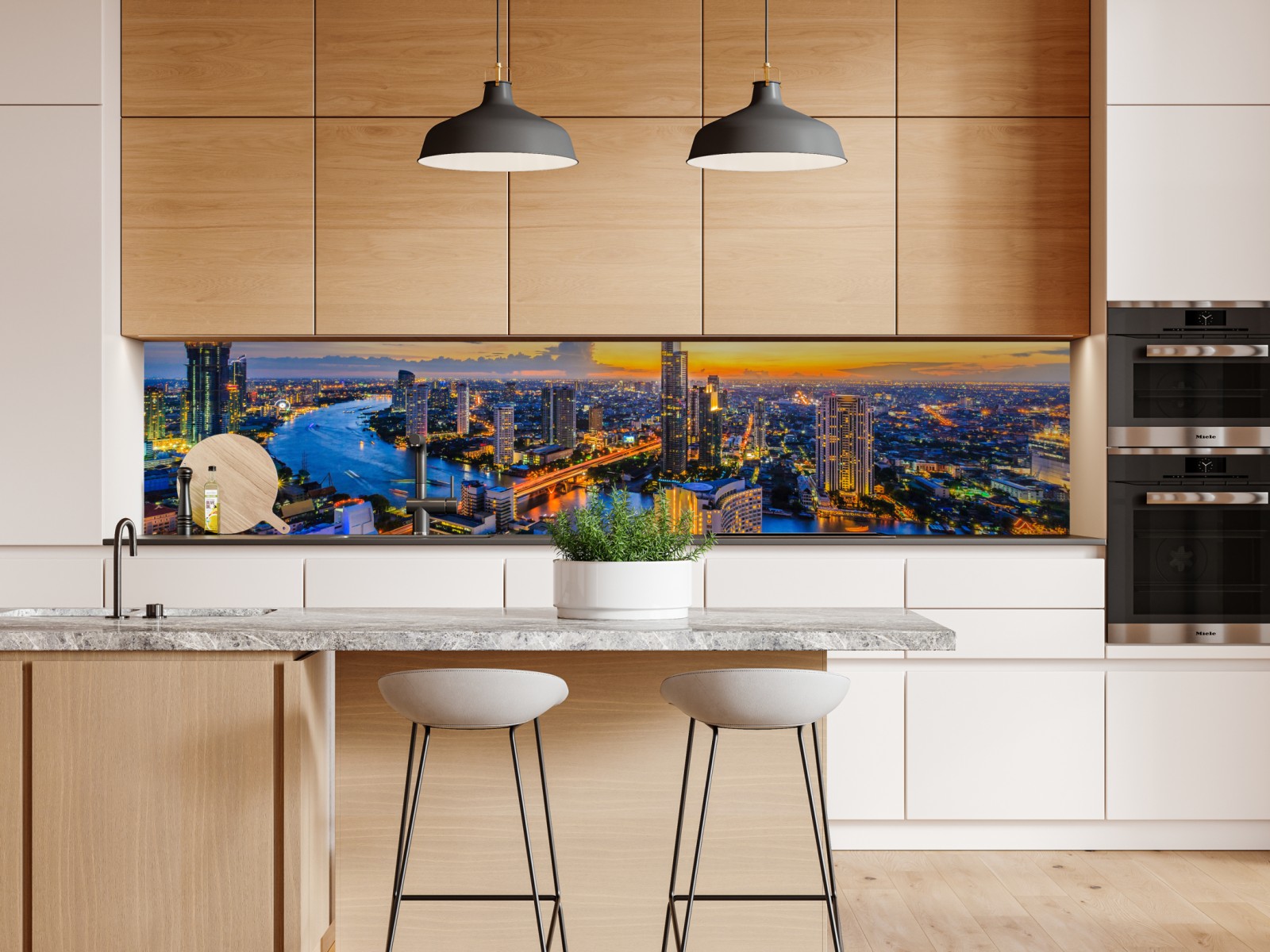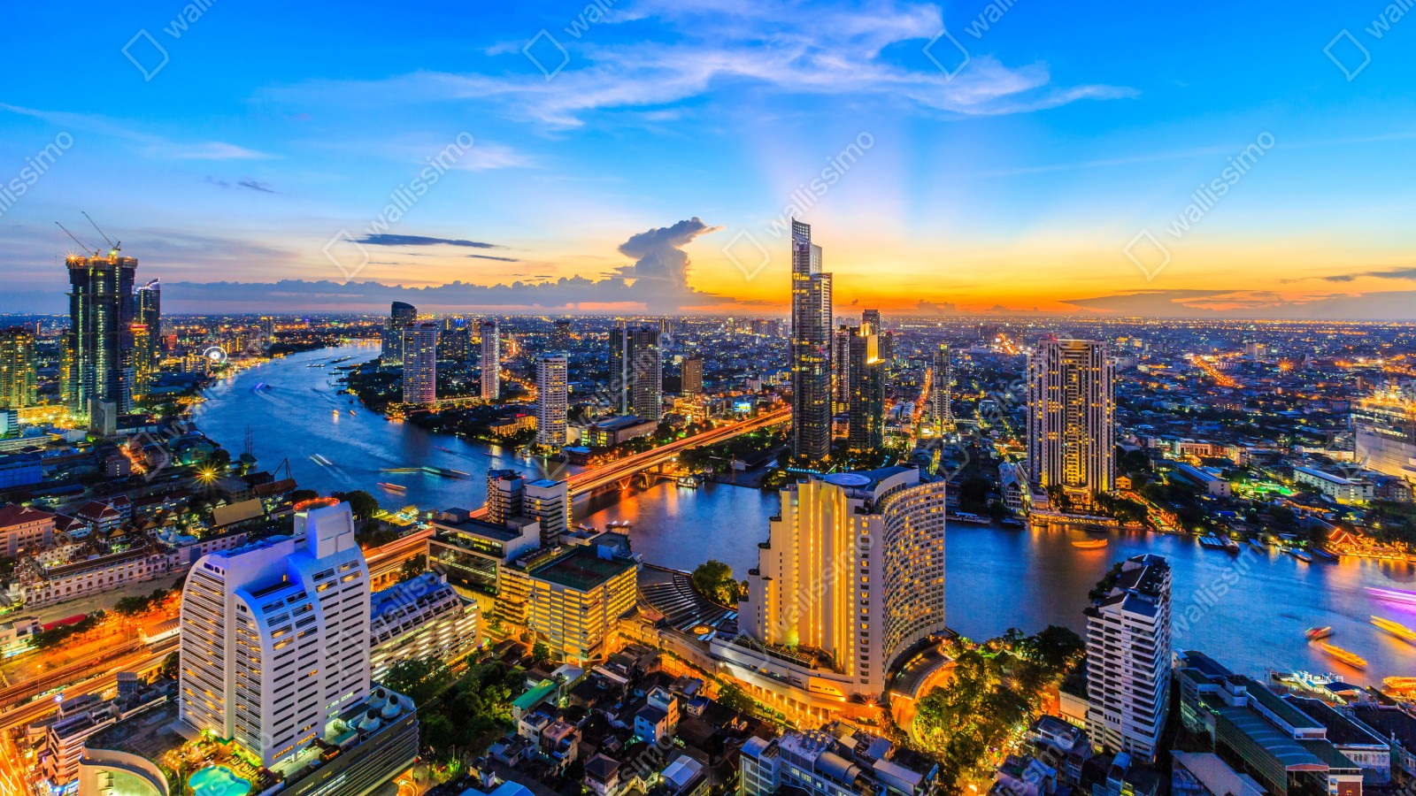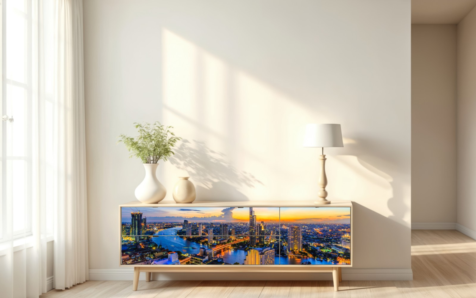 Repositionierbarer Aufkleber Lebendige stadtskyline bei dämmerung