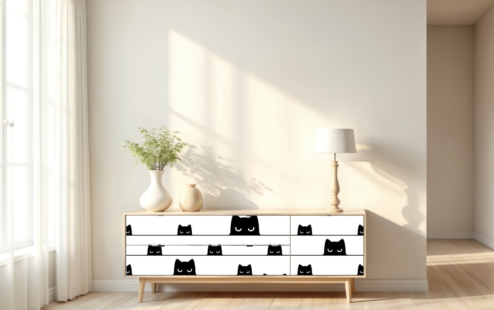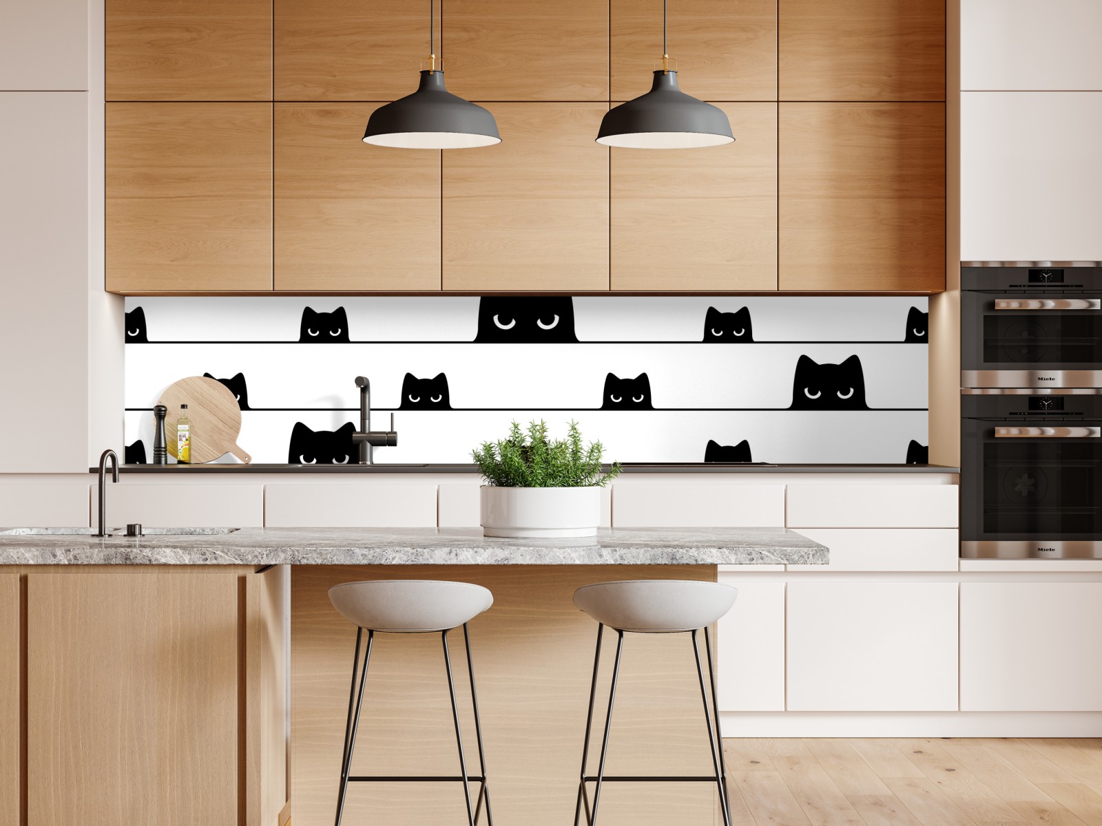 Charmantes minimalistisches Muster mit hervorblickenden Katzensilhouetten in Schwarzweiß, perfekt für verspielte und moderne Wohnräume.