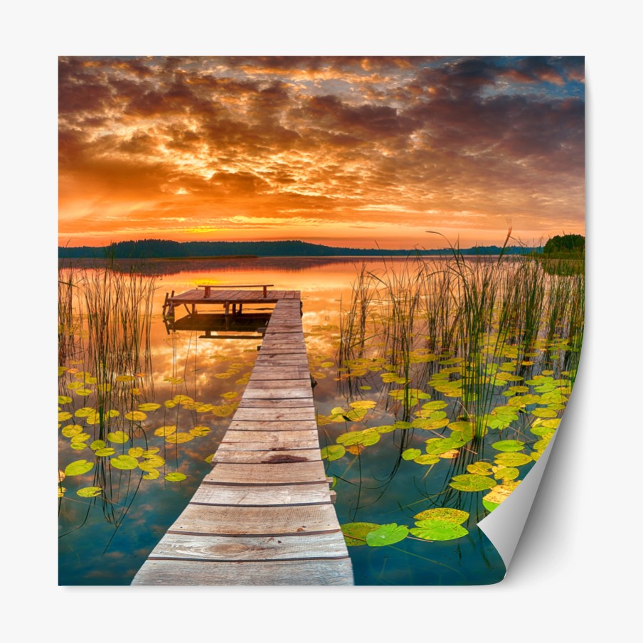 Repositionierbarer Aufkleber Sonnenaufgang über stillem see mit hölzernem steg