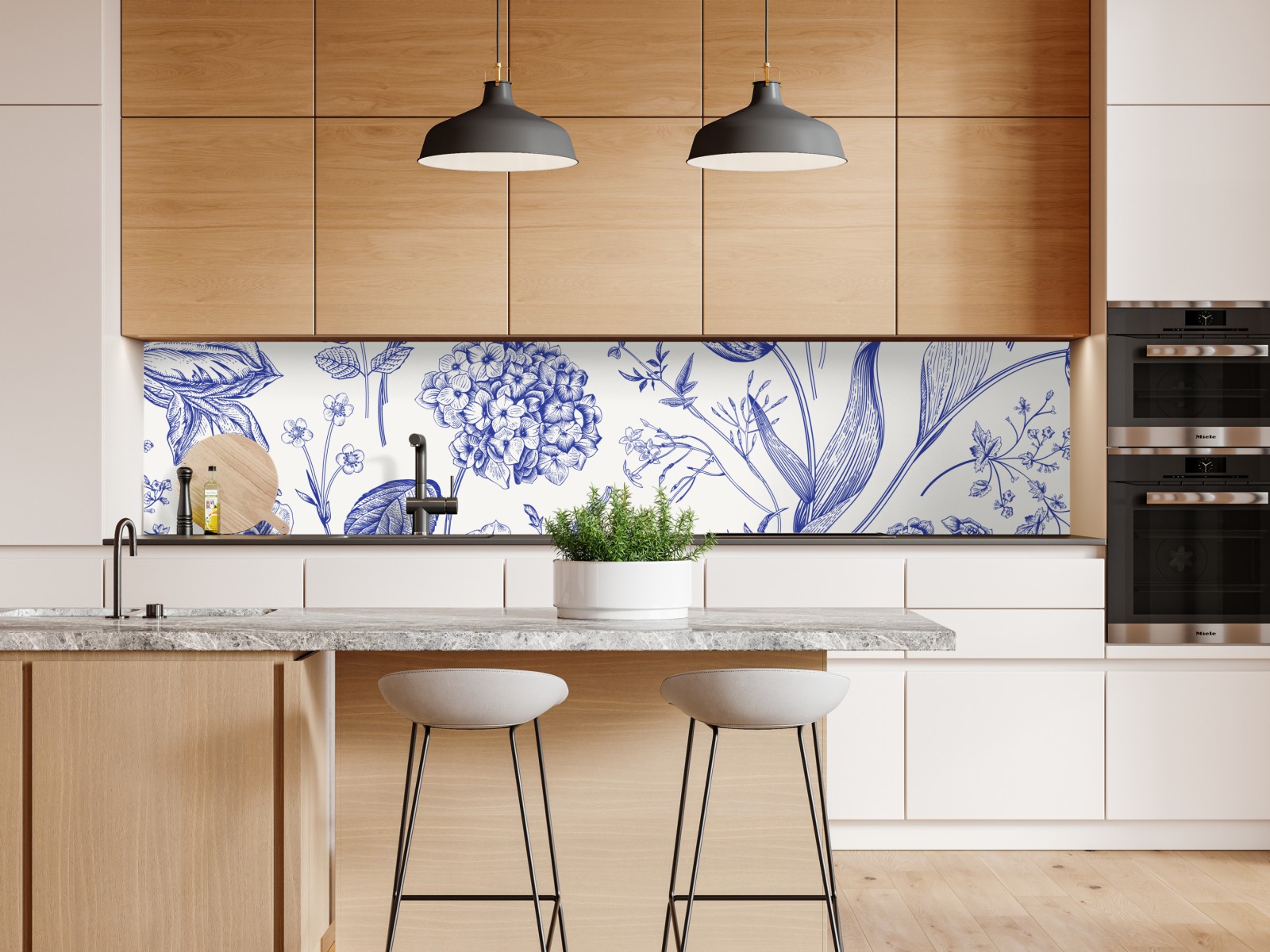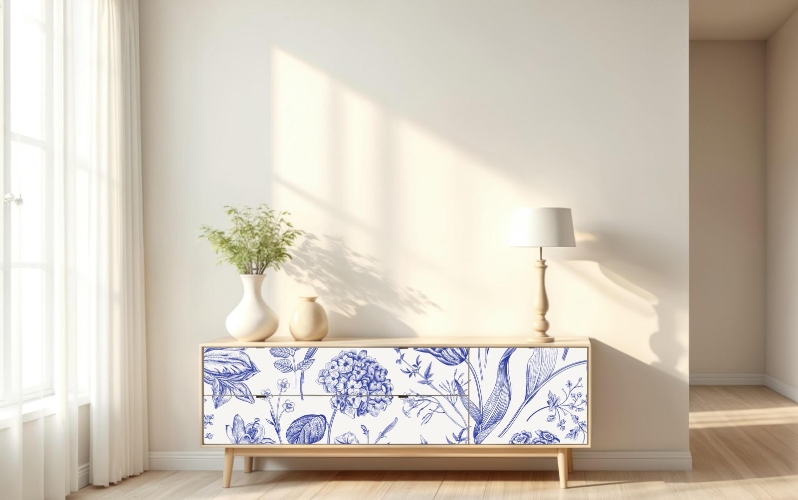 Elegantes blau-weißes toile mit detaillierten botanischen Skizzen bringt zeitlosen Vintage-Charme ins Interieur.