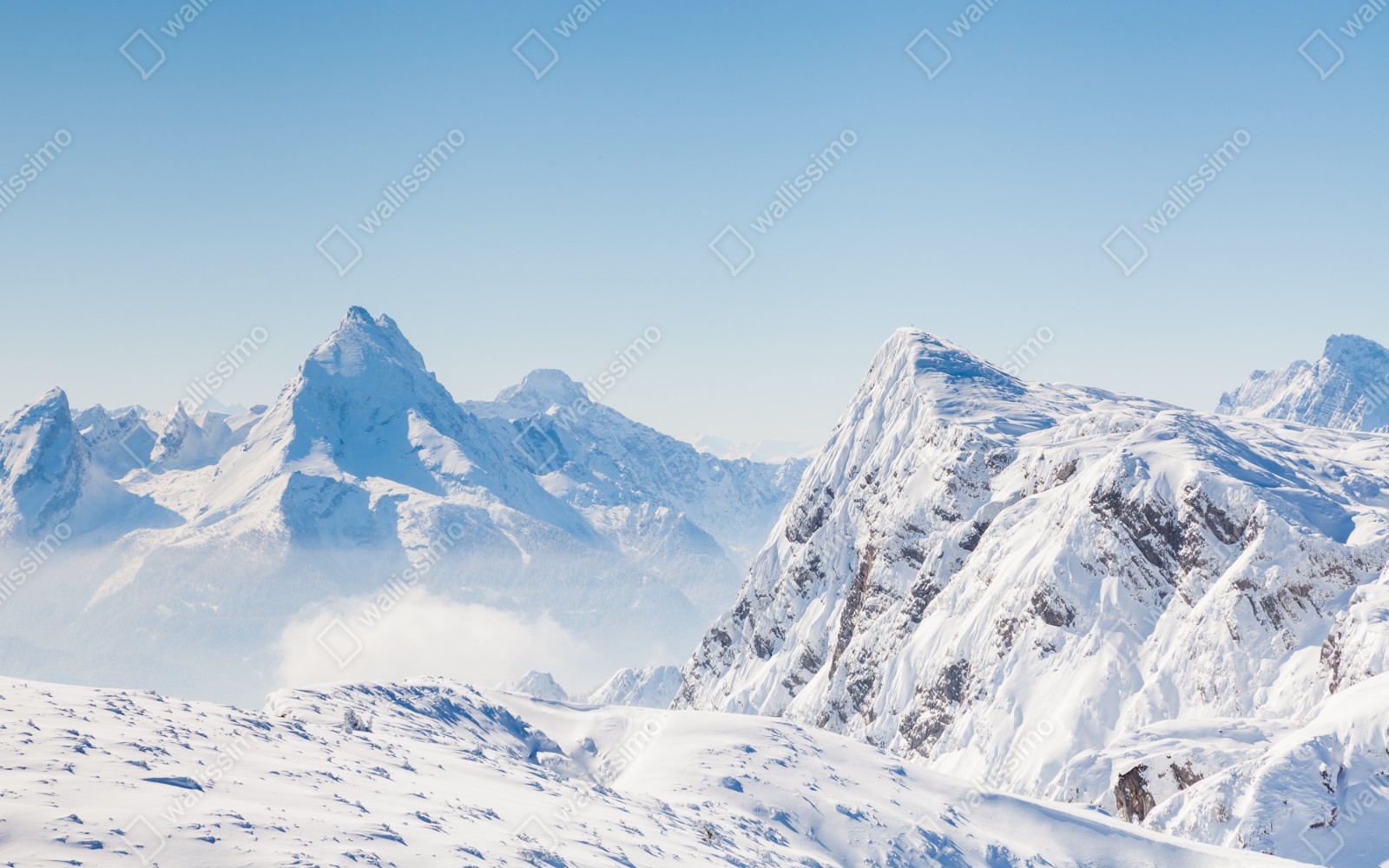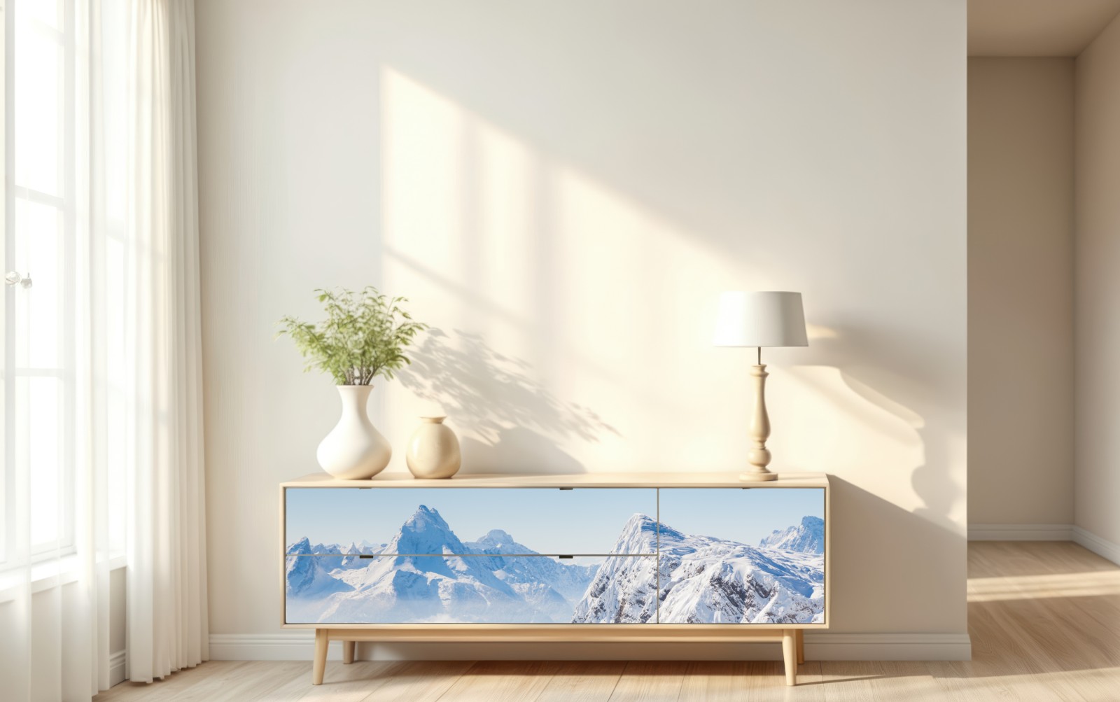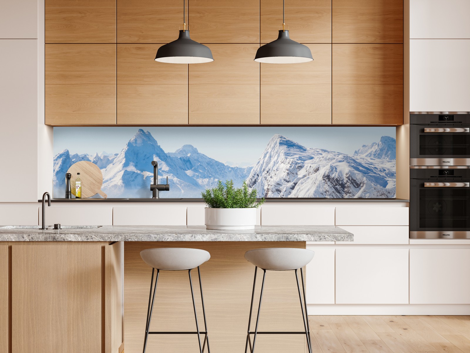 Ein ruhiges Panorama verschneiter Berge bringt frische, alpine Atmosphäre und Weite an Ihre Wände.