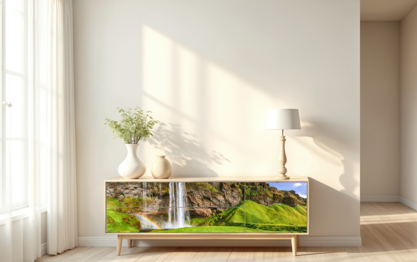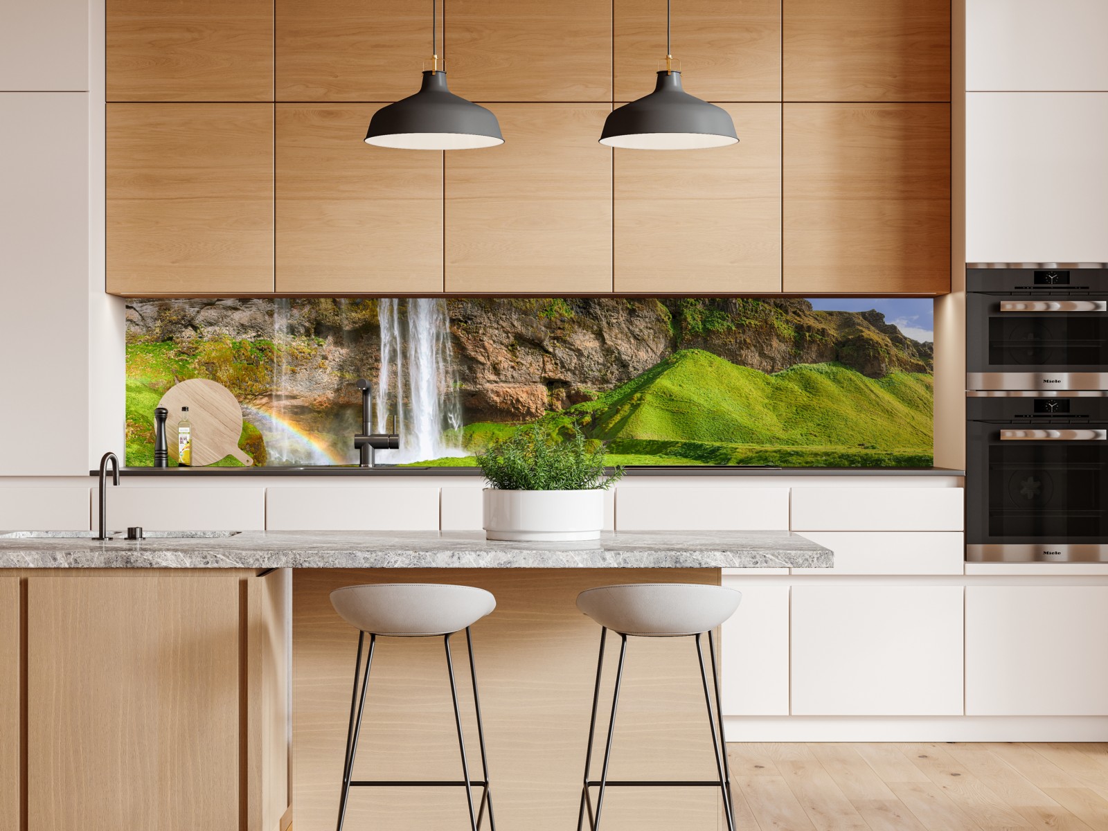 Atemberaubender Blick auf den Wasserfall Seljalandsfoss mit satten grünen Klippen und einem leuchtenden Regenbogen, perfekt um Natur in Ihr Zuhause zu bringen.