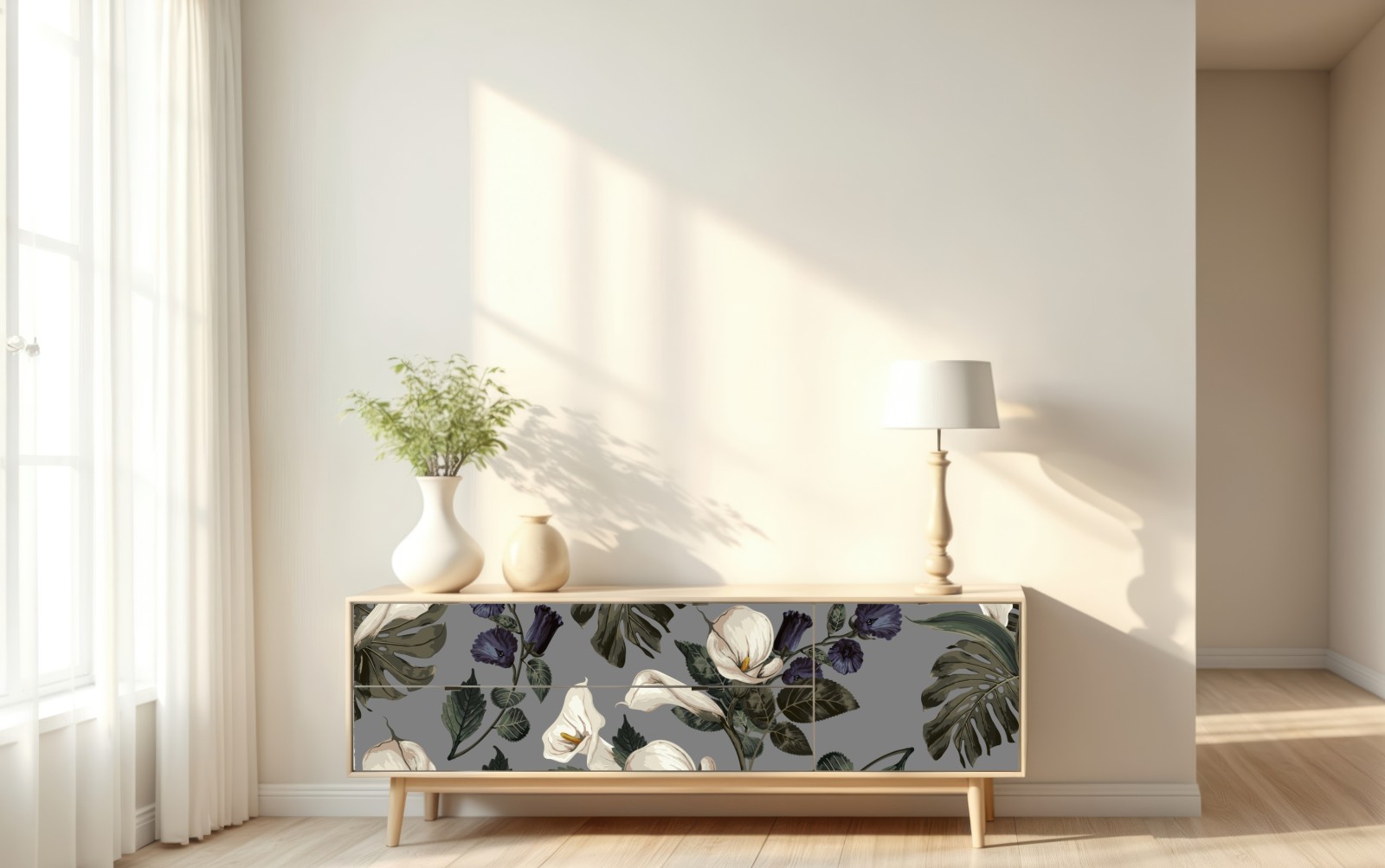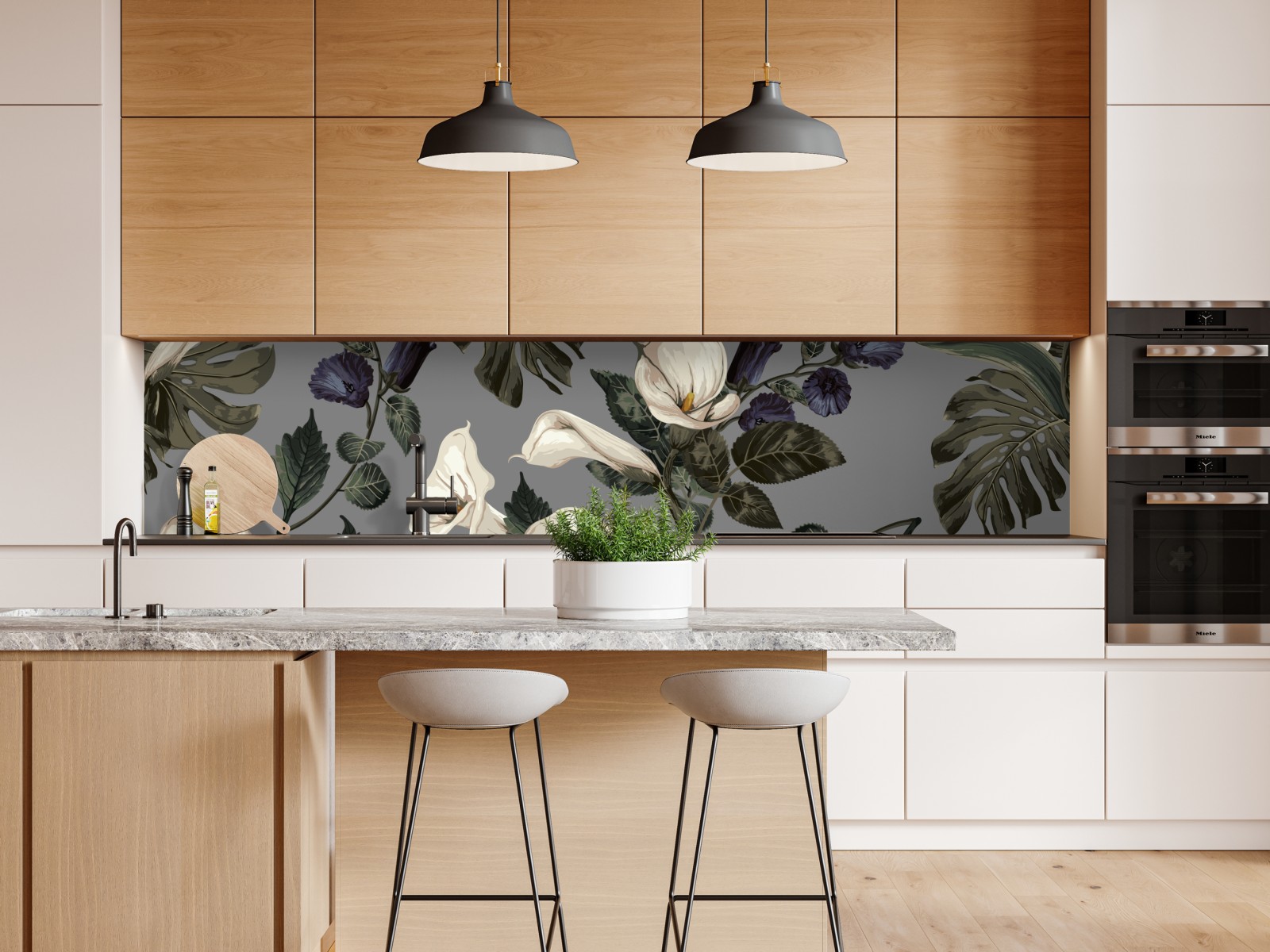 elegantes vintage-blumenmuster mit weißen callas und tief violetten blüten auf einem gedämpften grauen hintergrund, ideal um dem schlafzimmer eine anspruchsvolle botanische note zu verleihen.
