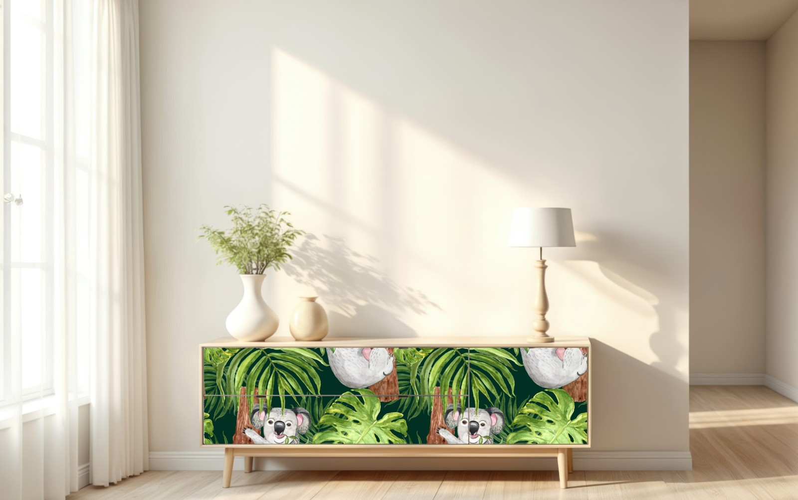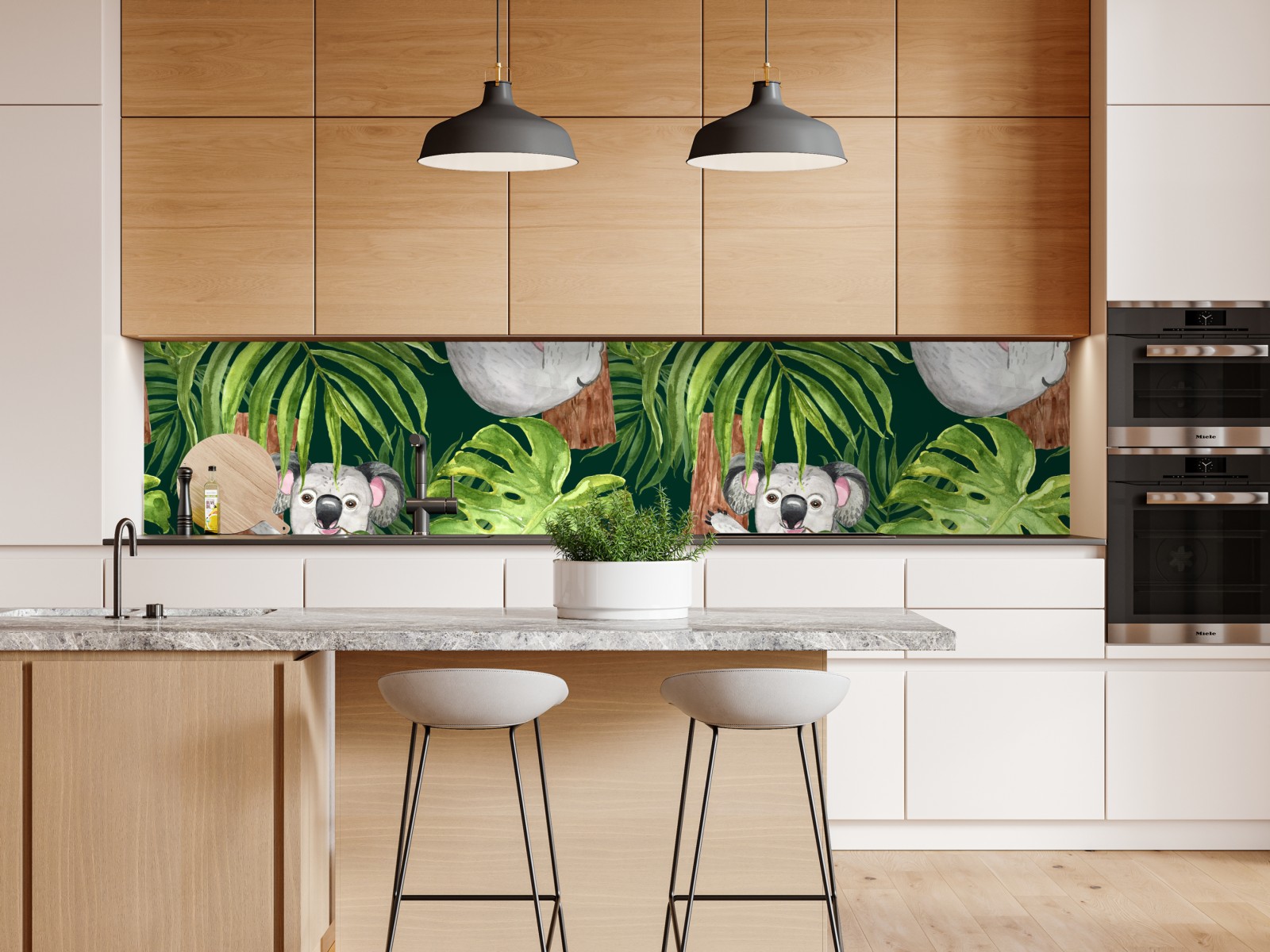 Verspielte Aquarell-Koalas zwischen üppigen tropischen Blättern schaffen ein fröhliches, naturinspiriertes Muster, ideal für Kinderzimmer und Kindergarten.
