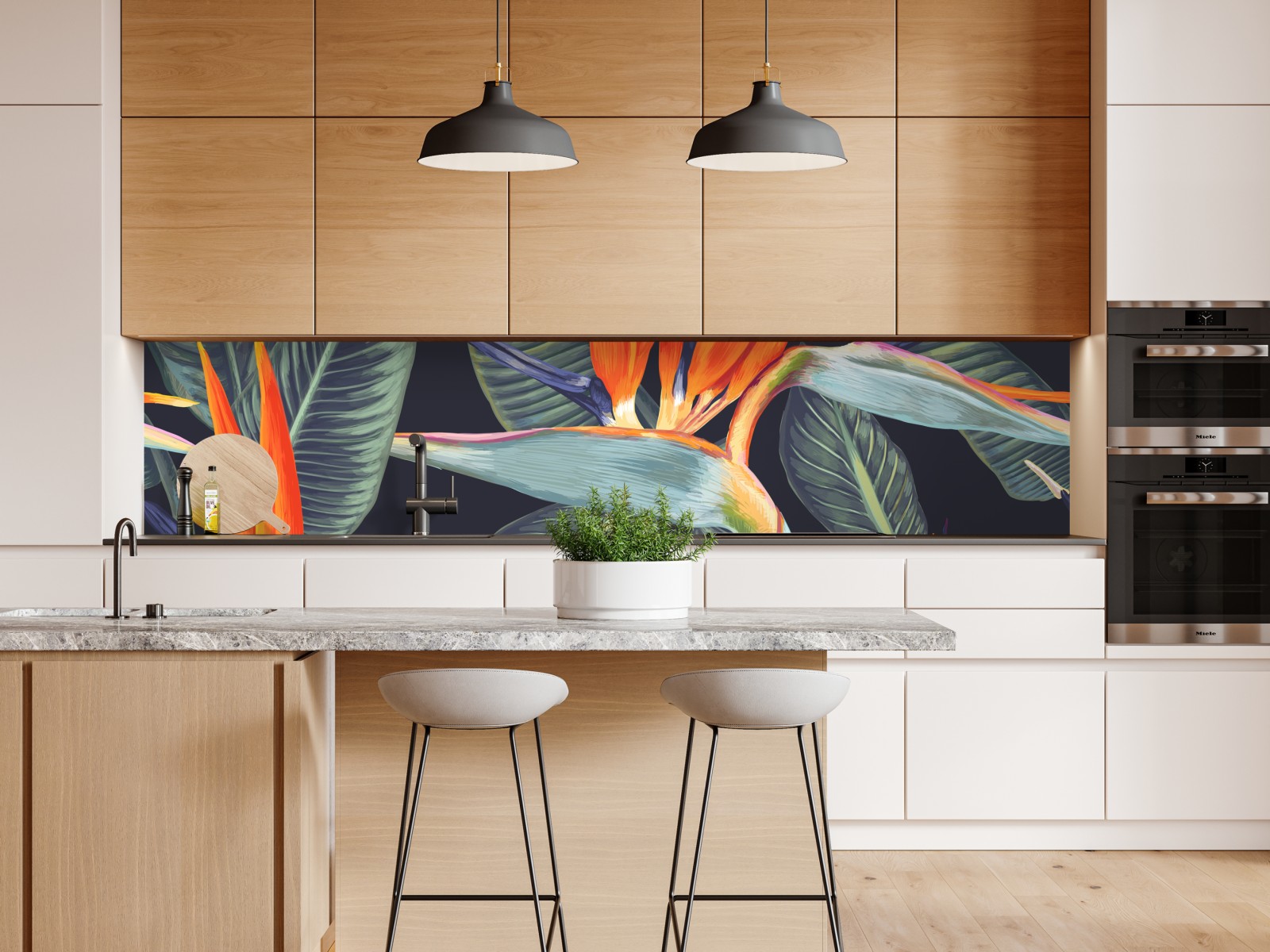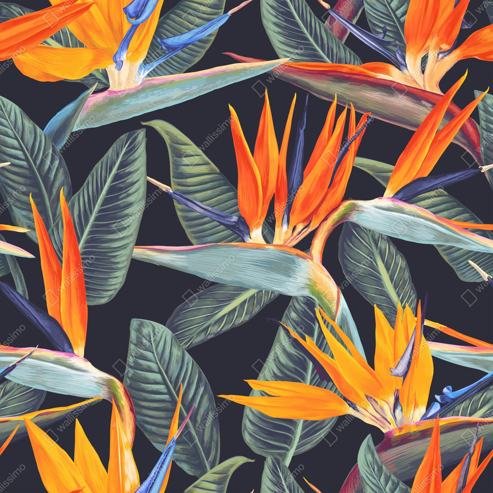 lebendiges tropisches muster mit strelitzien, das exotischen botanischen flair und kräftige farben ins interieur bringt.