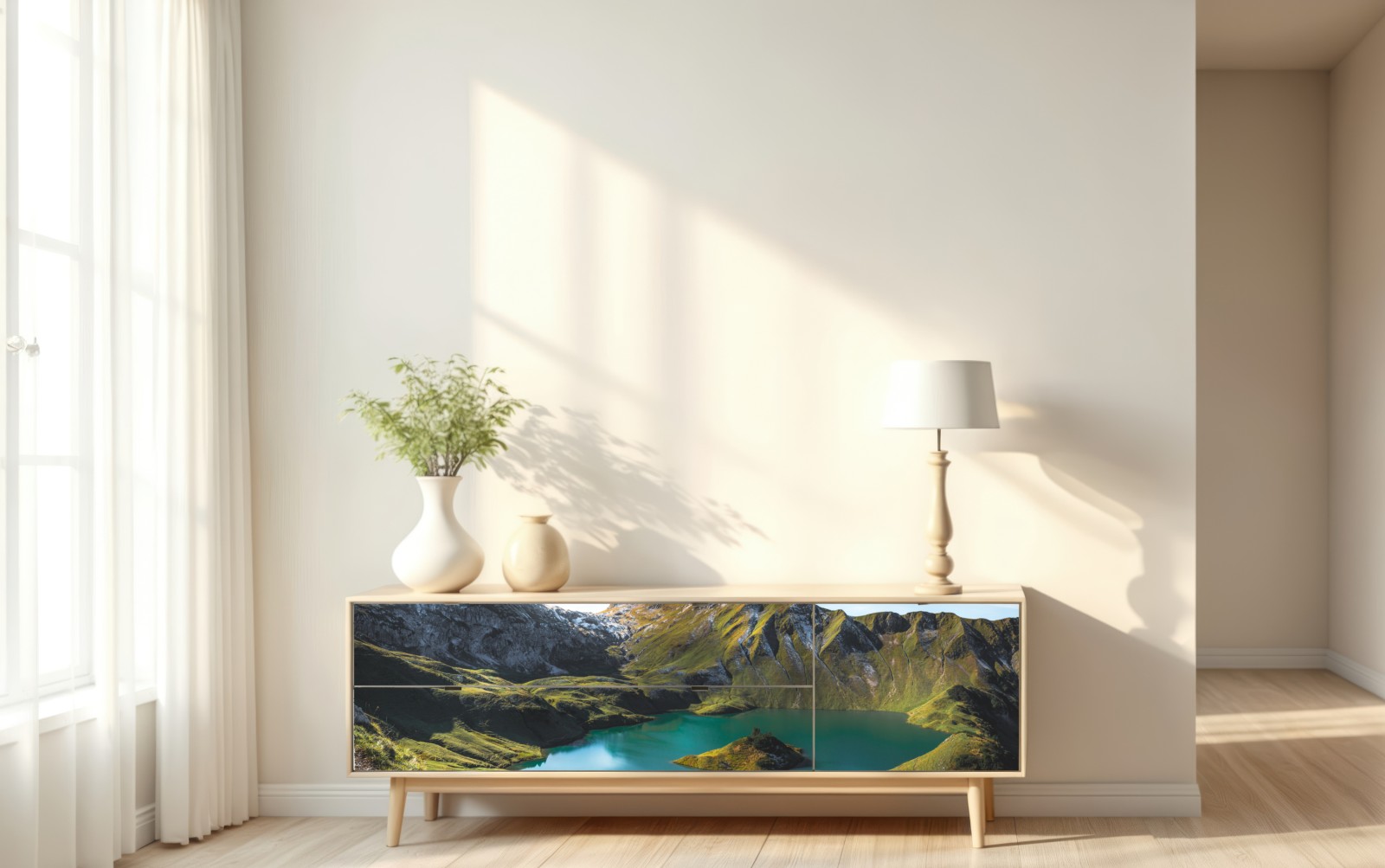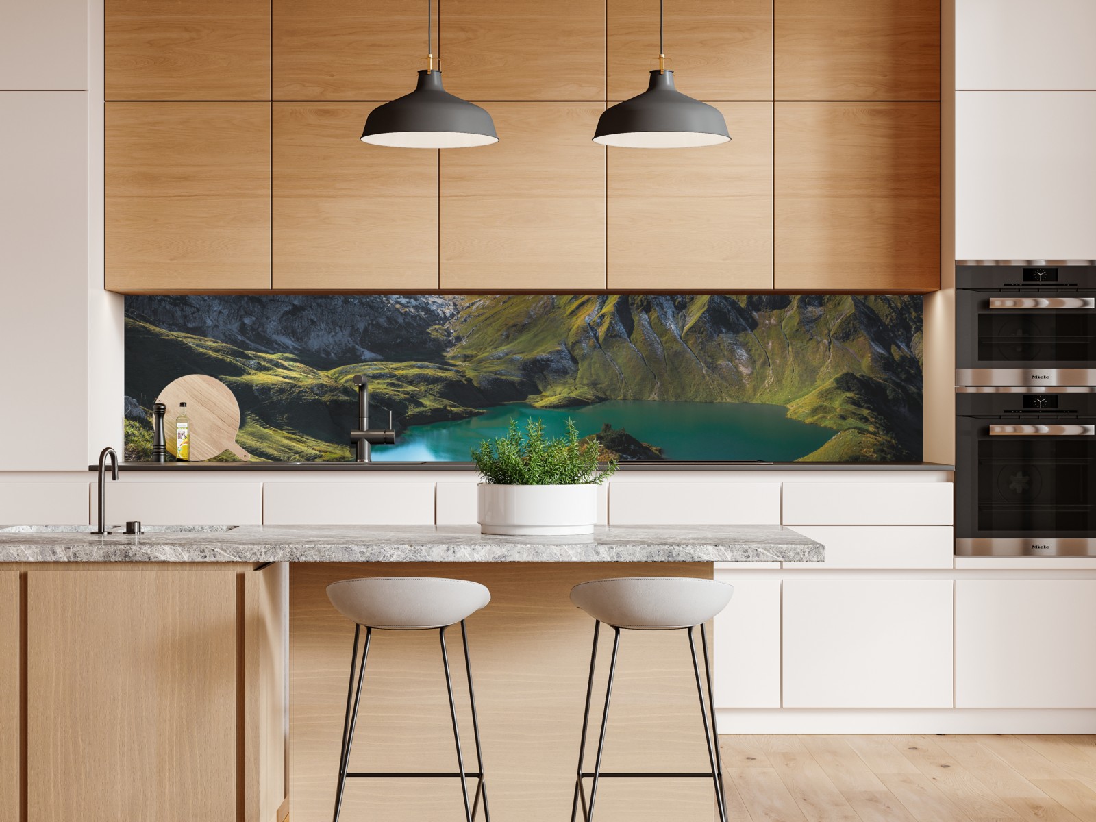 Bringen Sie alpine Ruhe in Ihr Zuhause mit diesem Panorama des türkisfarbenen Bergsees und der Insel am Schrecksee; perfekt für Naturfreunde und moderne Wohnräume.
